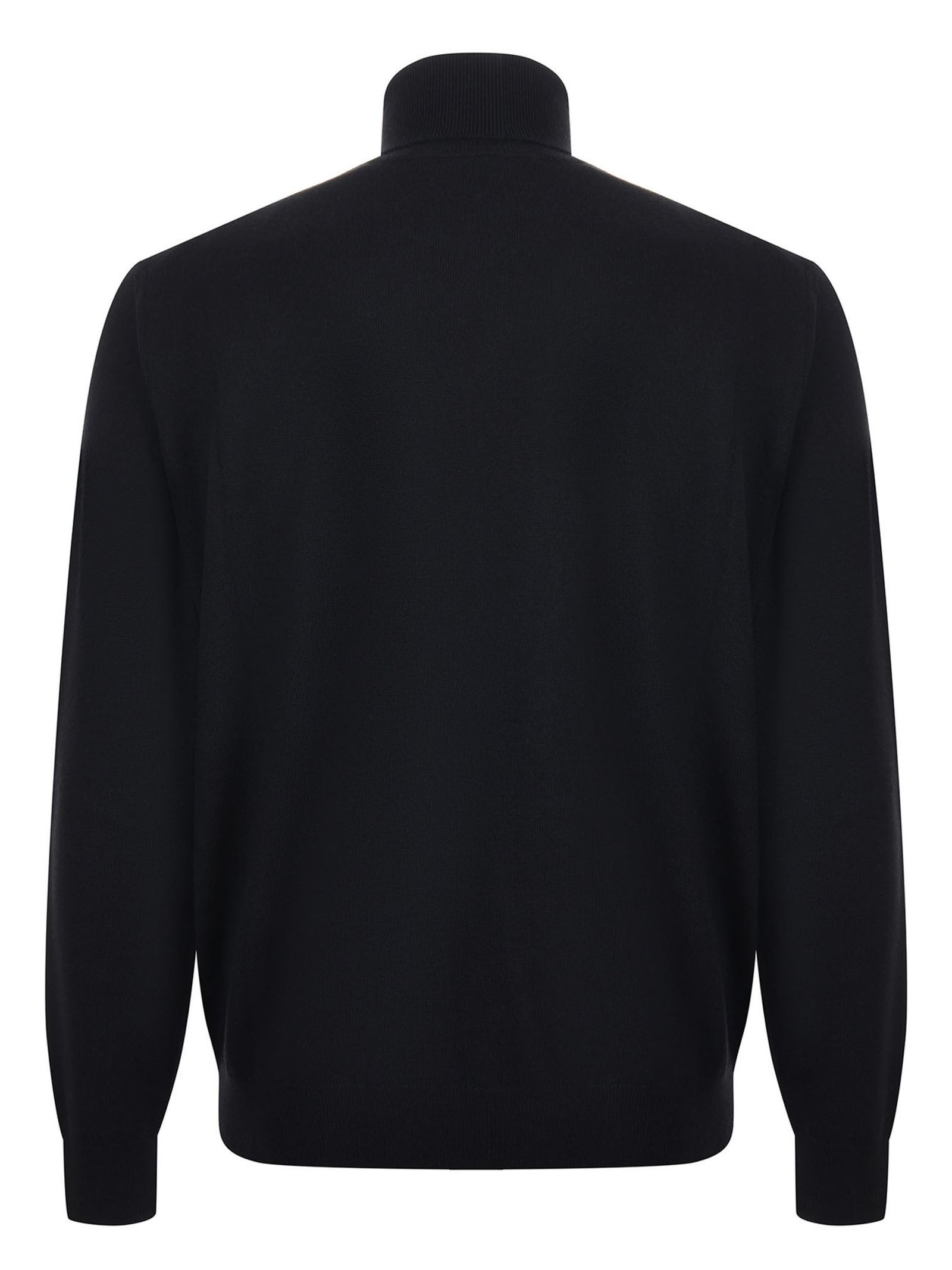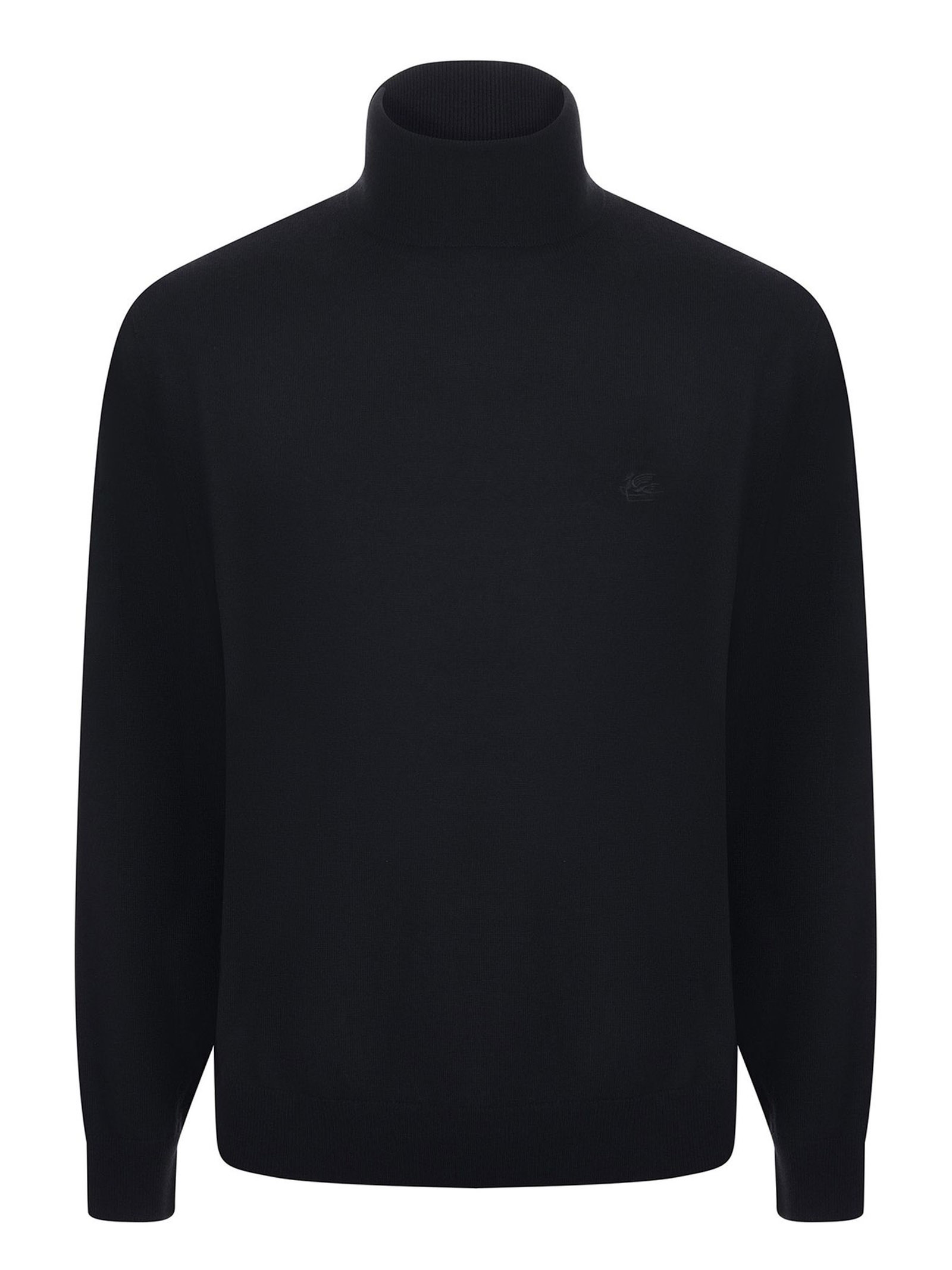 Lightweight wool turtleneck jumper in black, high collar with lapel, long sleeves, ribbed cuffs and hem, tone-on-tone embroidered logo on the front, regular fit
