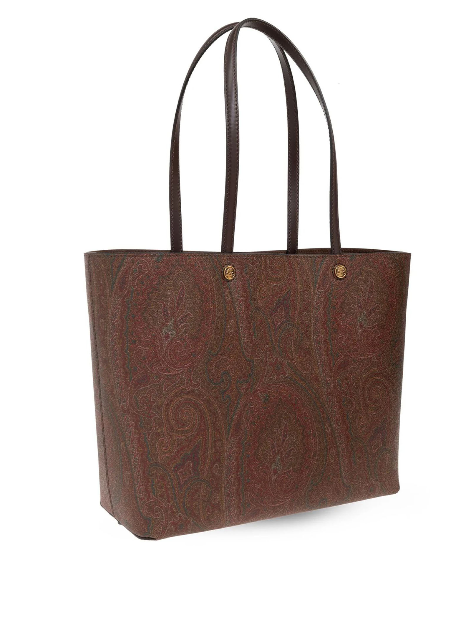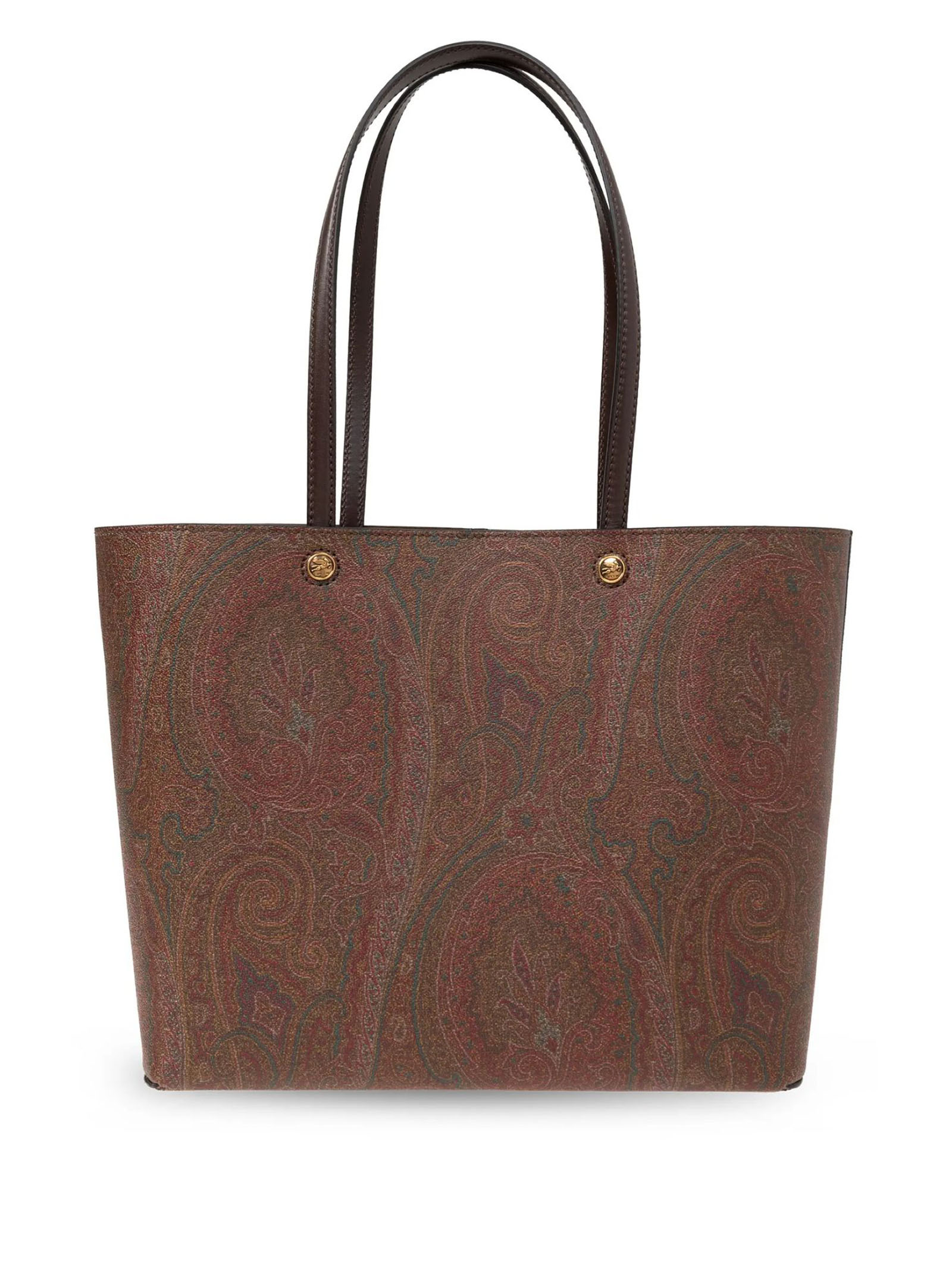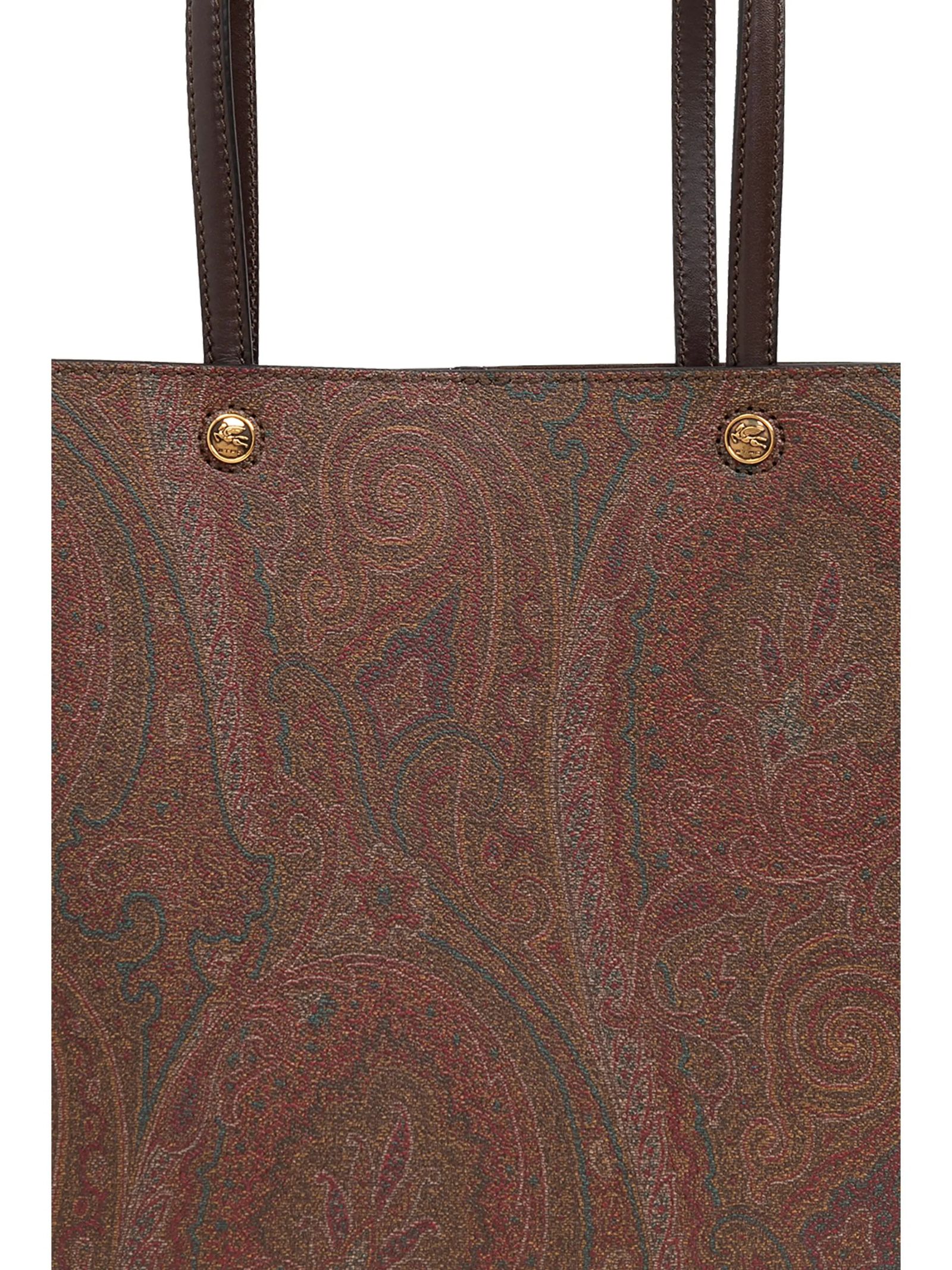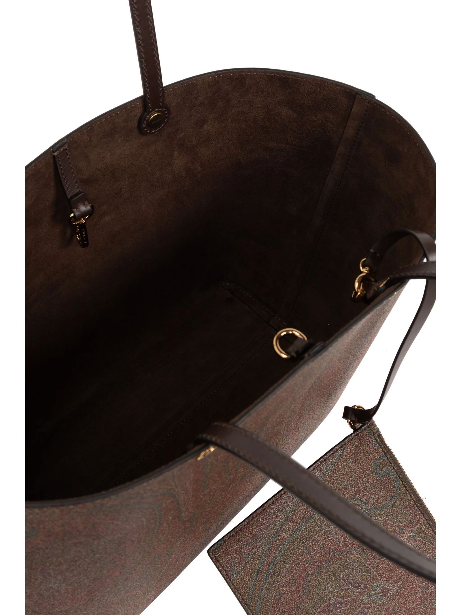 Medium ETRO Essential tote bag in iconic Paisley jacquard fabric, with leather details and lining, Clasp closure, Two handles, Metal feet, Golden-finish metal accessories, Removable mini pouch, Dimensions (Width, Height, Depth): 13 x 11 x 5.5 inches (33 x 28 x 14 cm)