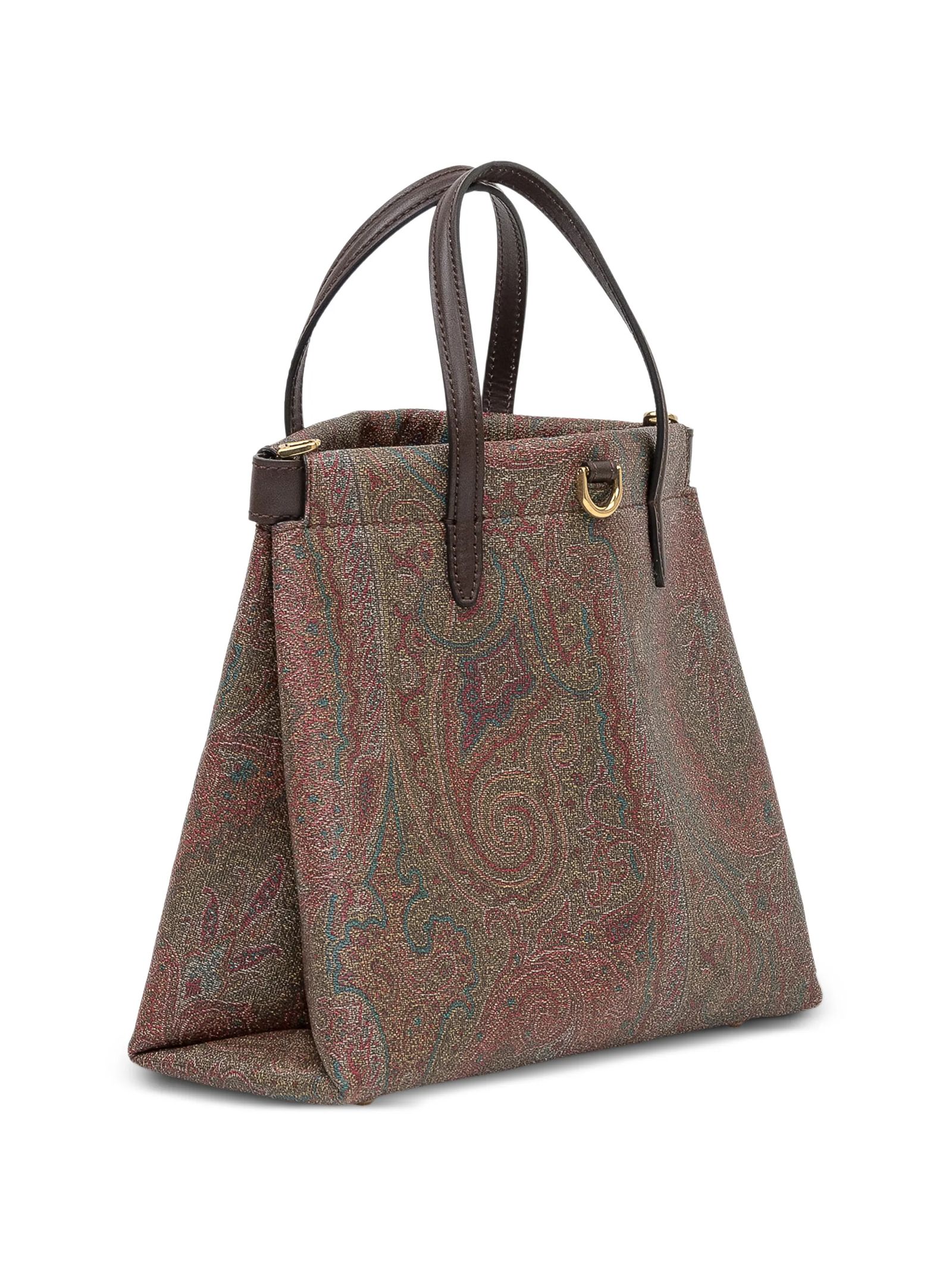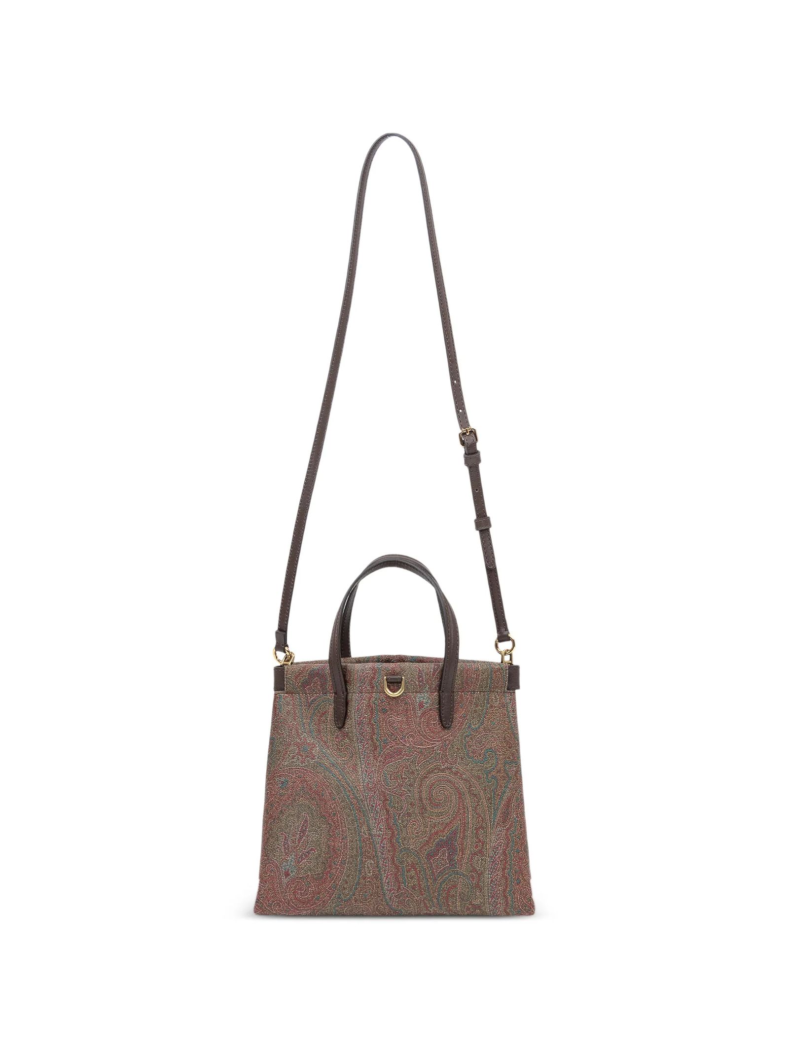 Tote bag crafted from the iconic Paisley jacquard fabric, featuring handles, a removable shoulder strap, gold-tone hardware, and a D-ring detail. Dimensions: Width 23 cm, Height 22 cm, Depth 12 cm