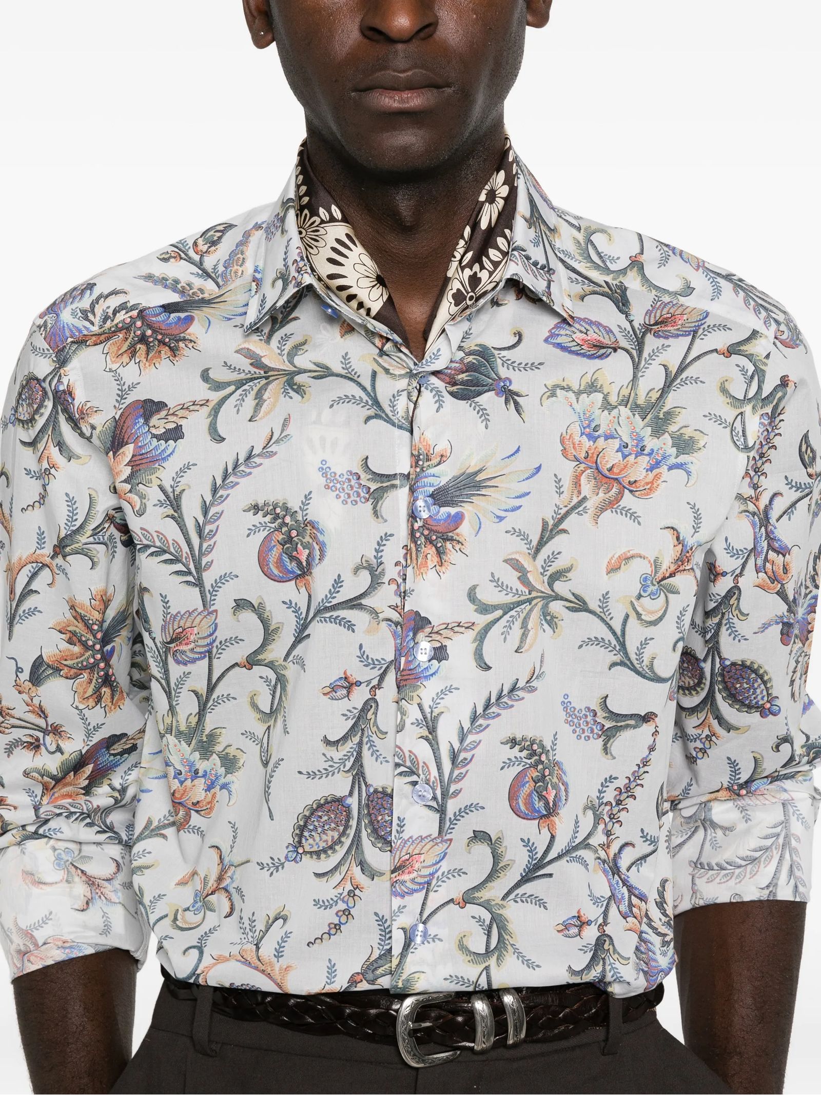 White cotton floral shirt with button closure, long sleeves, buttoned cuffs, and a classic collar