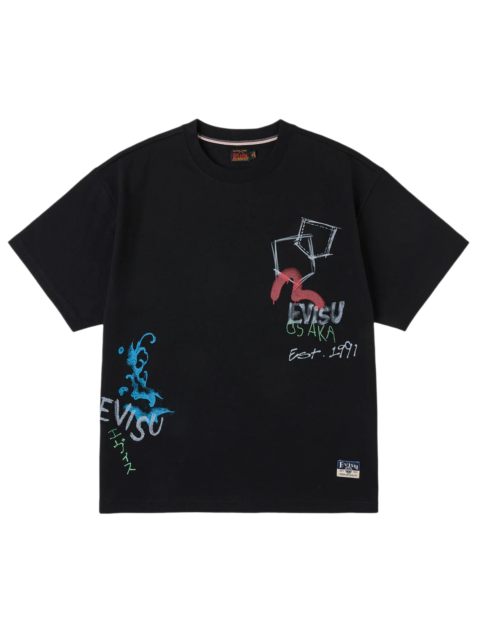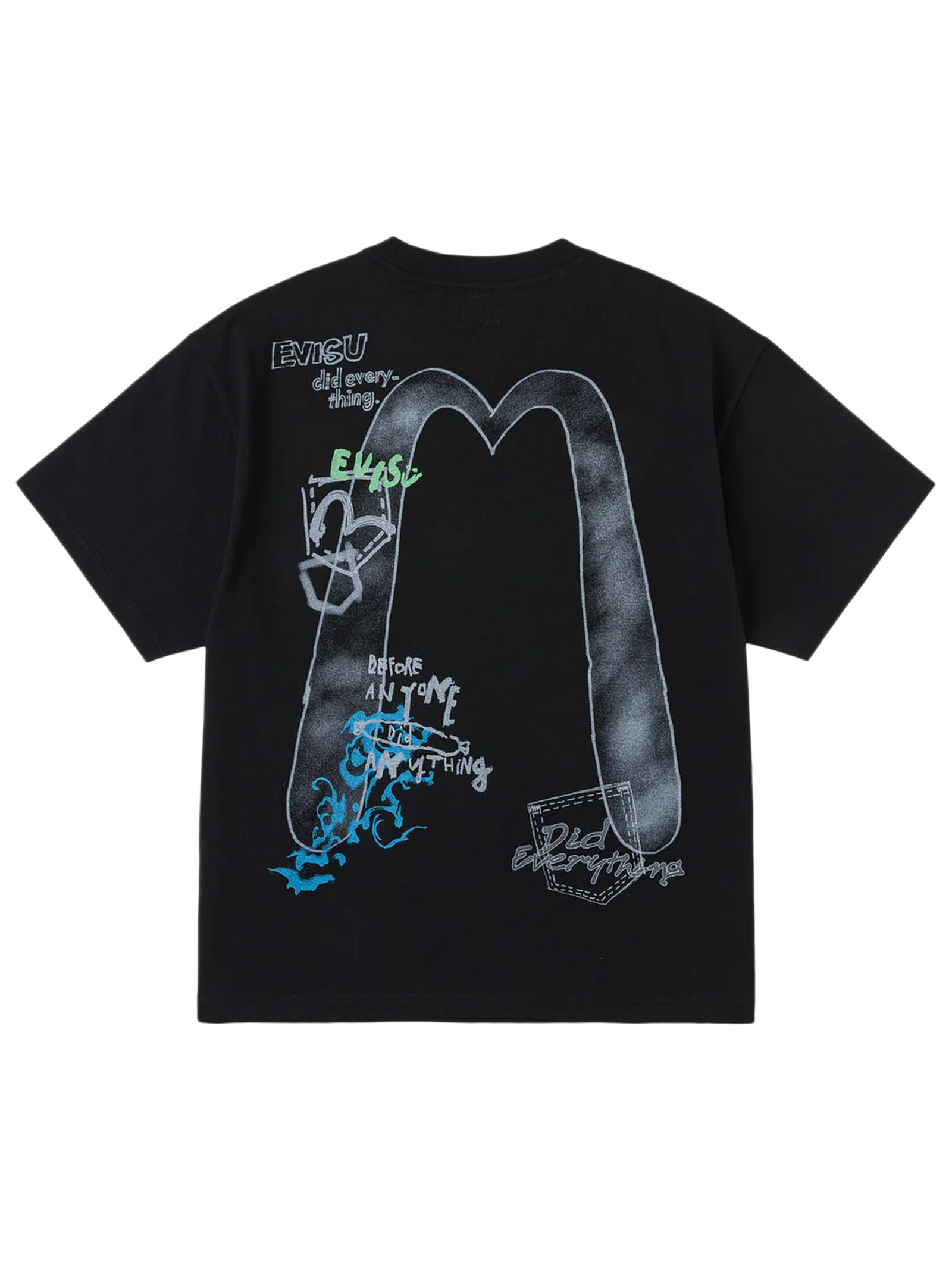 Hand-drawn Daicock and Multi-pocket Graffiti T-shirt, Relax fit, 100% Cotton, Hand-drawn Daicock and multi-pocket graphic print, "EVISU did everything" slogans, Ribbed crew neck, short sleeves