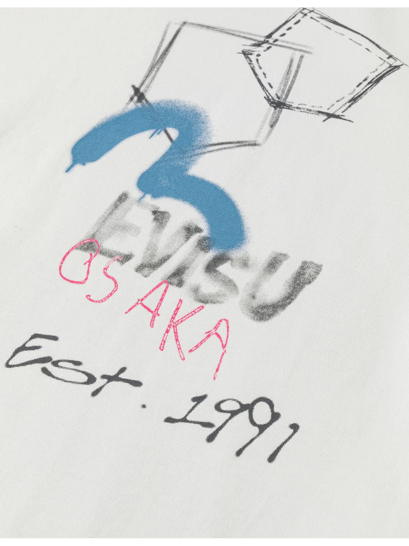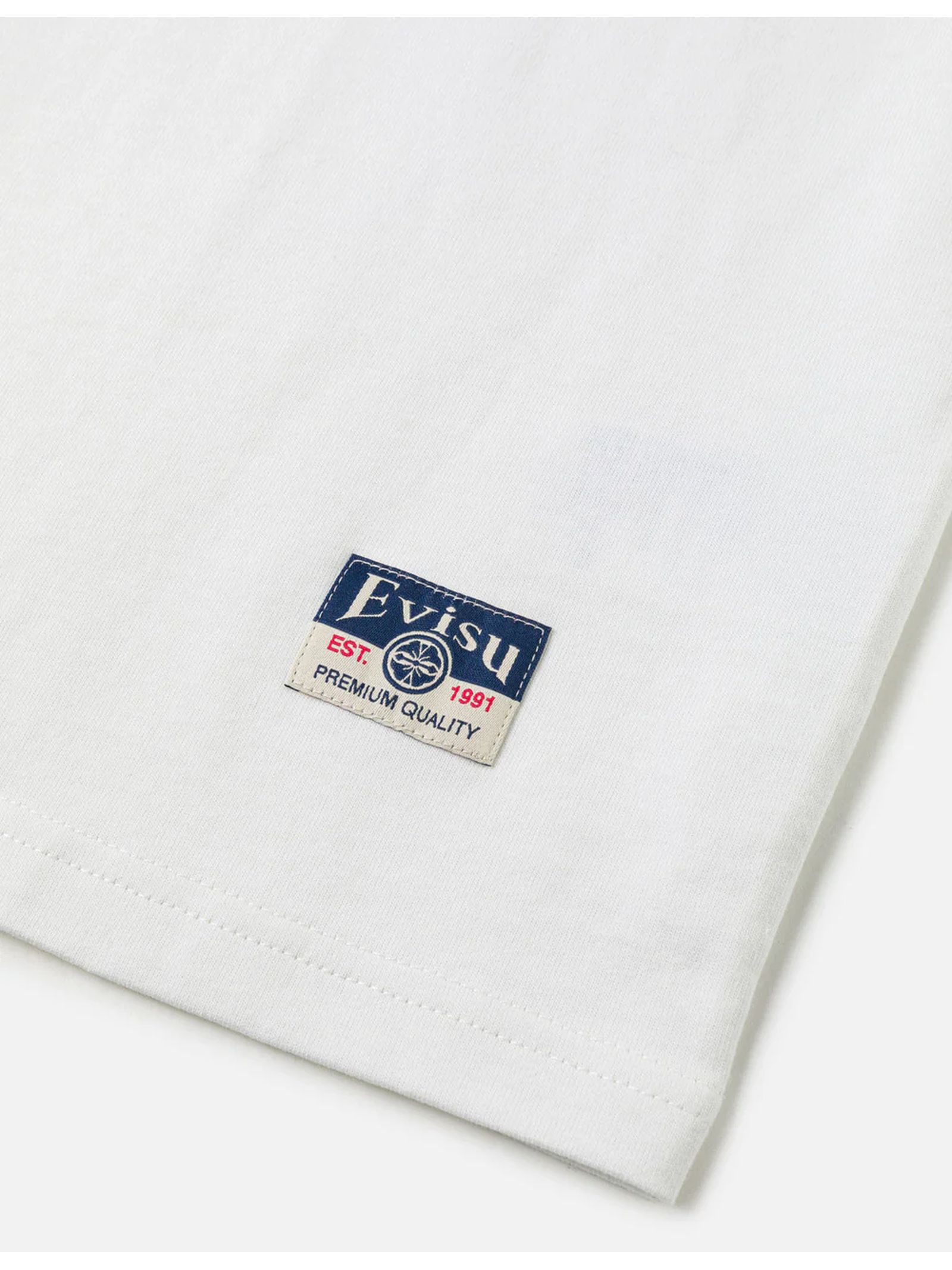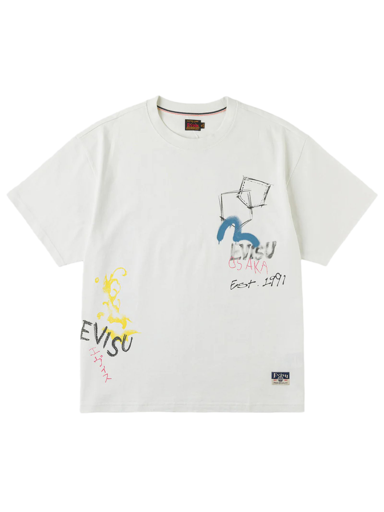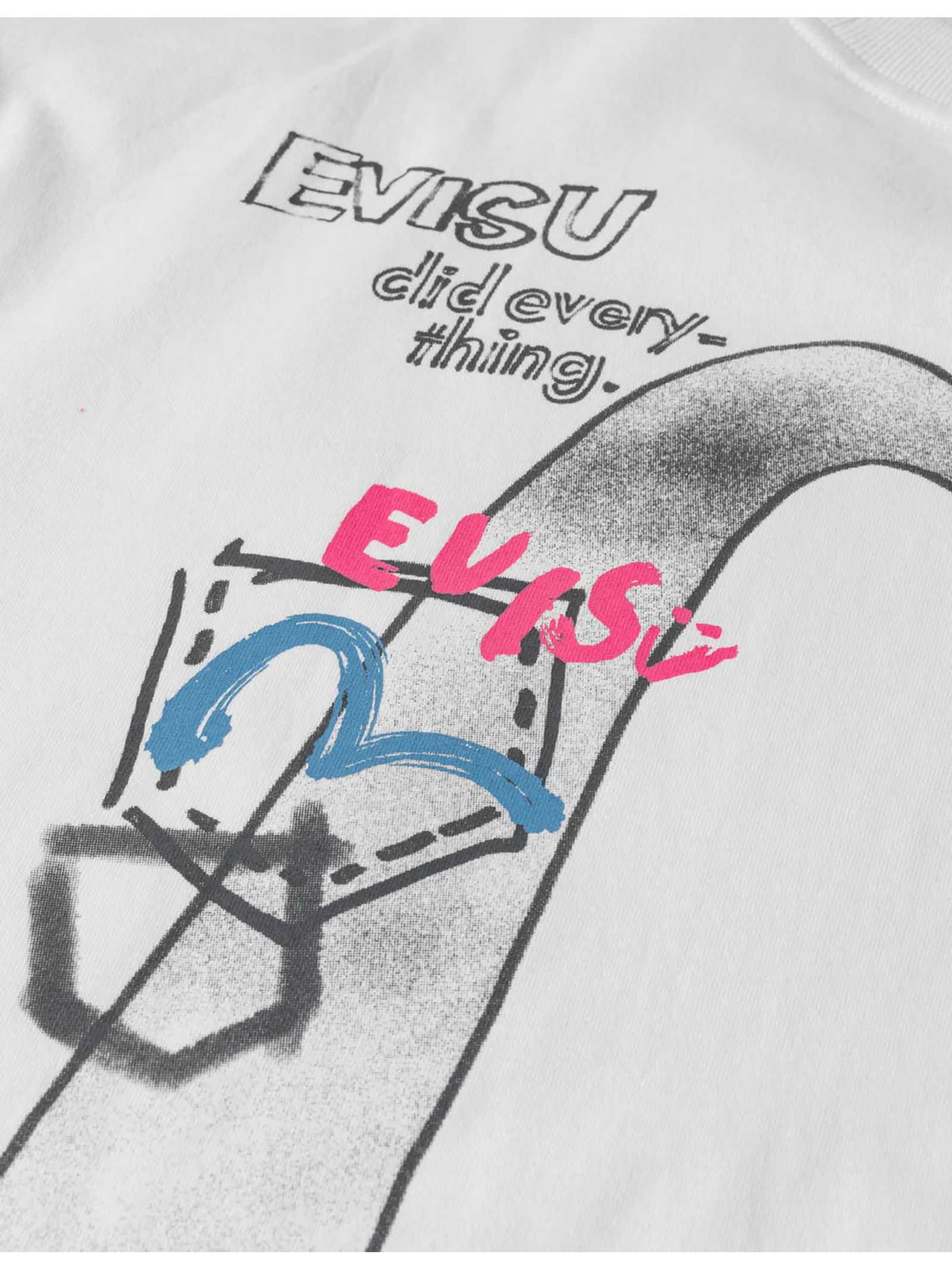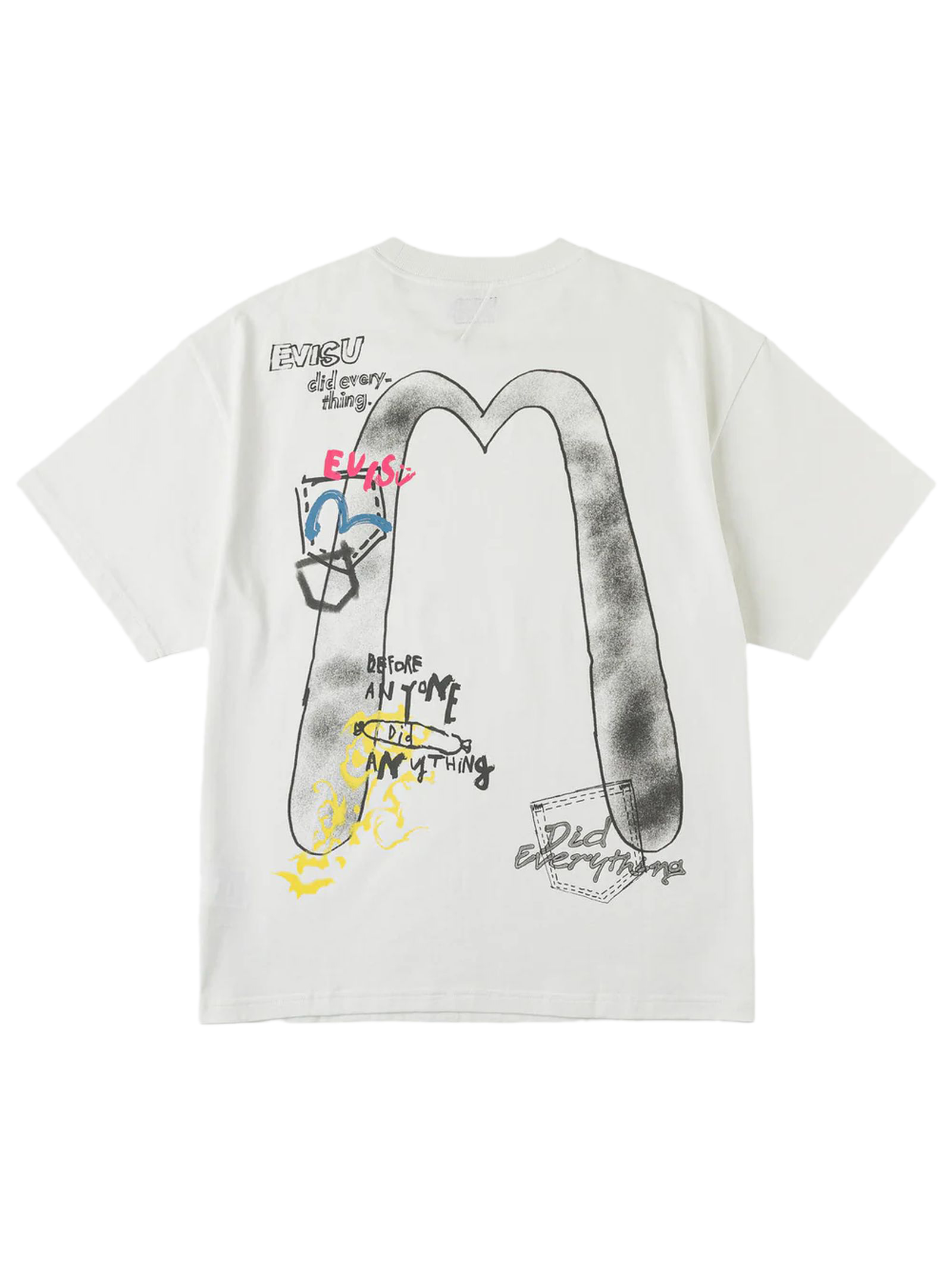 Hand-drawn Daicock and Multi-pocket Graffiti T-shirt, Relax fit, 100% Cotton, Hand-drawn Daicock and multi-pocket graphic print, "EVISU did everything" slogans, Ribbed crew neck, short sleeves