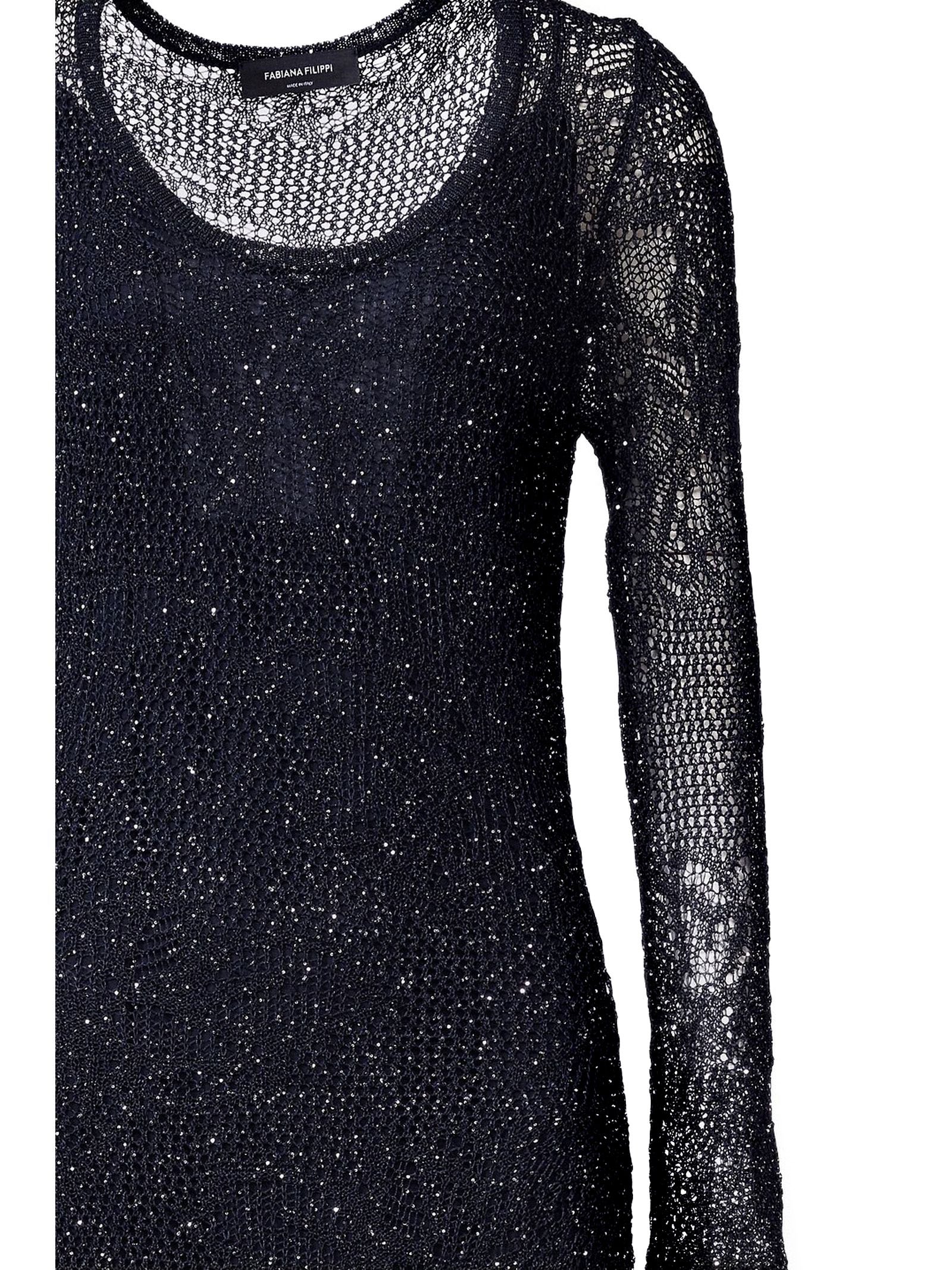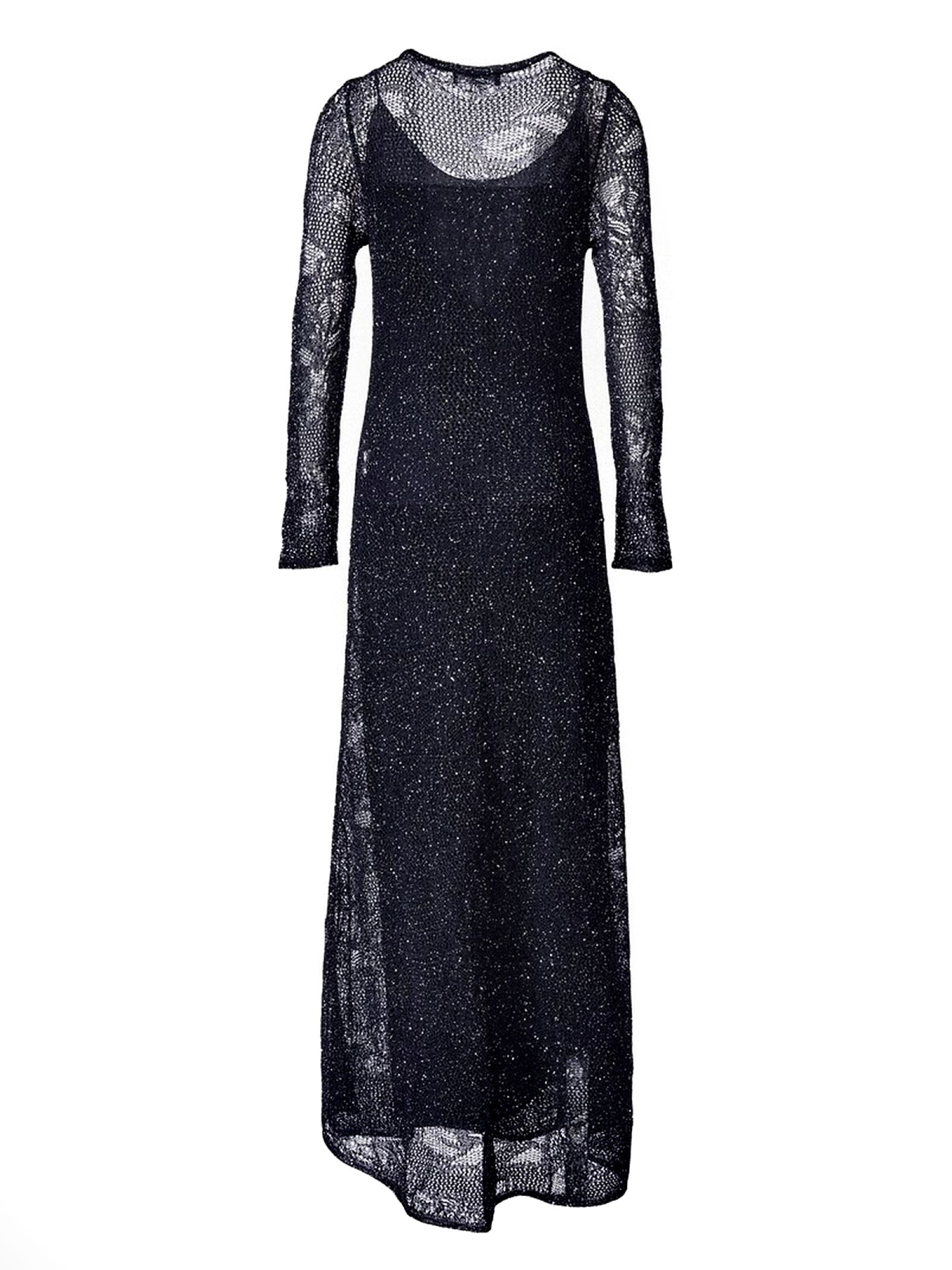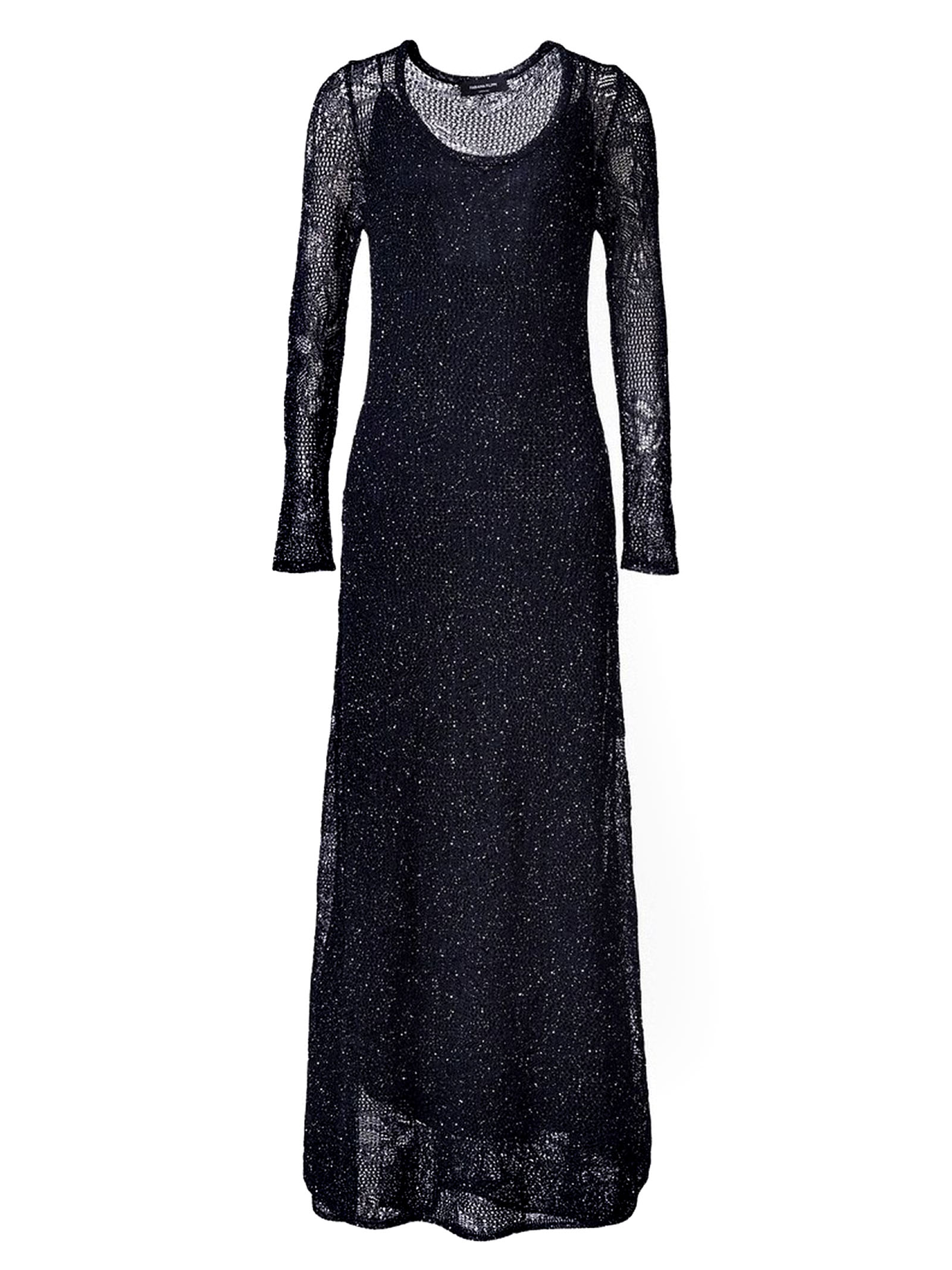 Blue crochet long dress with lurex filaments, close-fitting silhouette with round neckline, long sleeves