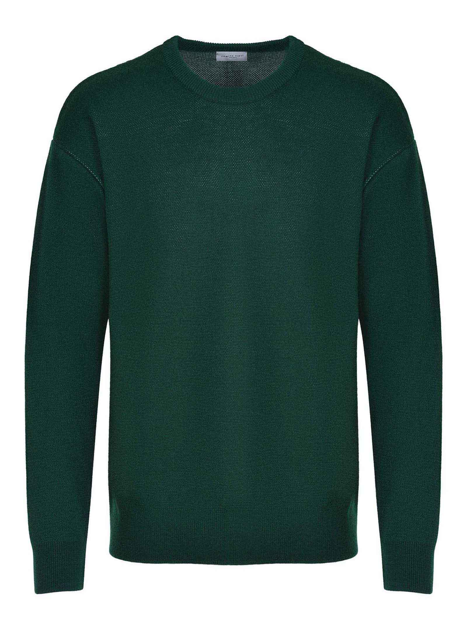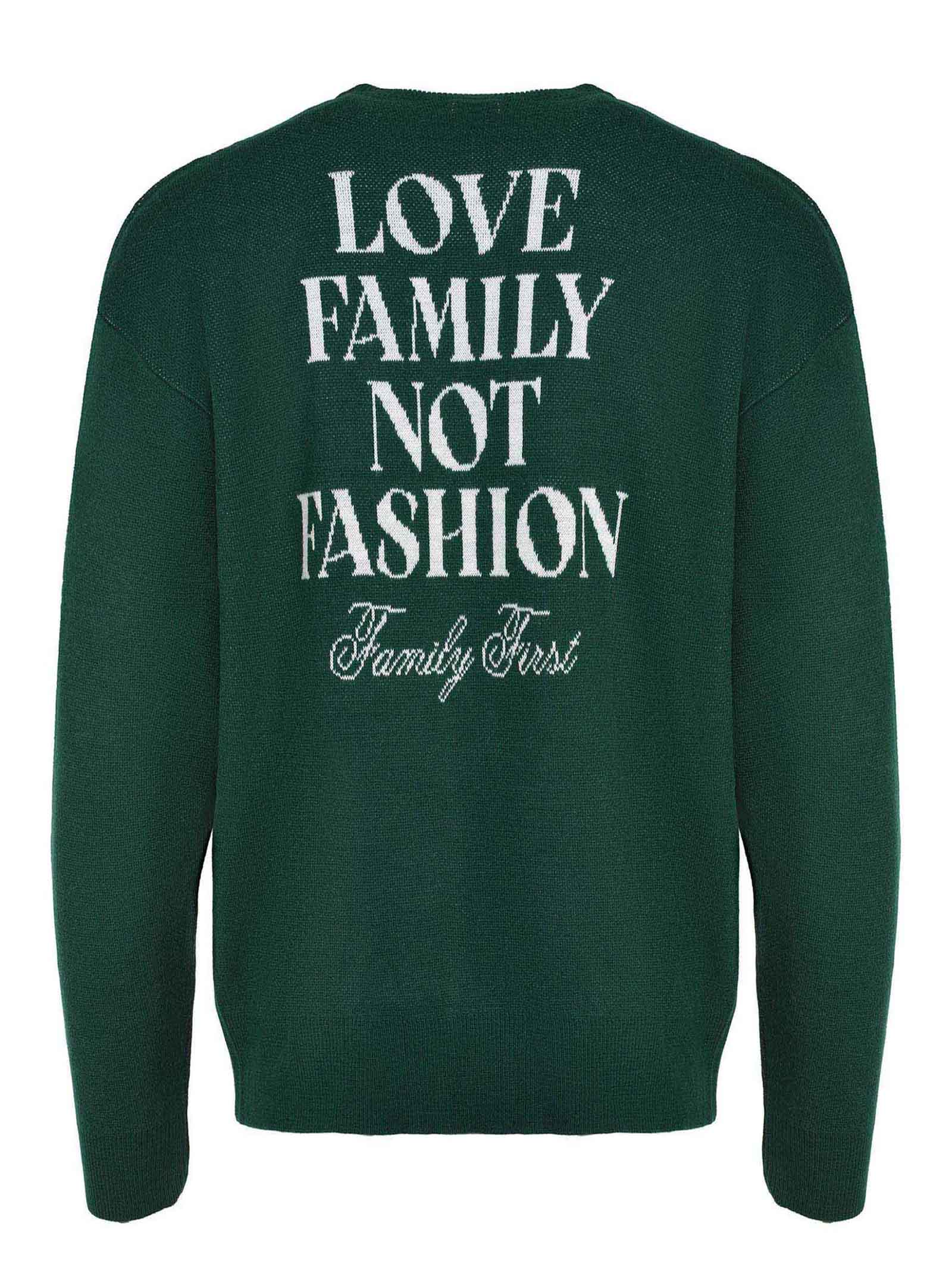Green wool blend sweater, ribbed crew neck, long sleeves, ribbed cuffs and hem, large contrasting lettering and logo on the back