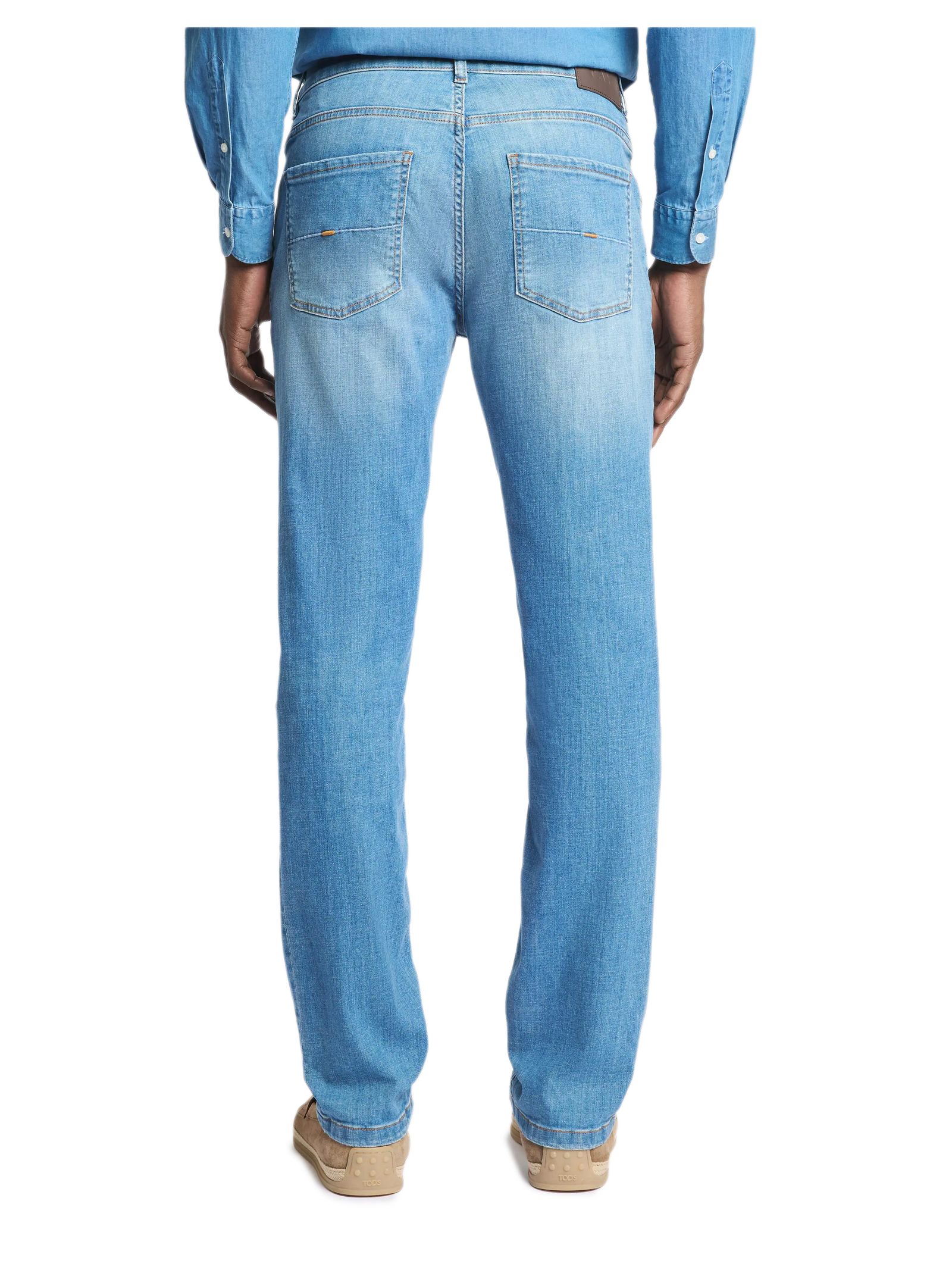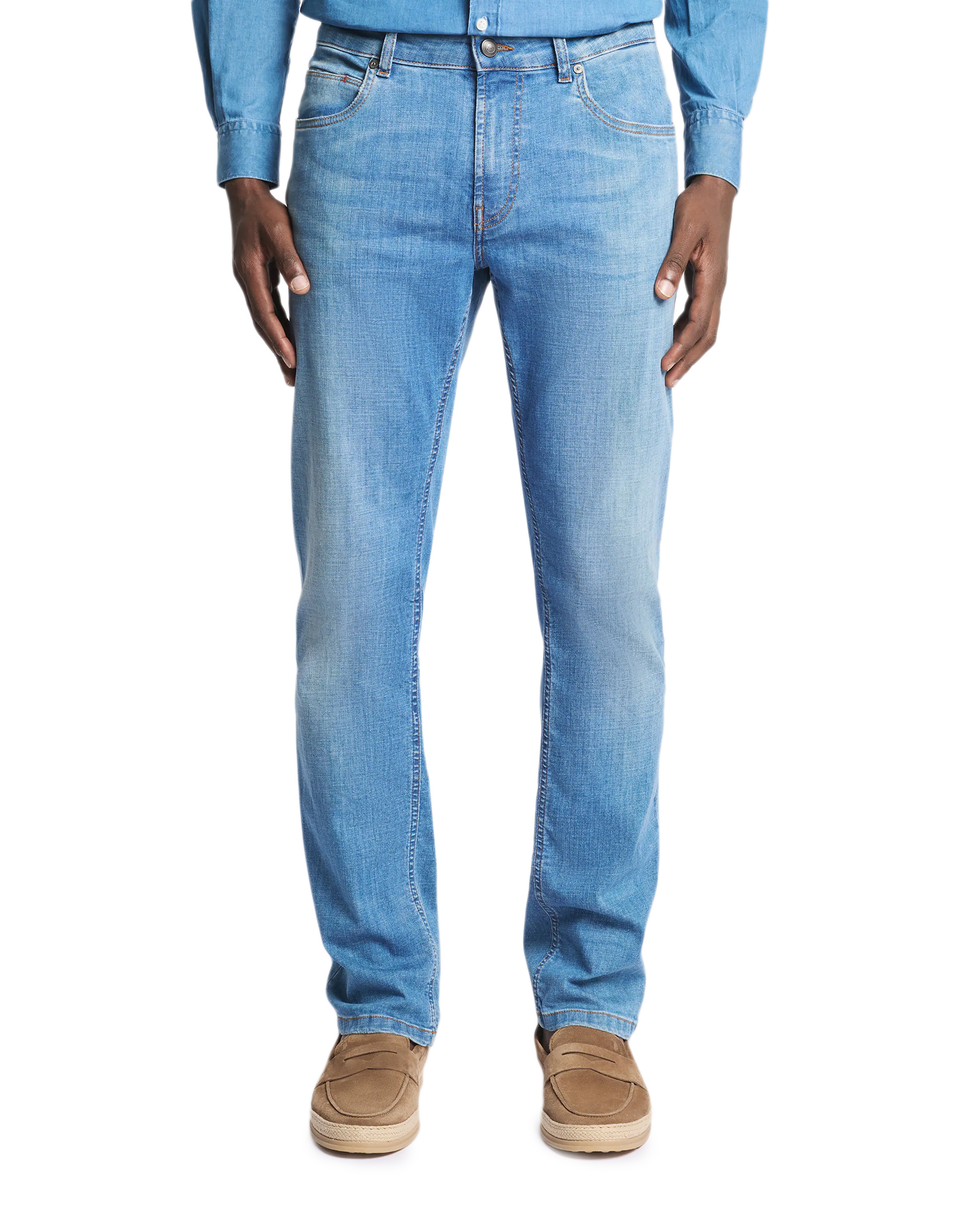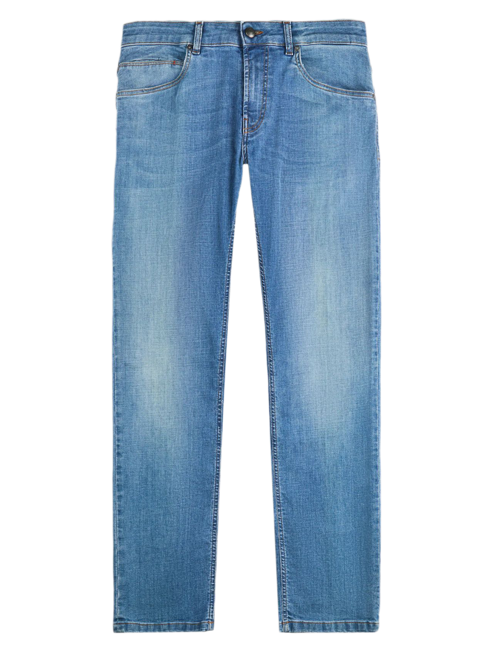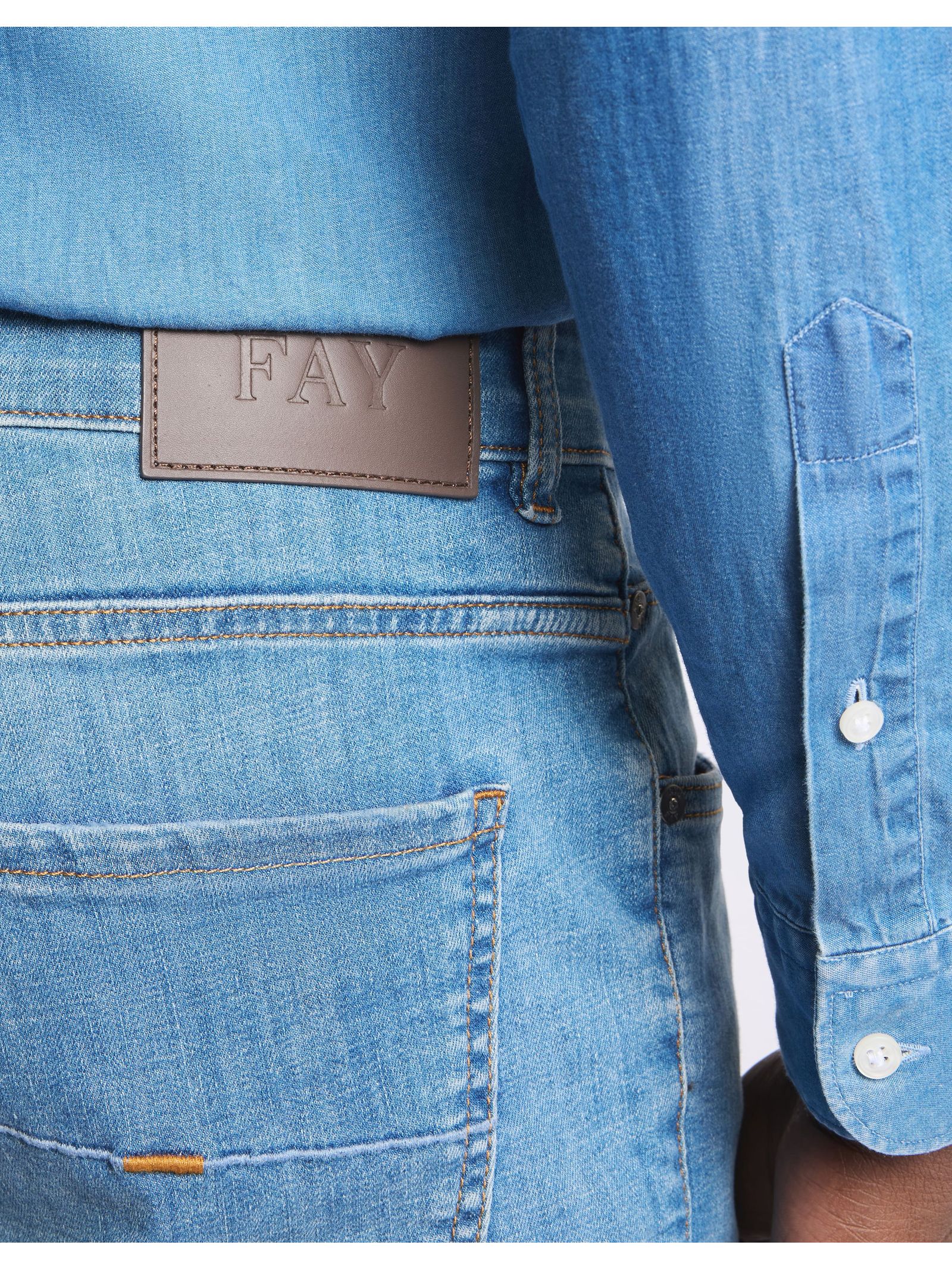 Slim-fit 5-pocket jeans in slightly stretch denim, with the leather Fay tag on the back, Characterized by the distinctive front pockets with rivets, coin pocket and patch back pockets, they feature a zip and stud button fastening