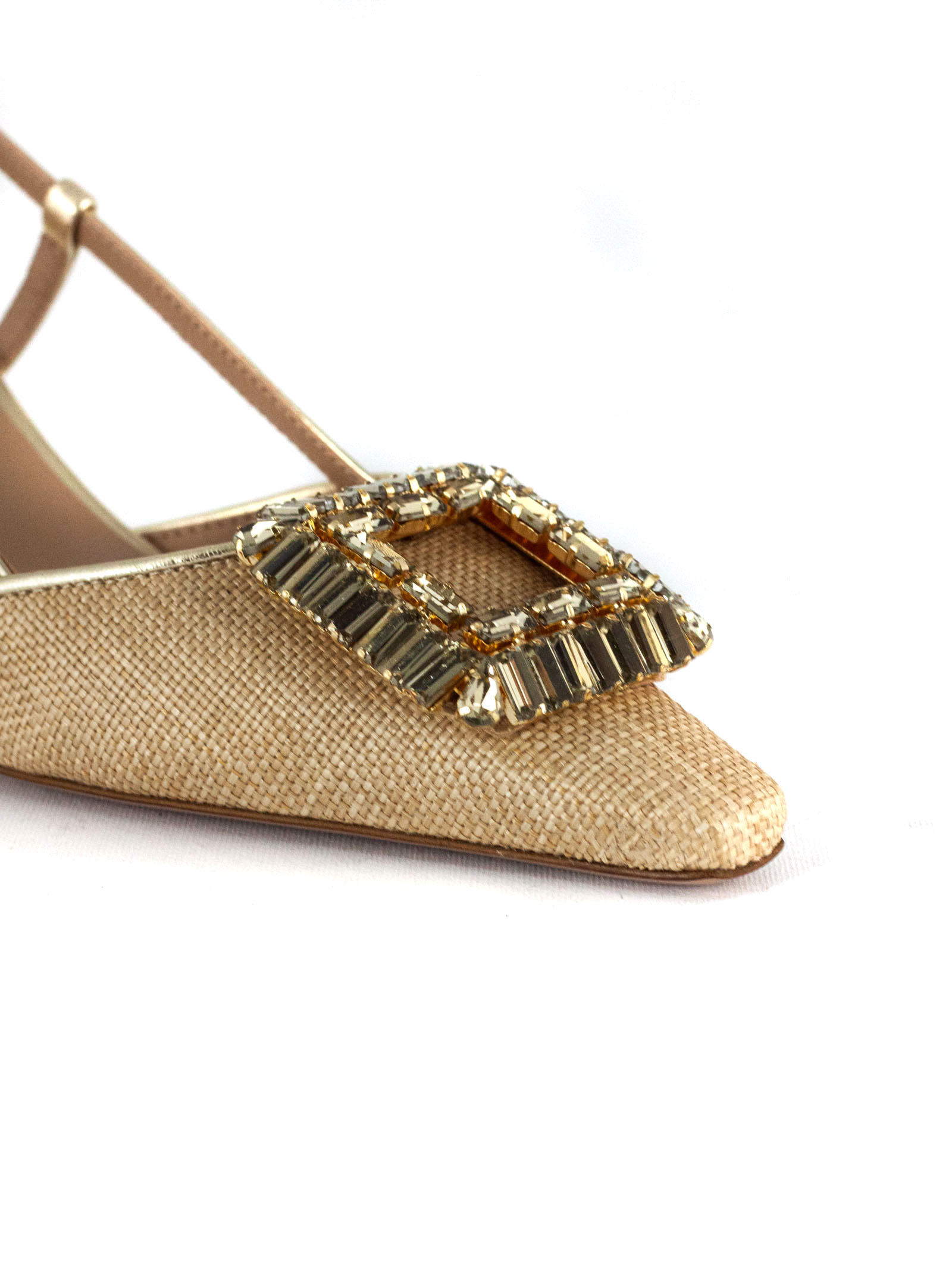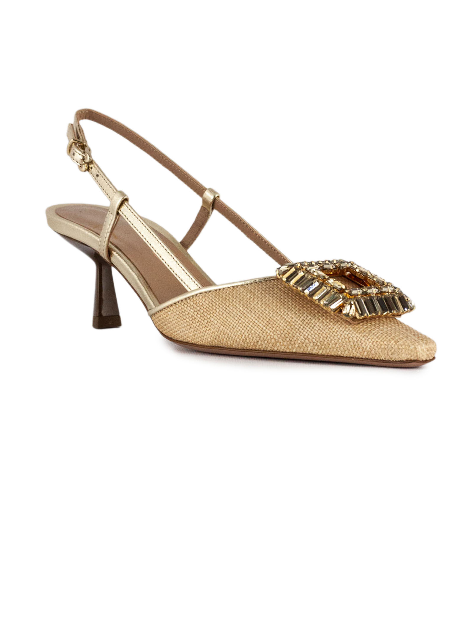 Julien slingback pumps in linen-effect fabric, tapered toe, jewelled detail, platinum metallic strap, adjustable strap fastening, 4 cm medium heel