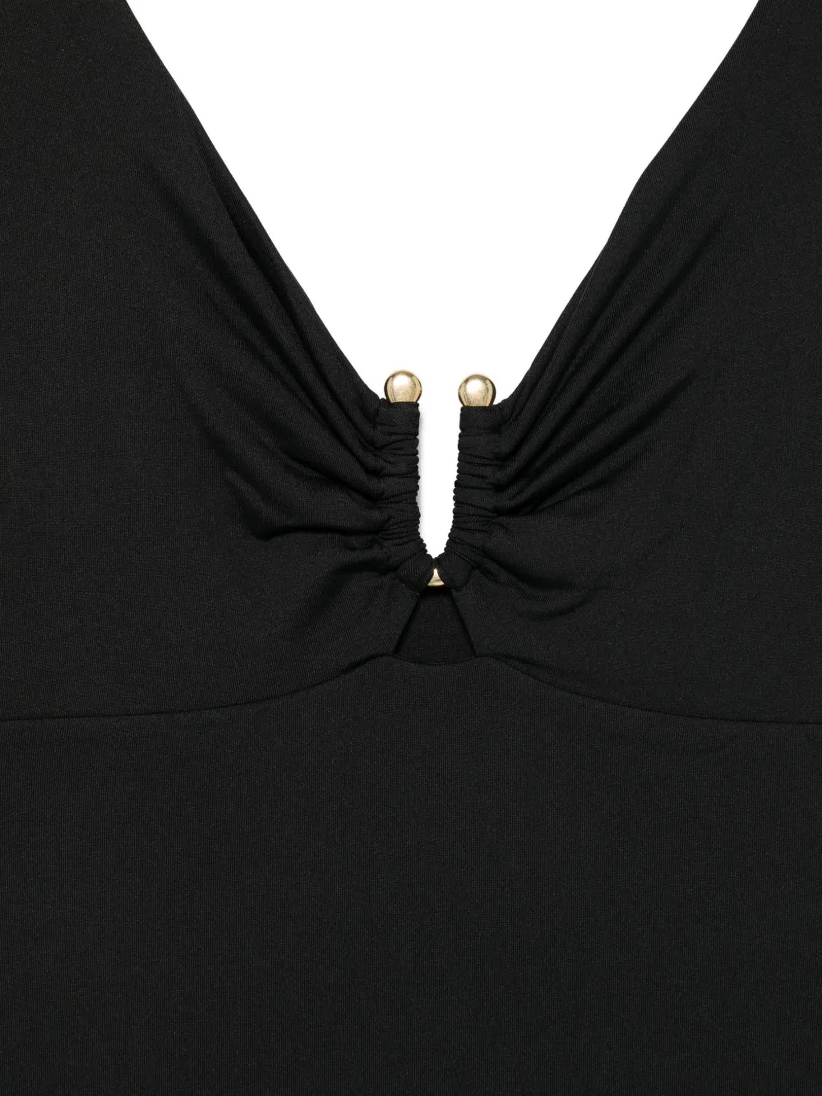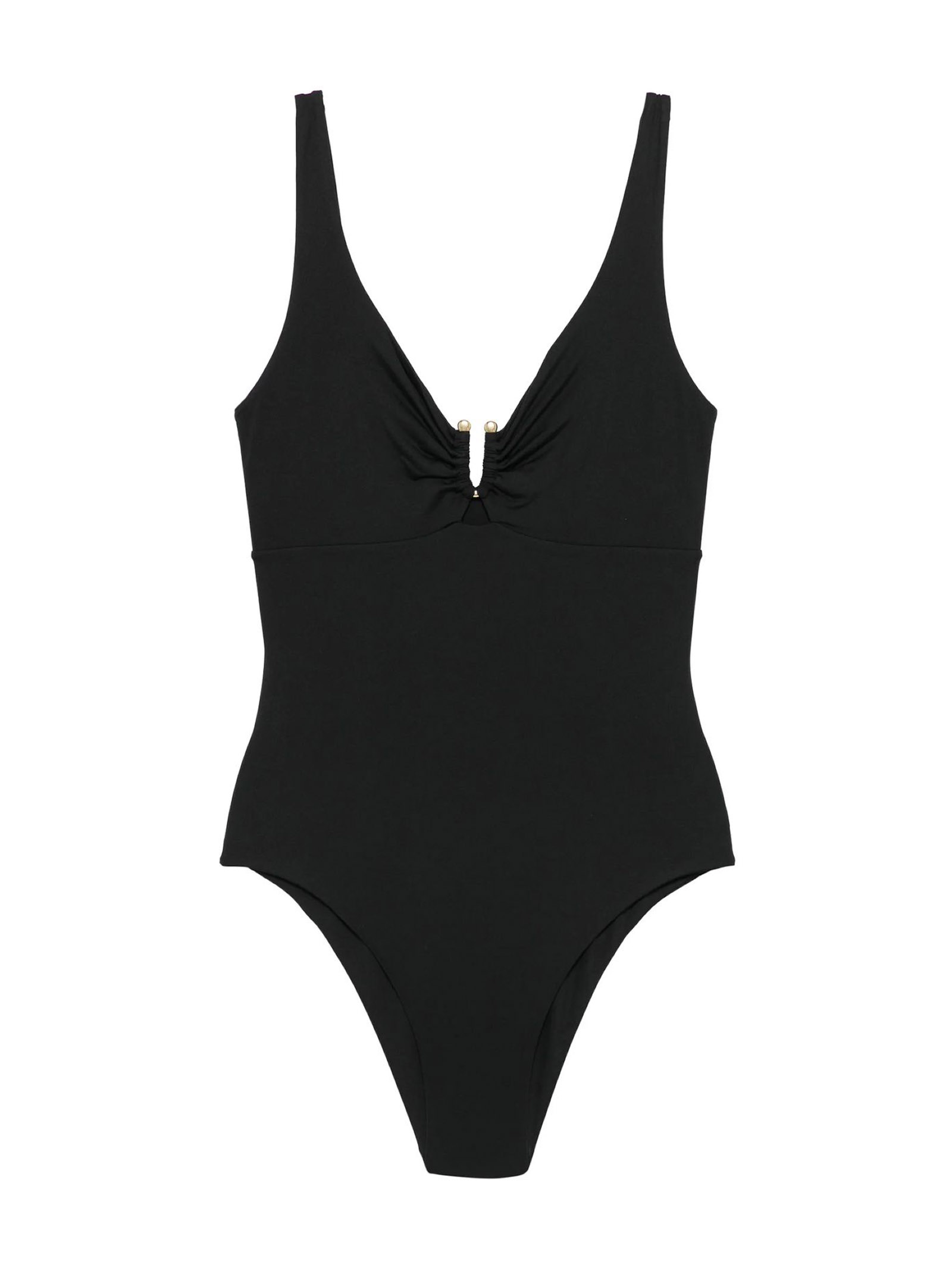 Black microfiber one-piece with wide straps and a chest cut-out, accented by a U-shaped buckle at the décolleté.