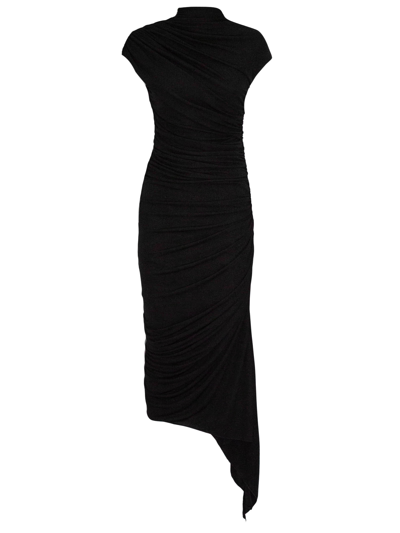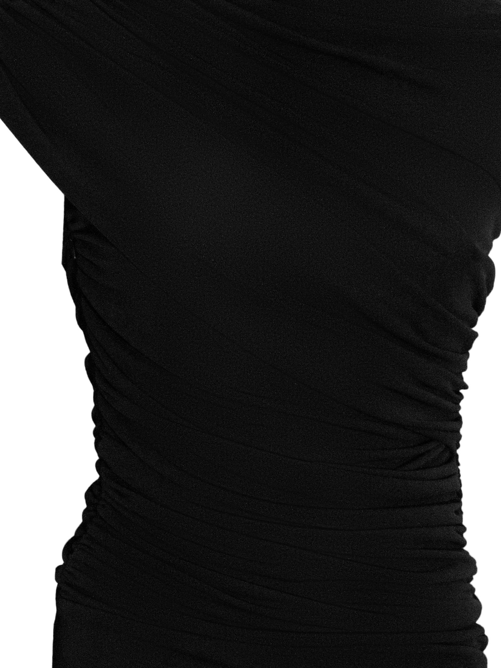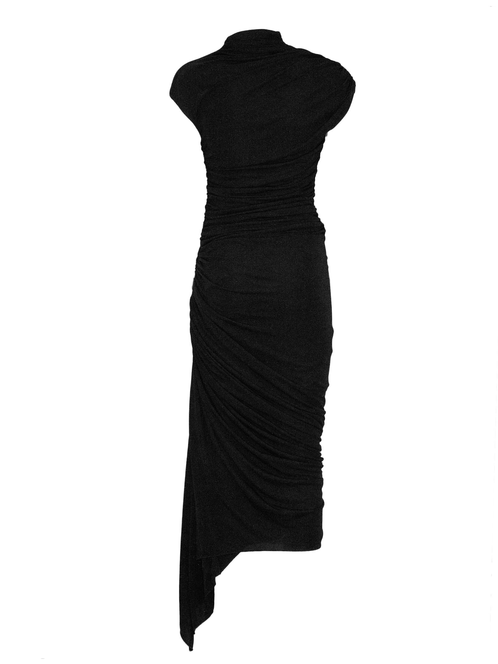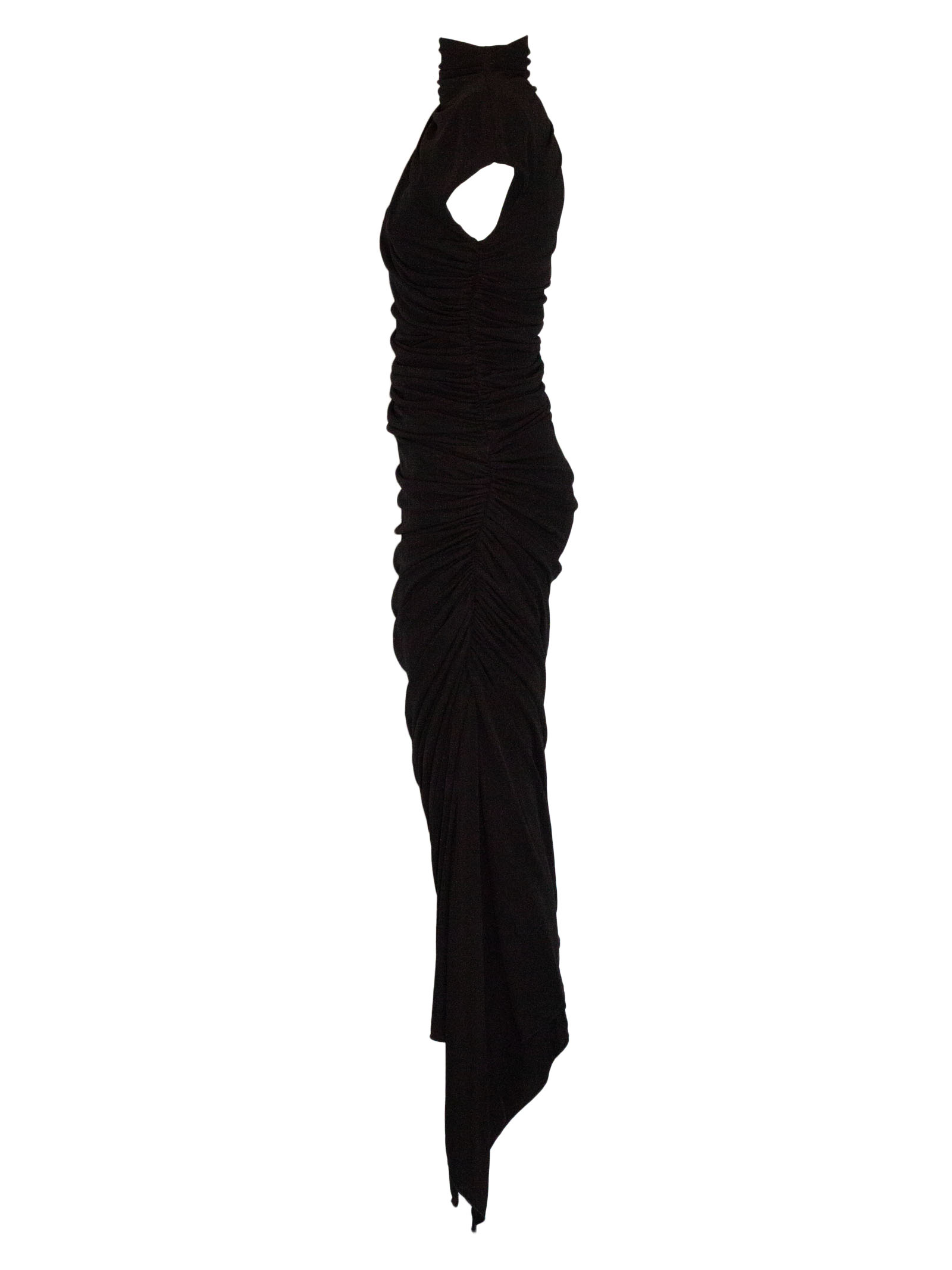 Long black viscose dress, high neck with zip, sleeveless, concealed zip fastening, draped detail