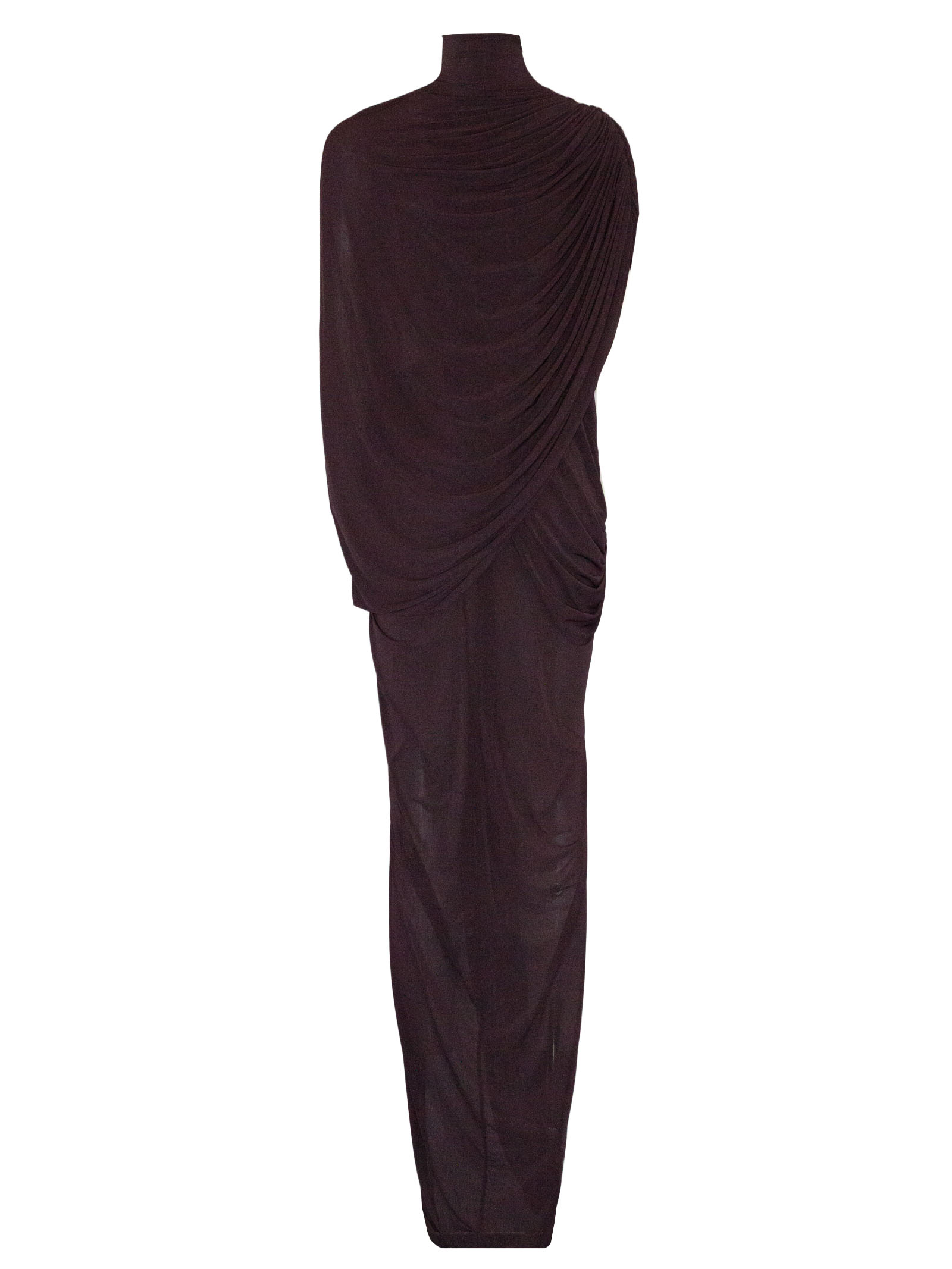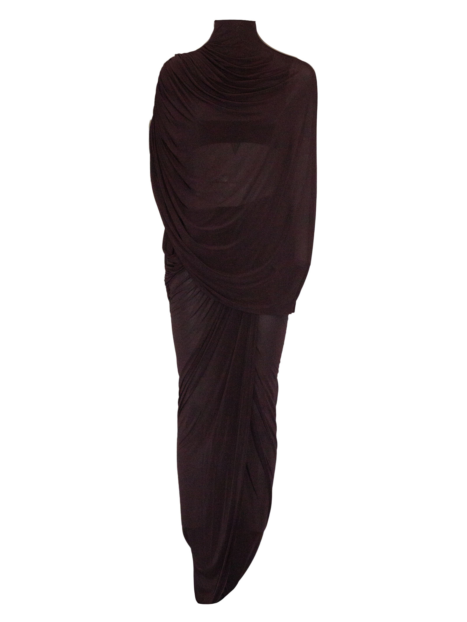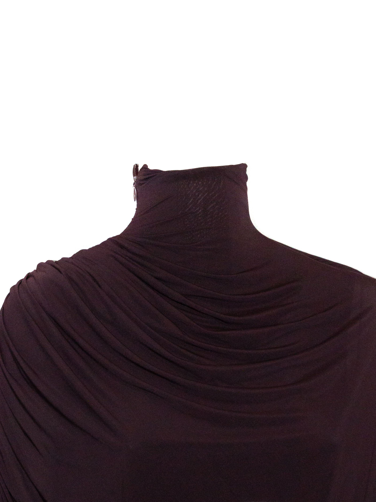 Long brown viscose dress, high neck with zip, sleeveless, cape, draped detail