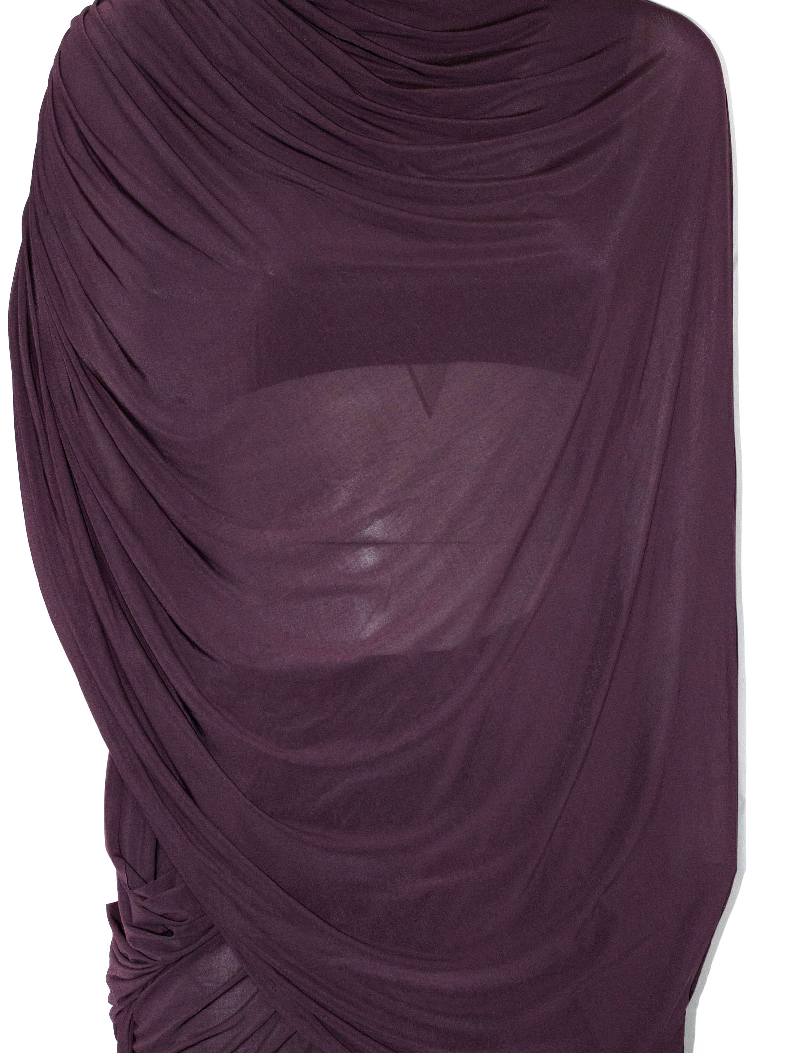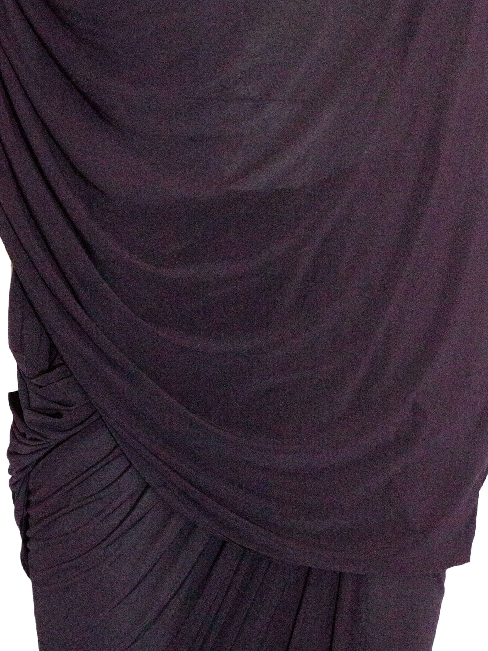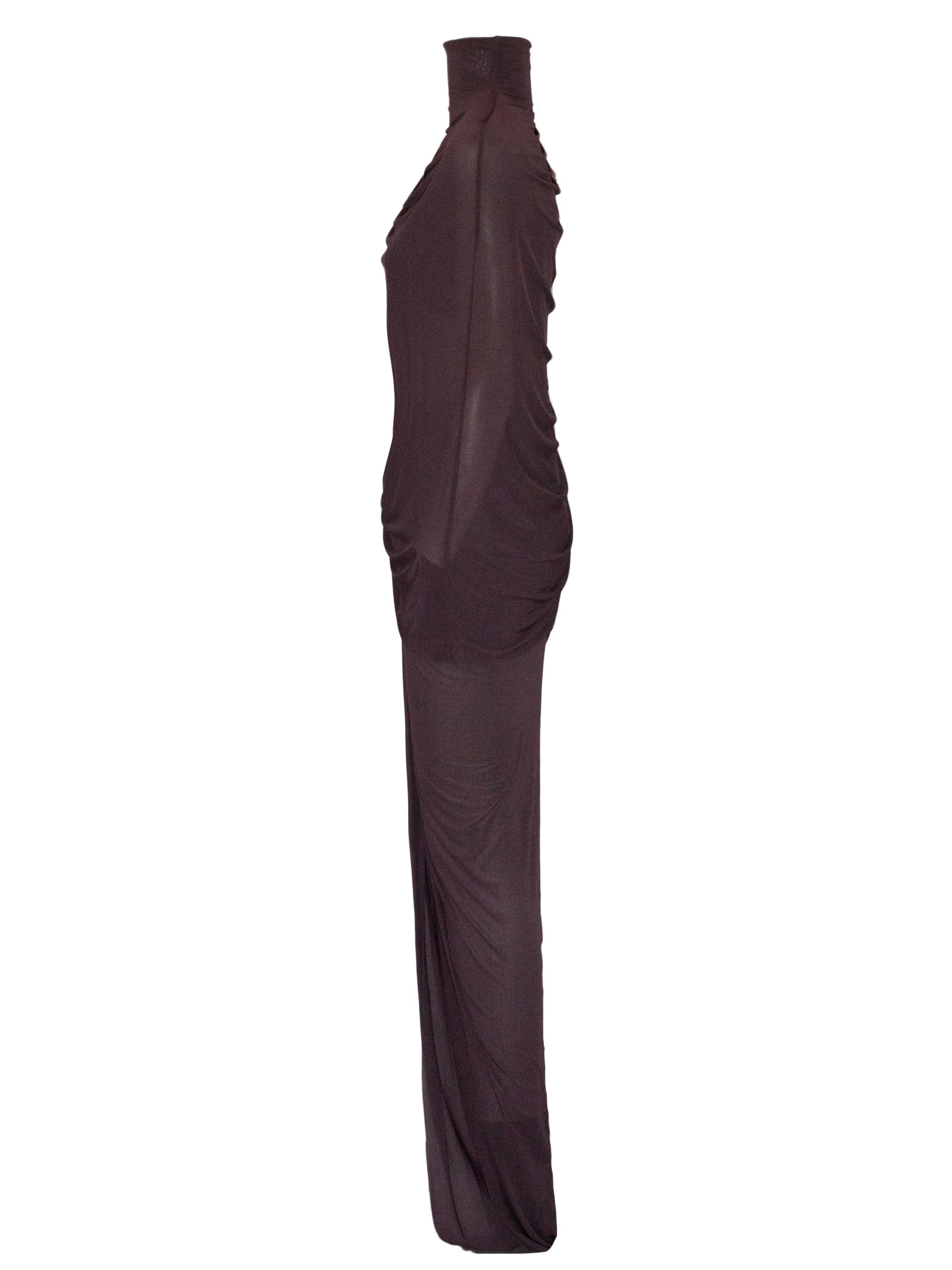 Long brown viscose dress, high neck with zip, sleeveless, cape, draped detail