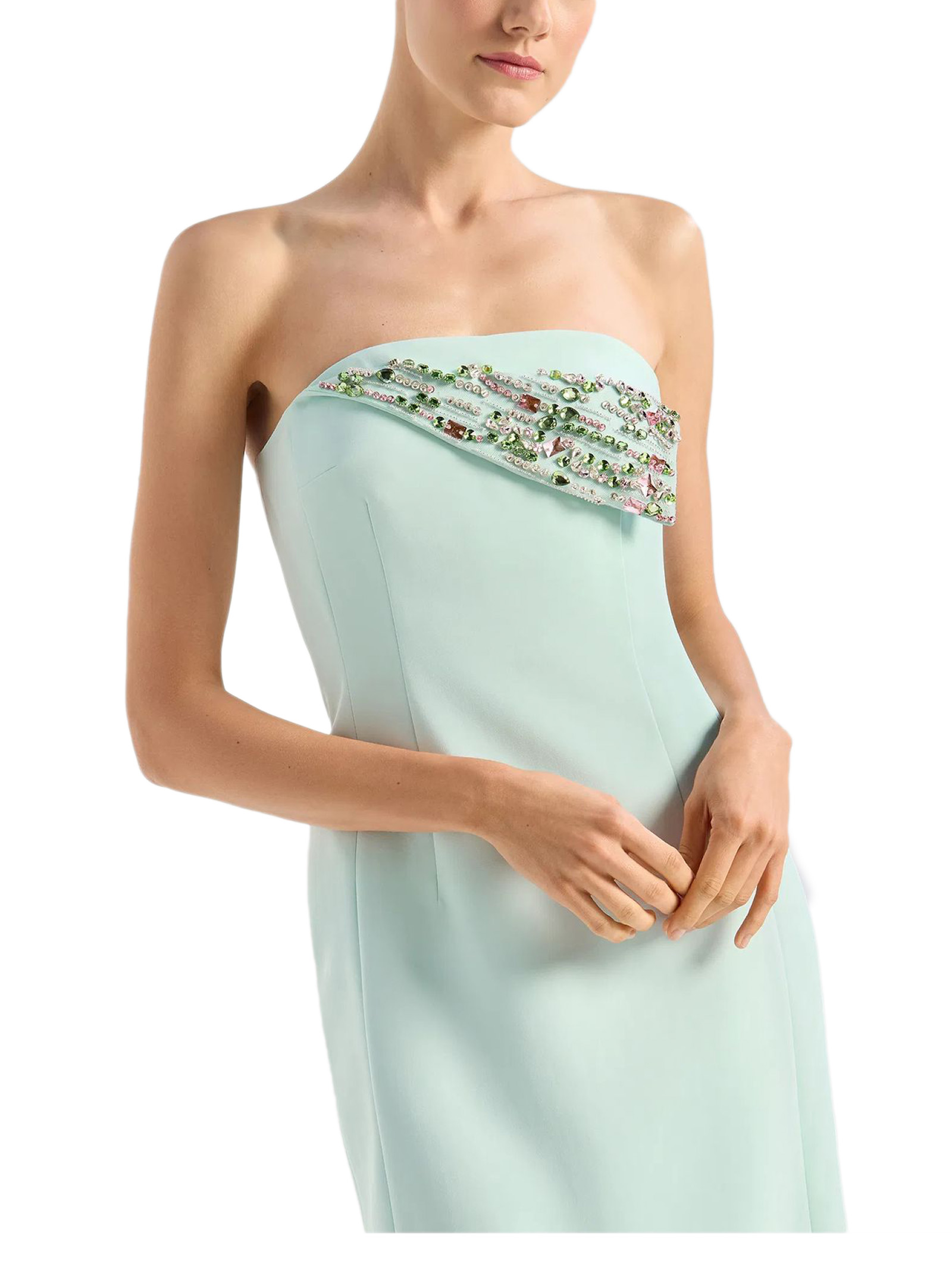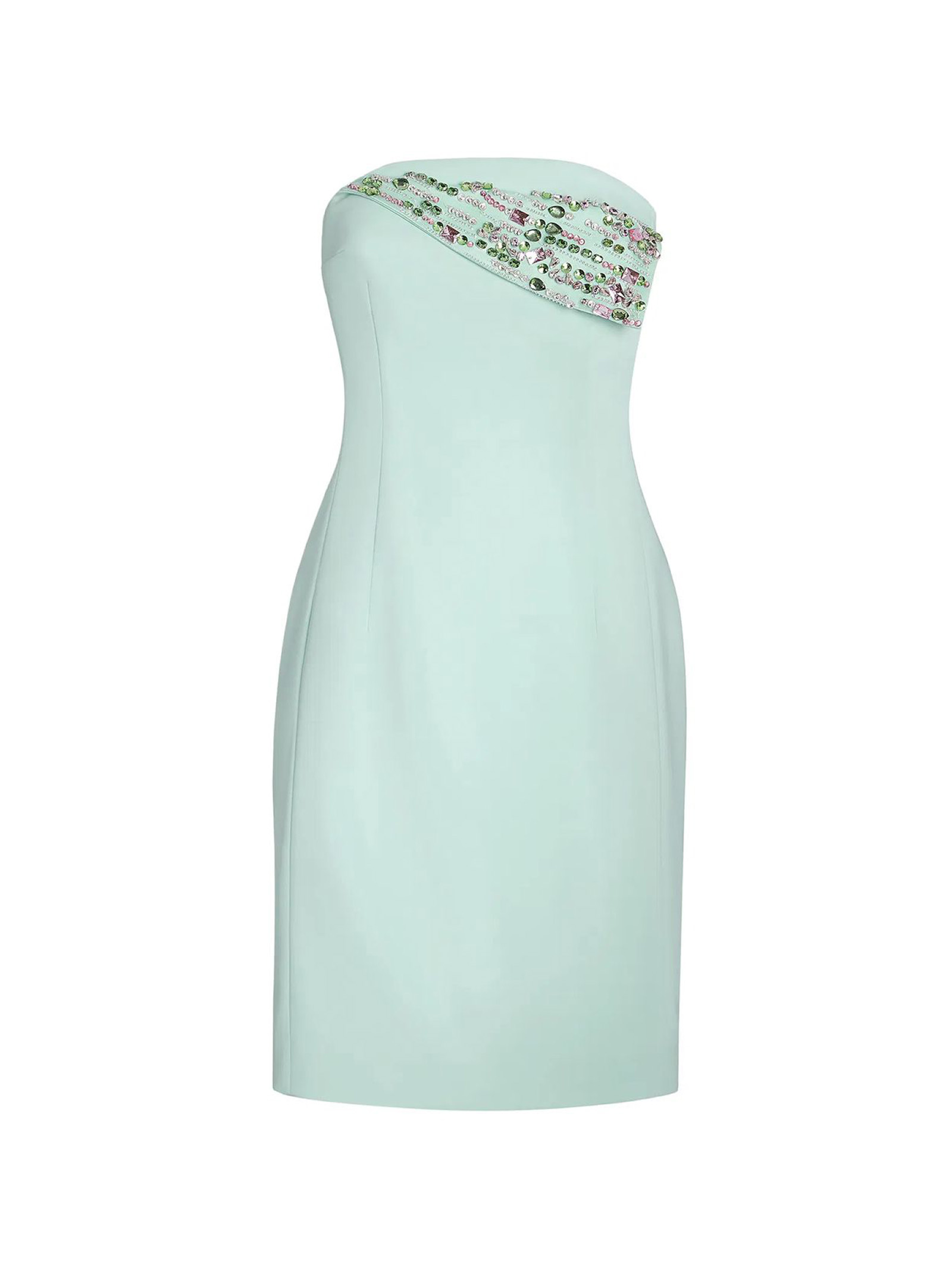 Strapless tube dress that radiates light through its bodice, embellished with embroidery featuring a mix of coloured stones applied along the décolleté. The fitted line extends above the knee, enhancing the silhouette, 96% Viscose, 4% Elastane