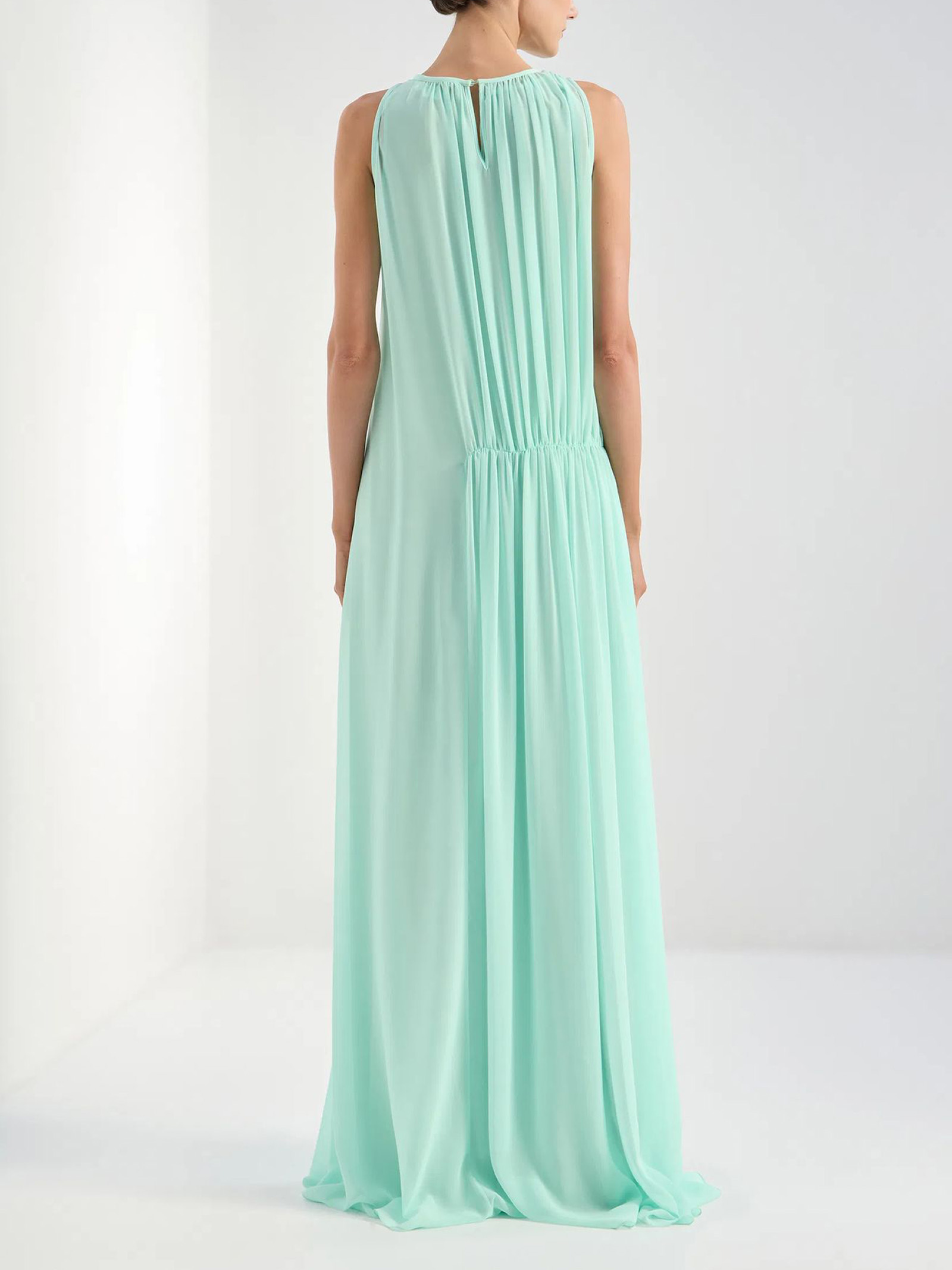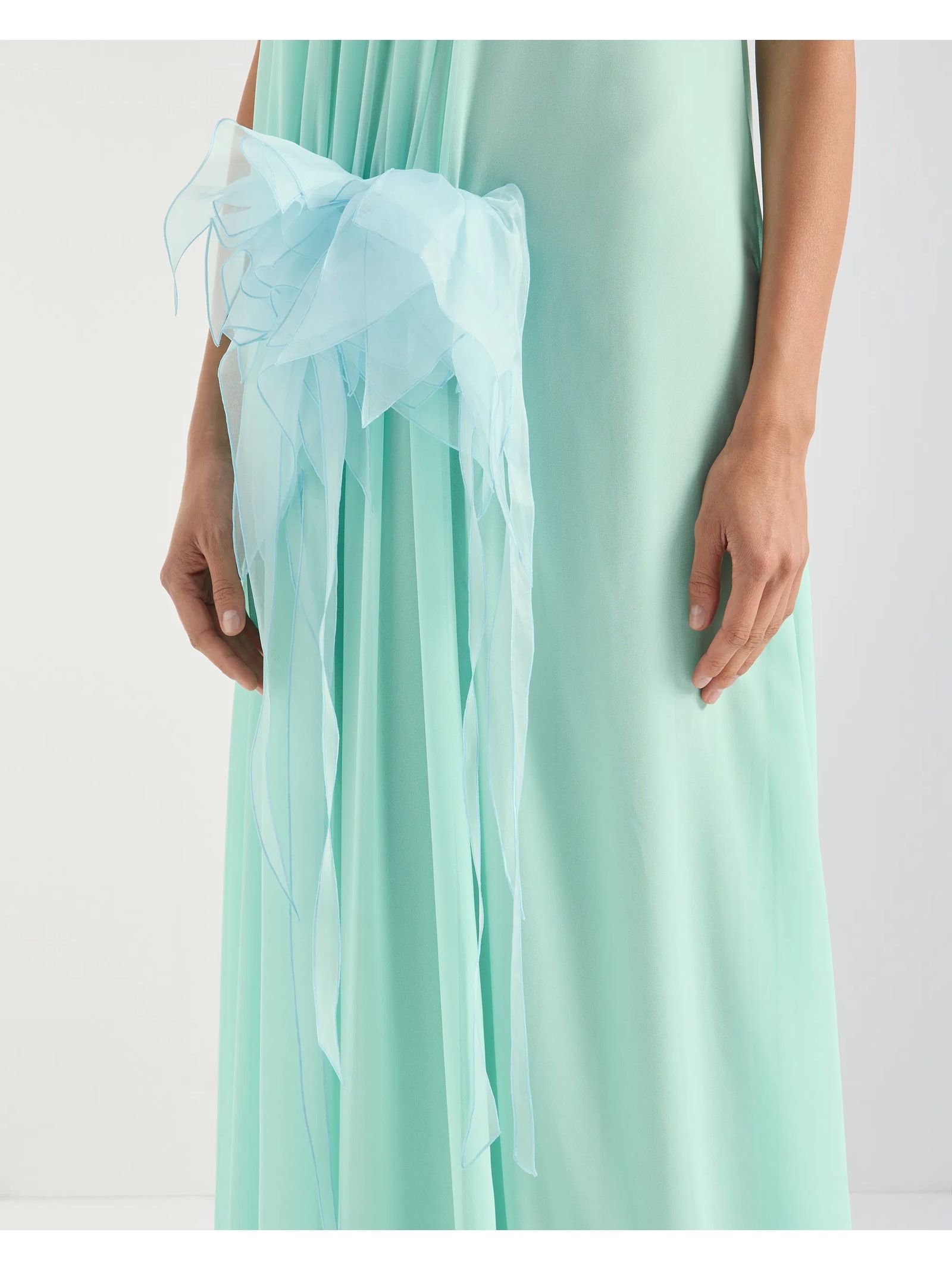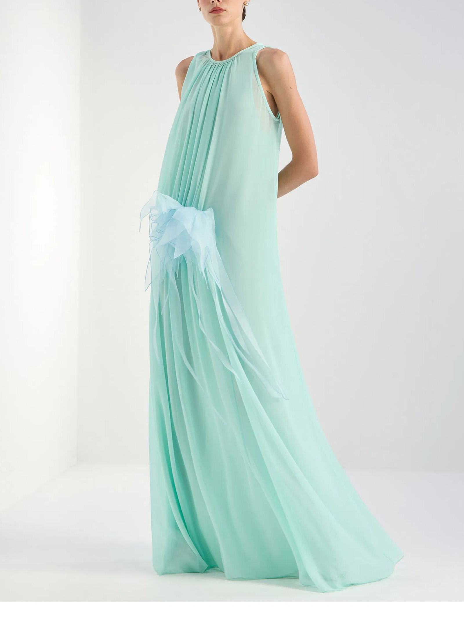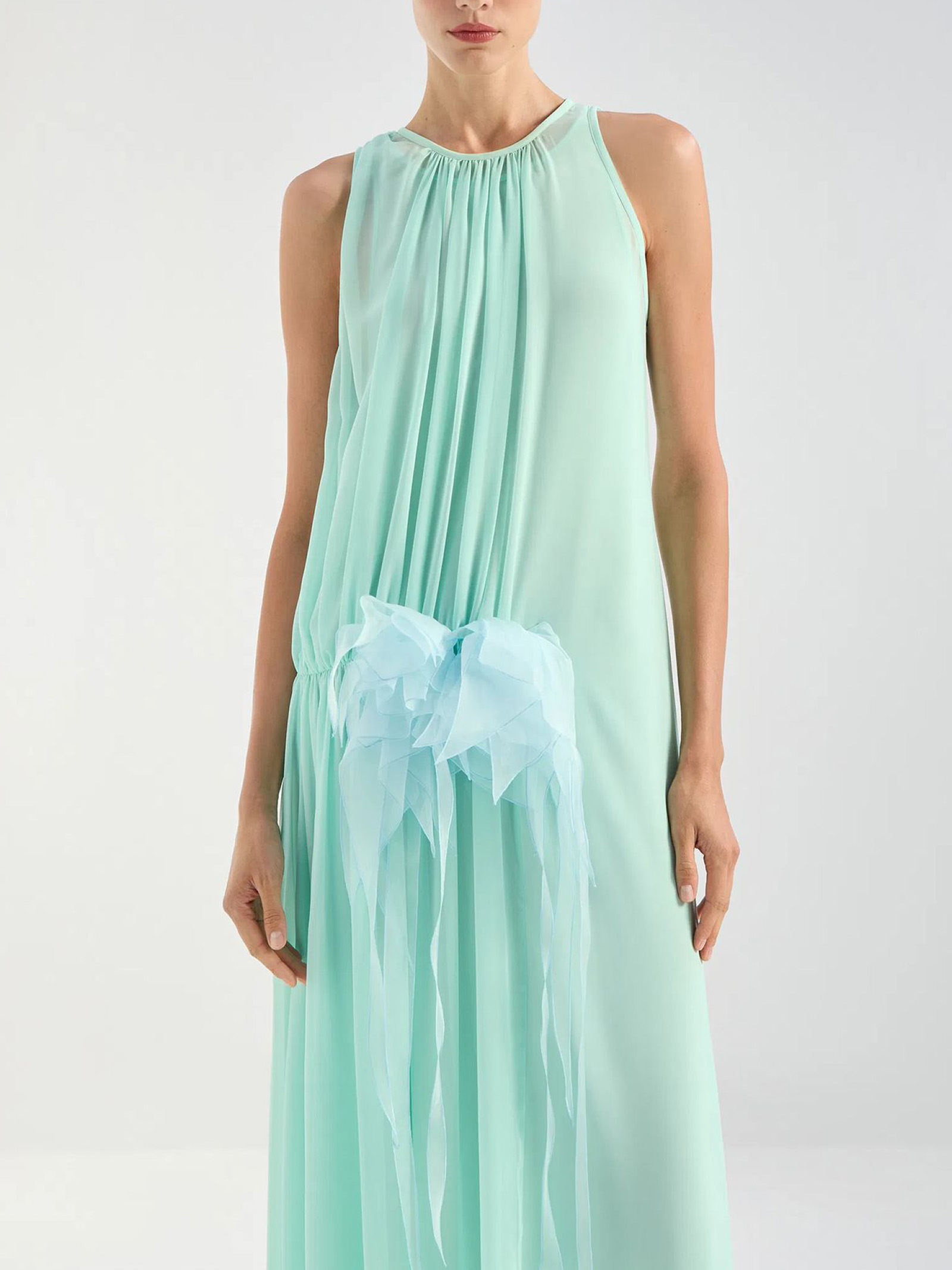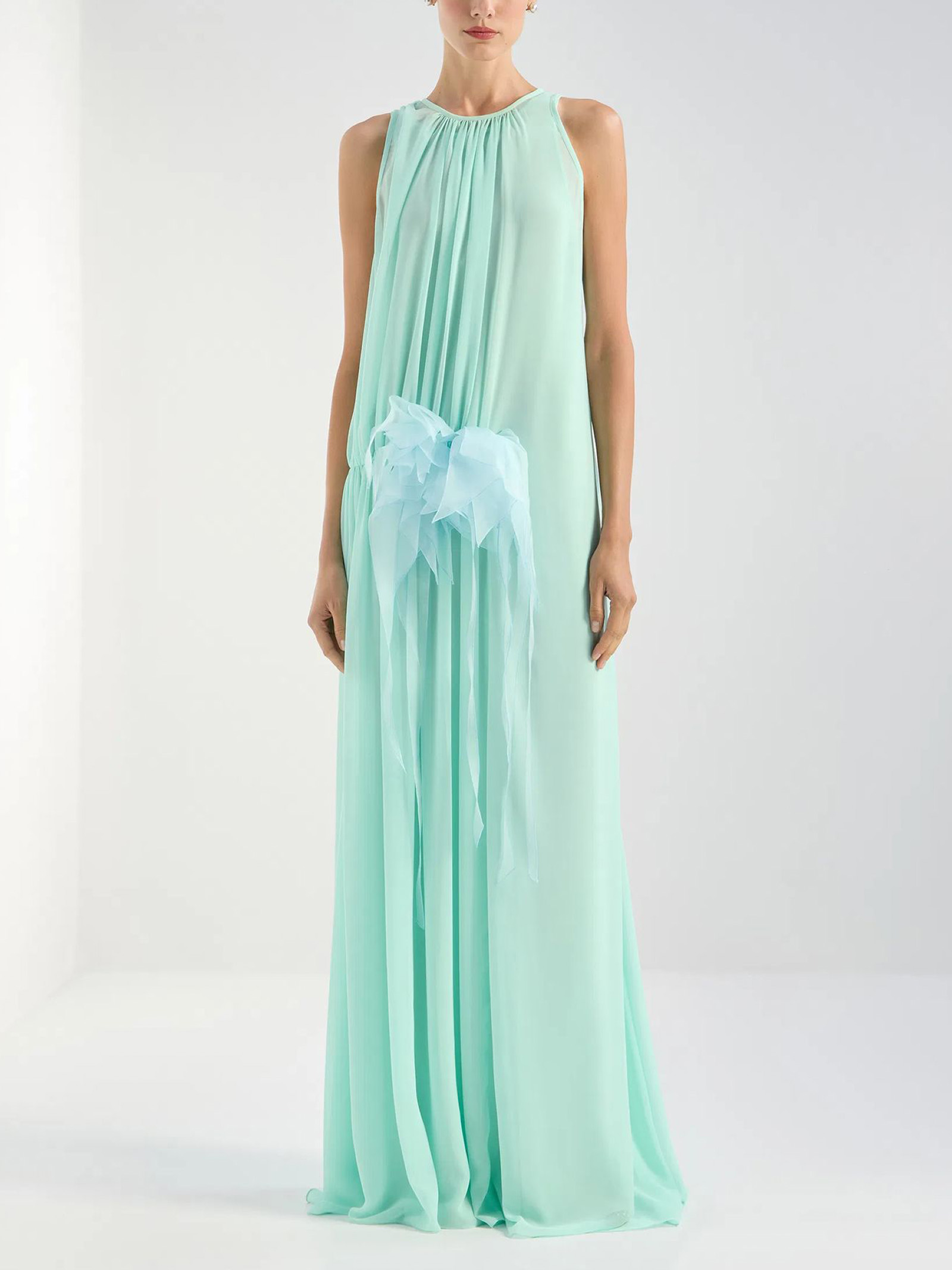 Sleeveless long silk dress featuring a refined round neckline and a softly flared silhouette that moves with effortless elegance. Delicate side draping enhances the figure, while the flower detail adds a romantic and feminine accent. The fluid fit ensures comfort and ease, Fabric 1: 100% Polyester. Fabric 2: 100% Silk