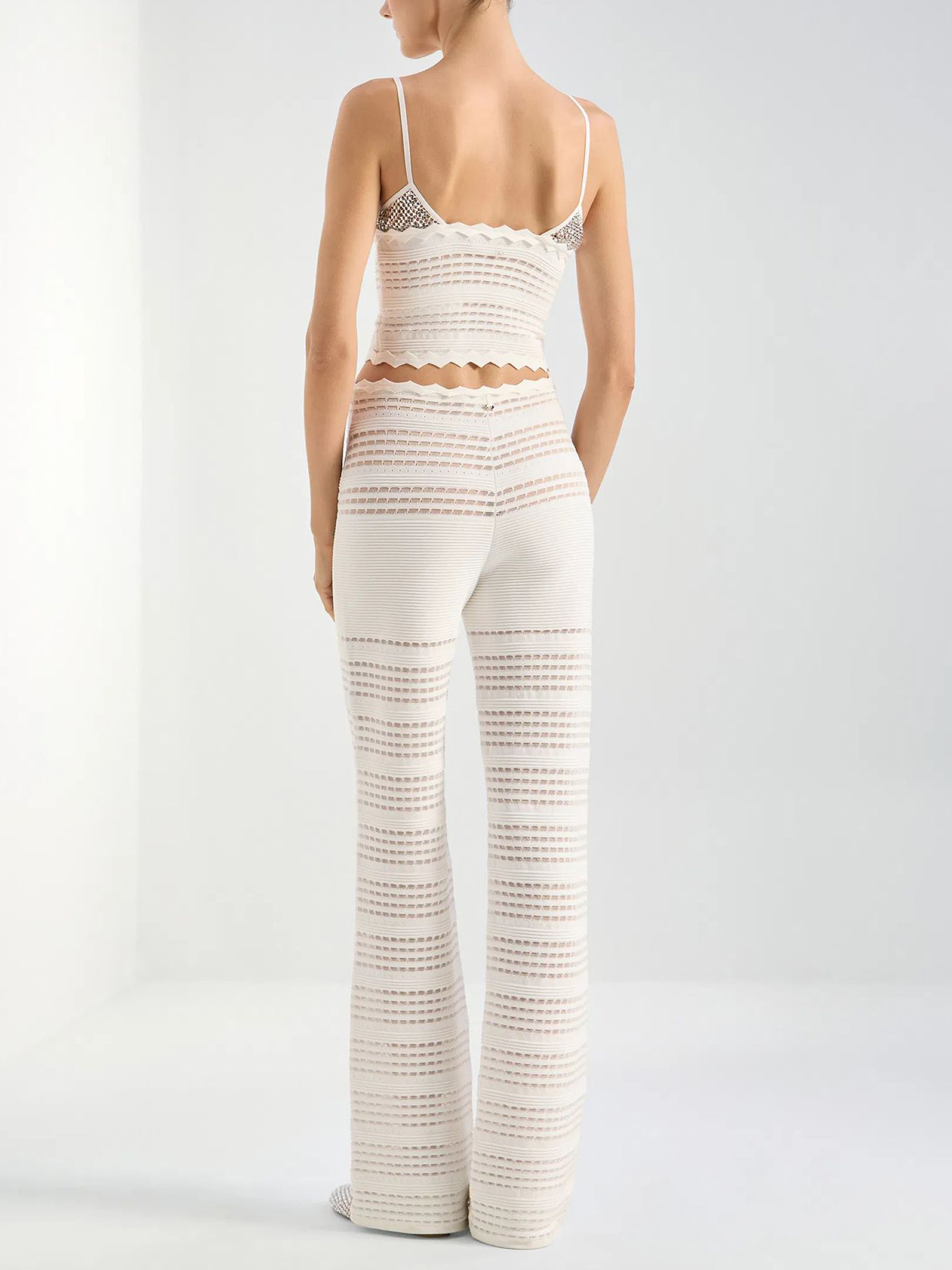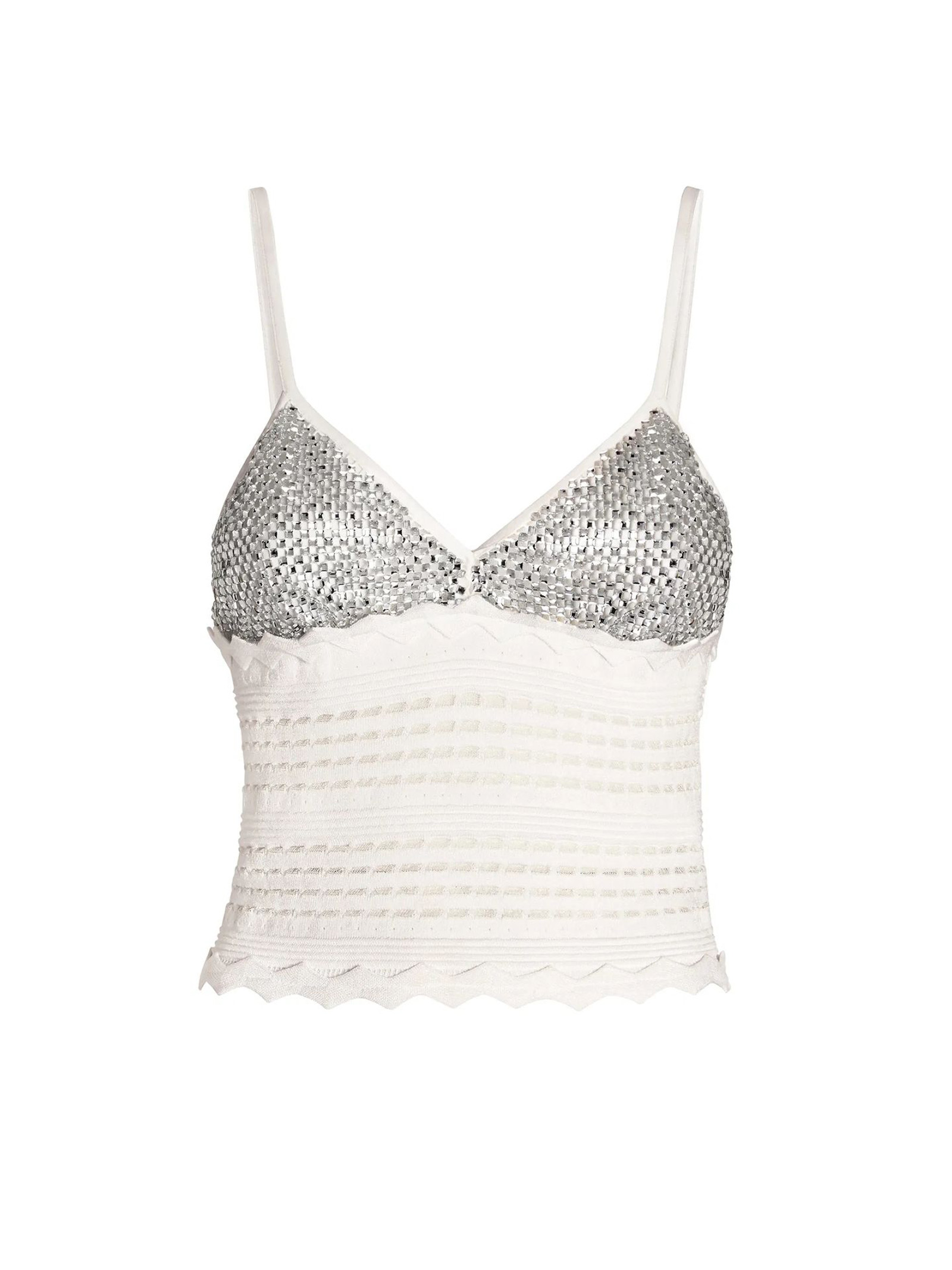 Knitted top featuring a rhinestone mesh insert at the upper body, finished with a chevron motif at the hem, waist-length cut and fitted silhouette, 83% Viscose, 17% Polyester