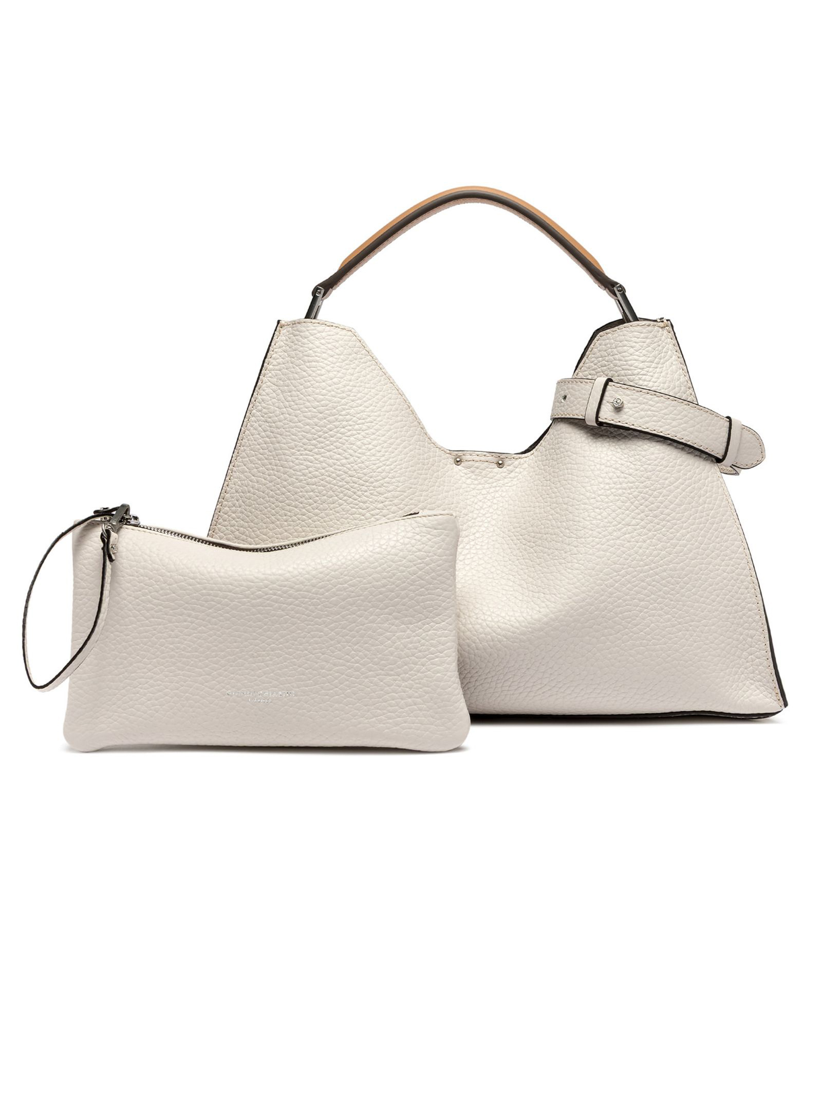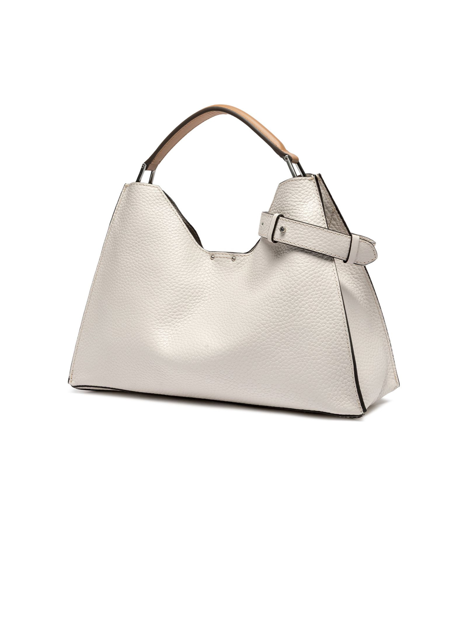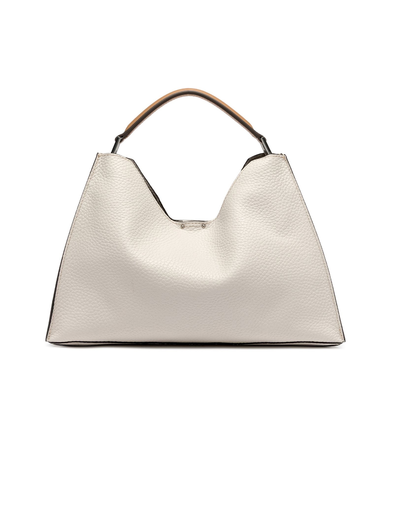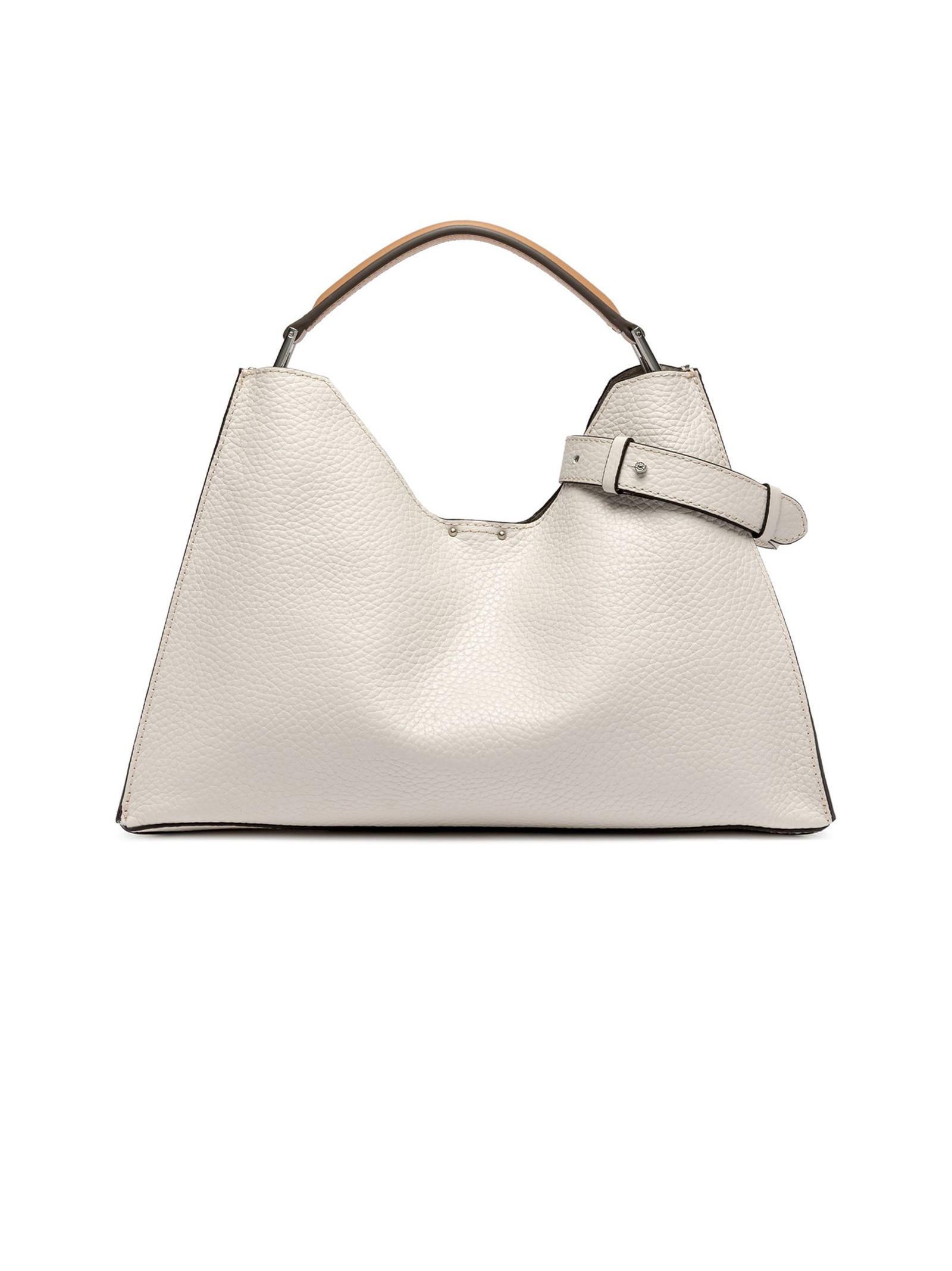 Aurora Bag in sand-tone maxi-grain hammered leather is embellished with metal details and contrasting stitching that enhance its design. Featuring an adjustable and removable leather shoulder strap, it offers two ways to carry it. Complete with a practica
