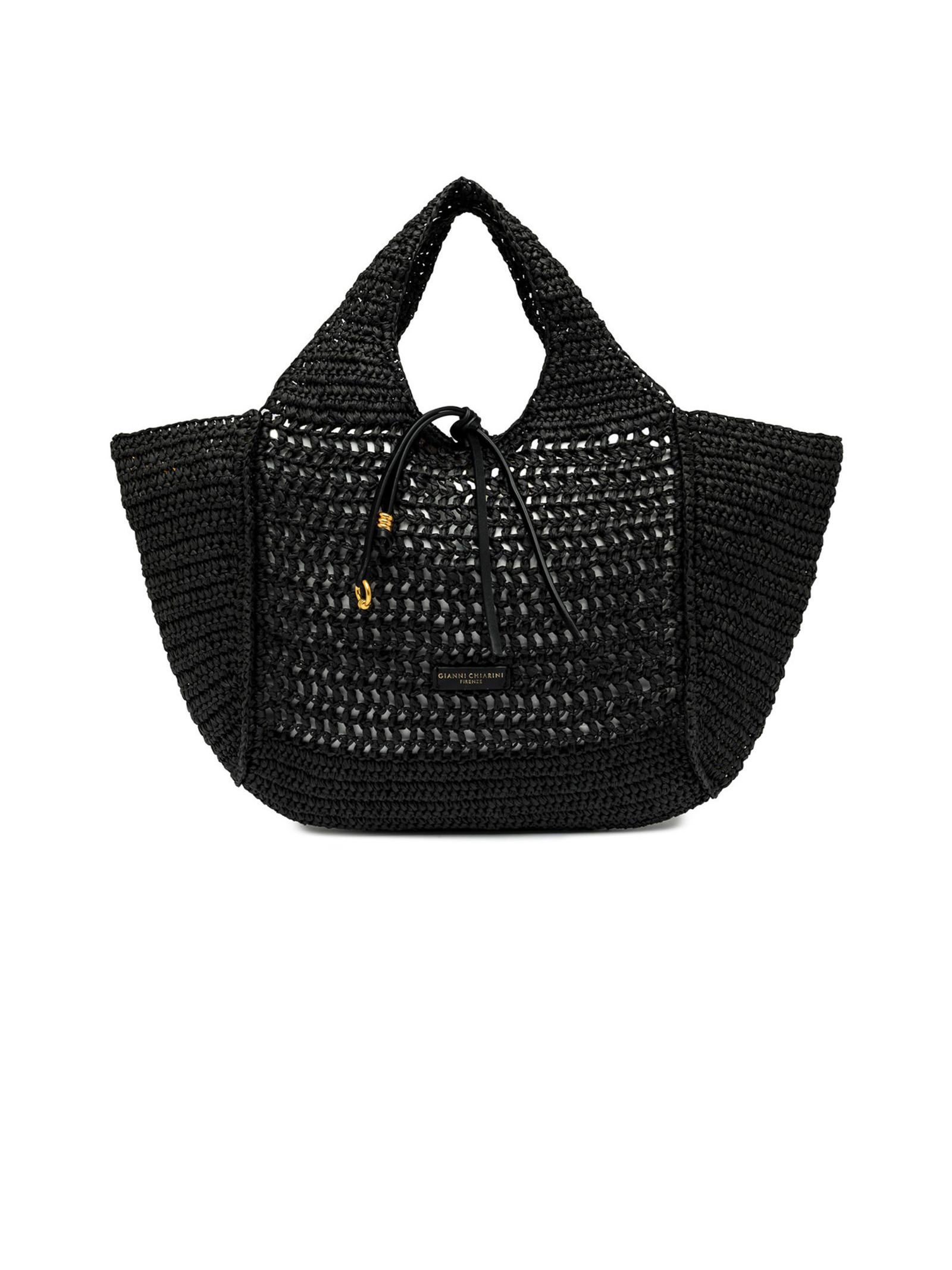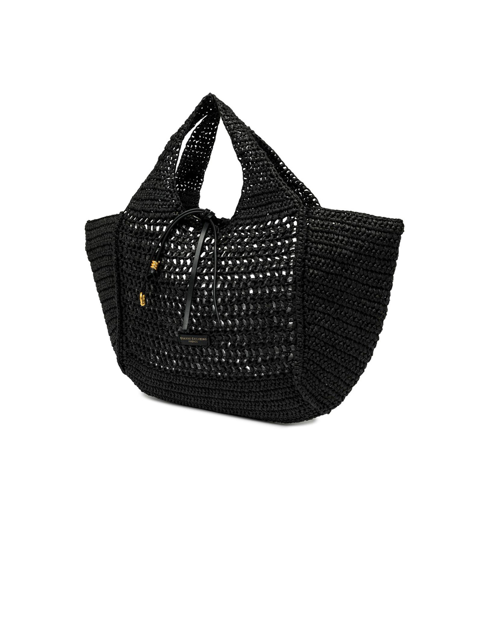 Nefeli black crochet straw tote bag, perfect for tackling summer days with lightness and style. It features a drawstring closure and metal details that add a touch of sparkle to the design. Dimensions: 44x31x7 cm