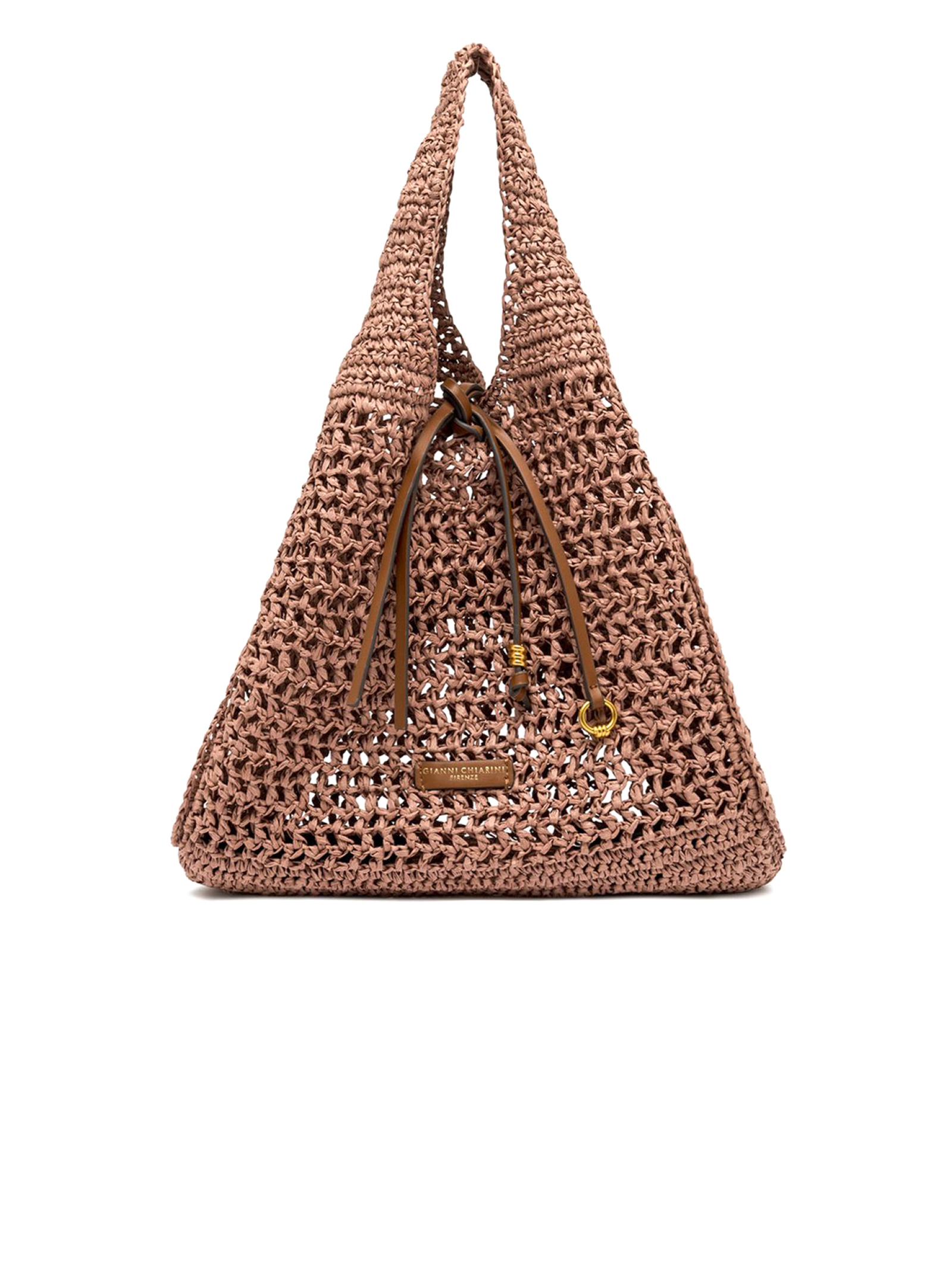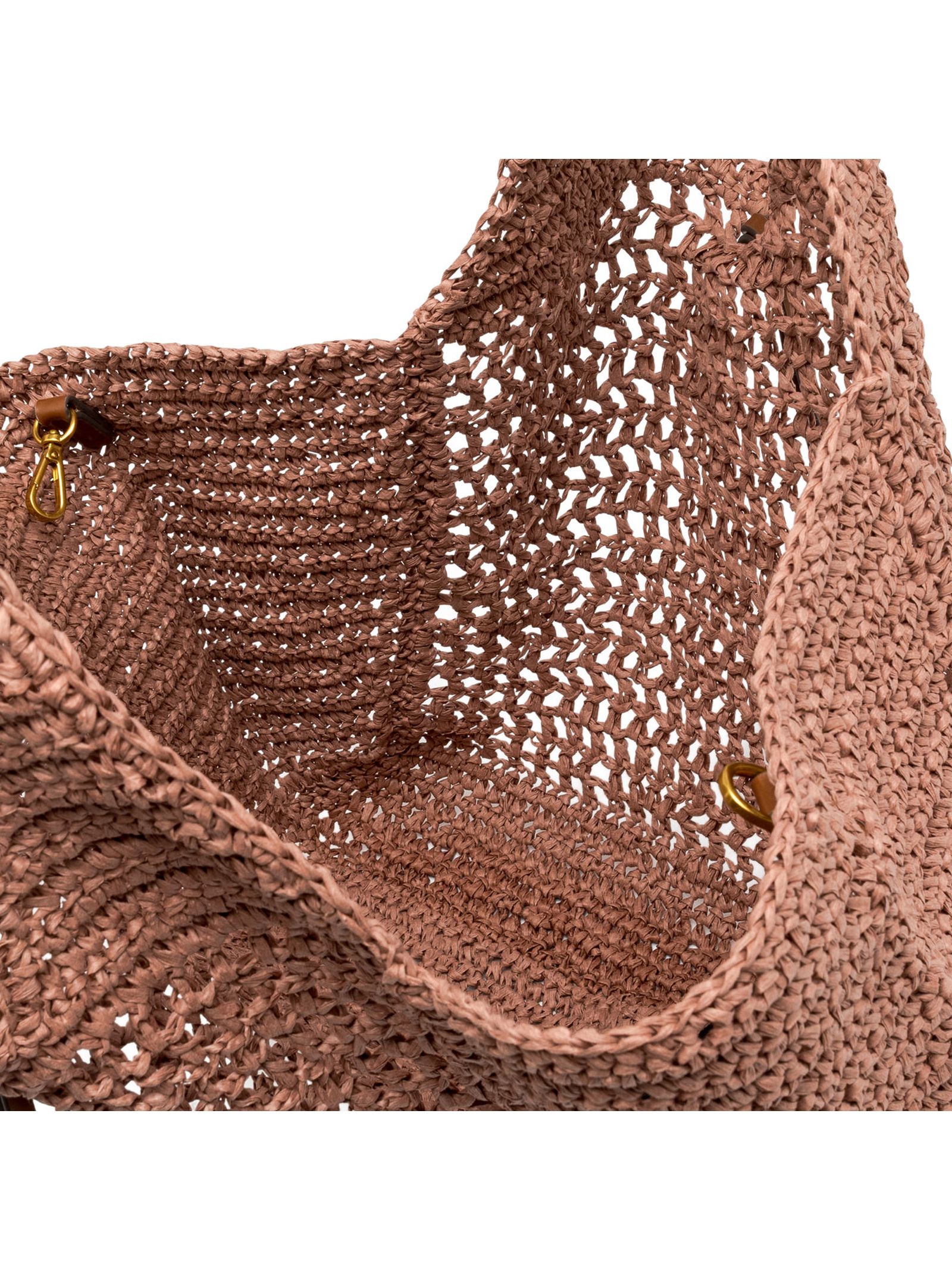 Nefeli pink crochet straw tote bag, perfect for tackling summer days with lightness and style. It features a drawstring closure and metal details that add a touch of sparkle to the design. Dimensions: 44x31x7 cm