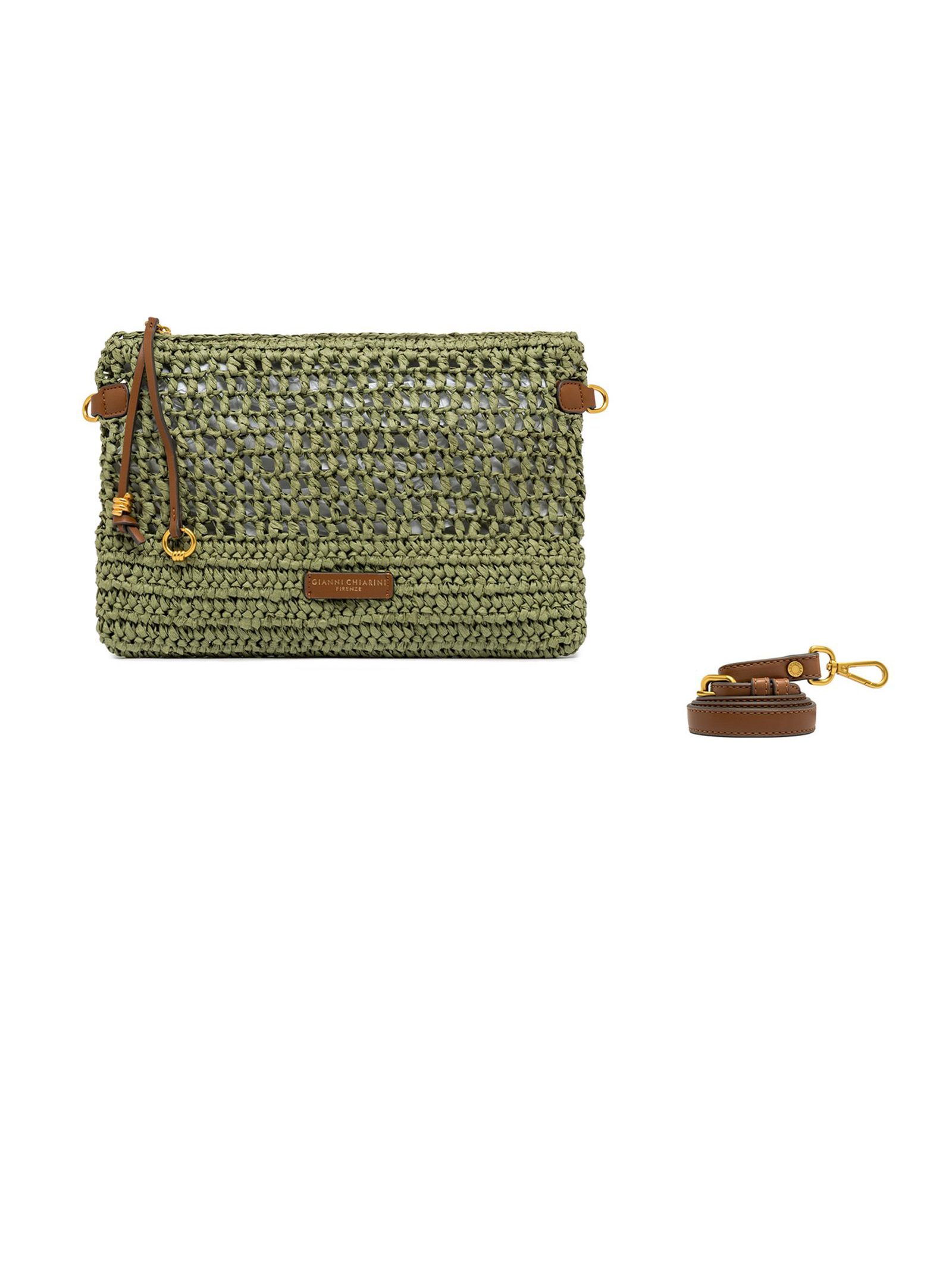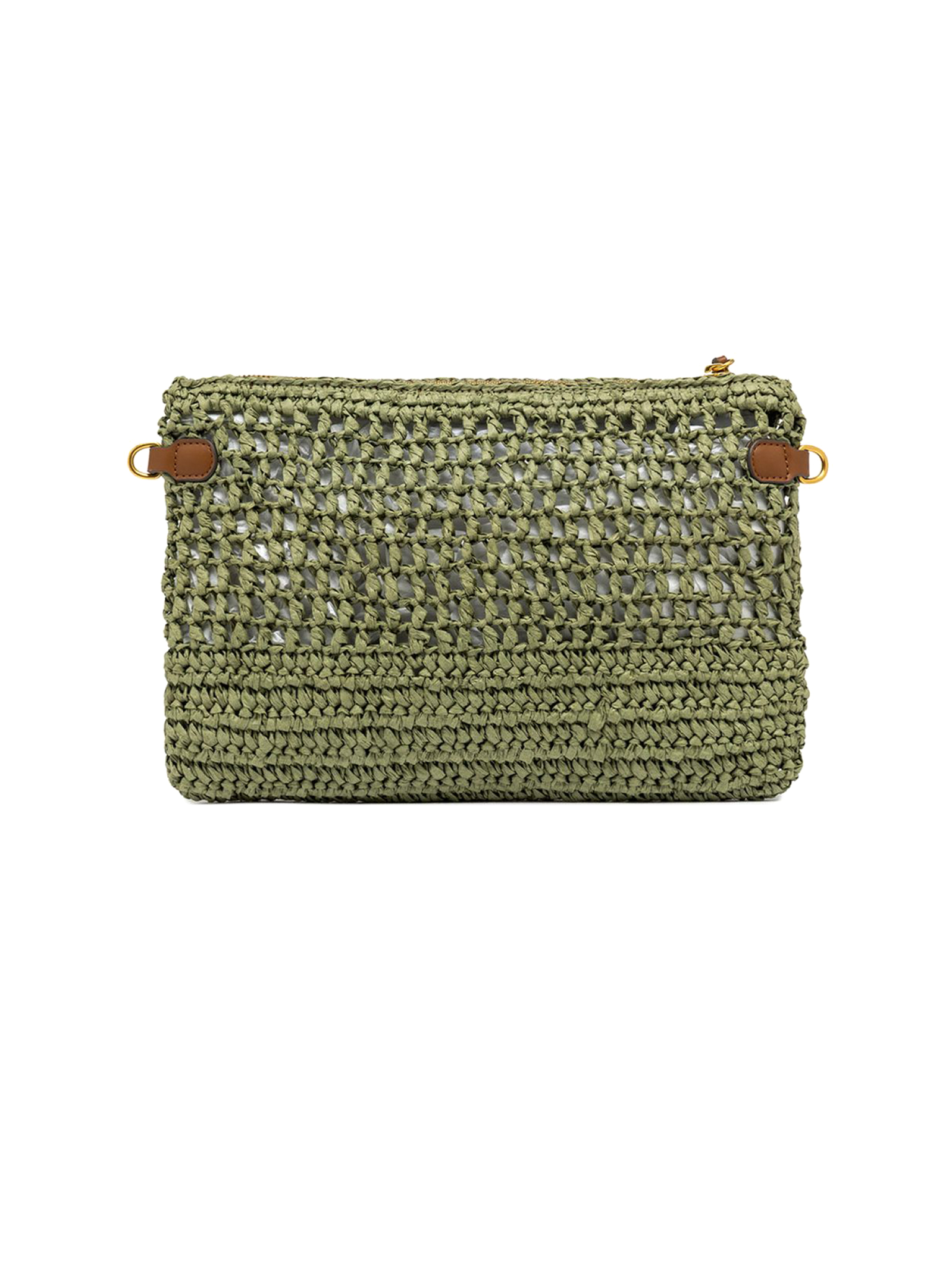 Nefeli pouch bag in green crochet straw, rectangular silhouette, features a zip closure and metal details that add a touch of sparkle to the design. Equipped with a practical, removable shoulder strap for versatile use. Dimensions: 28x18x2 cm