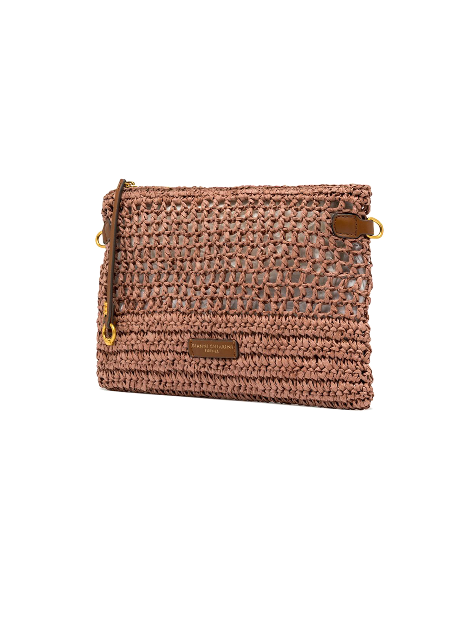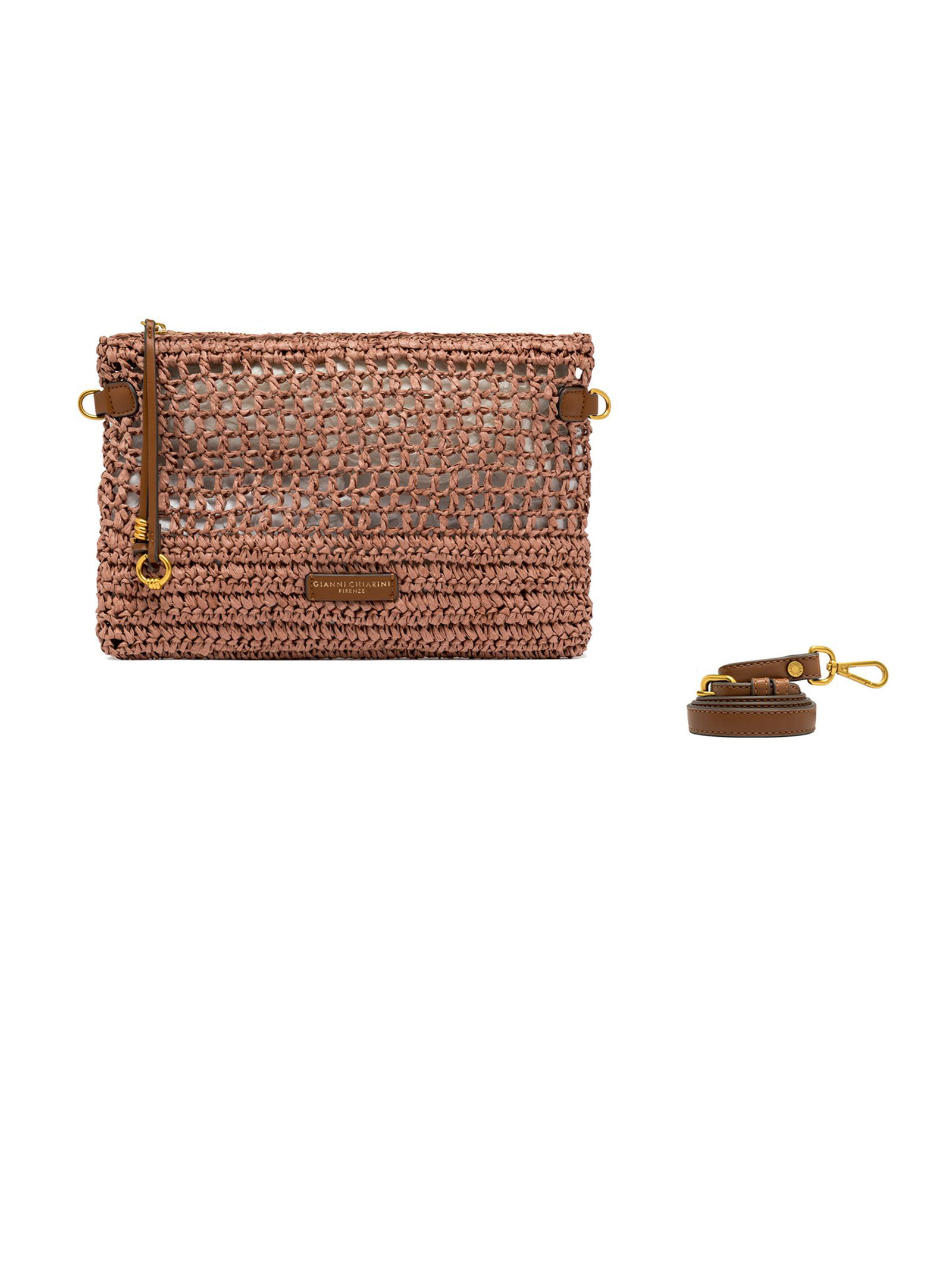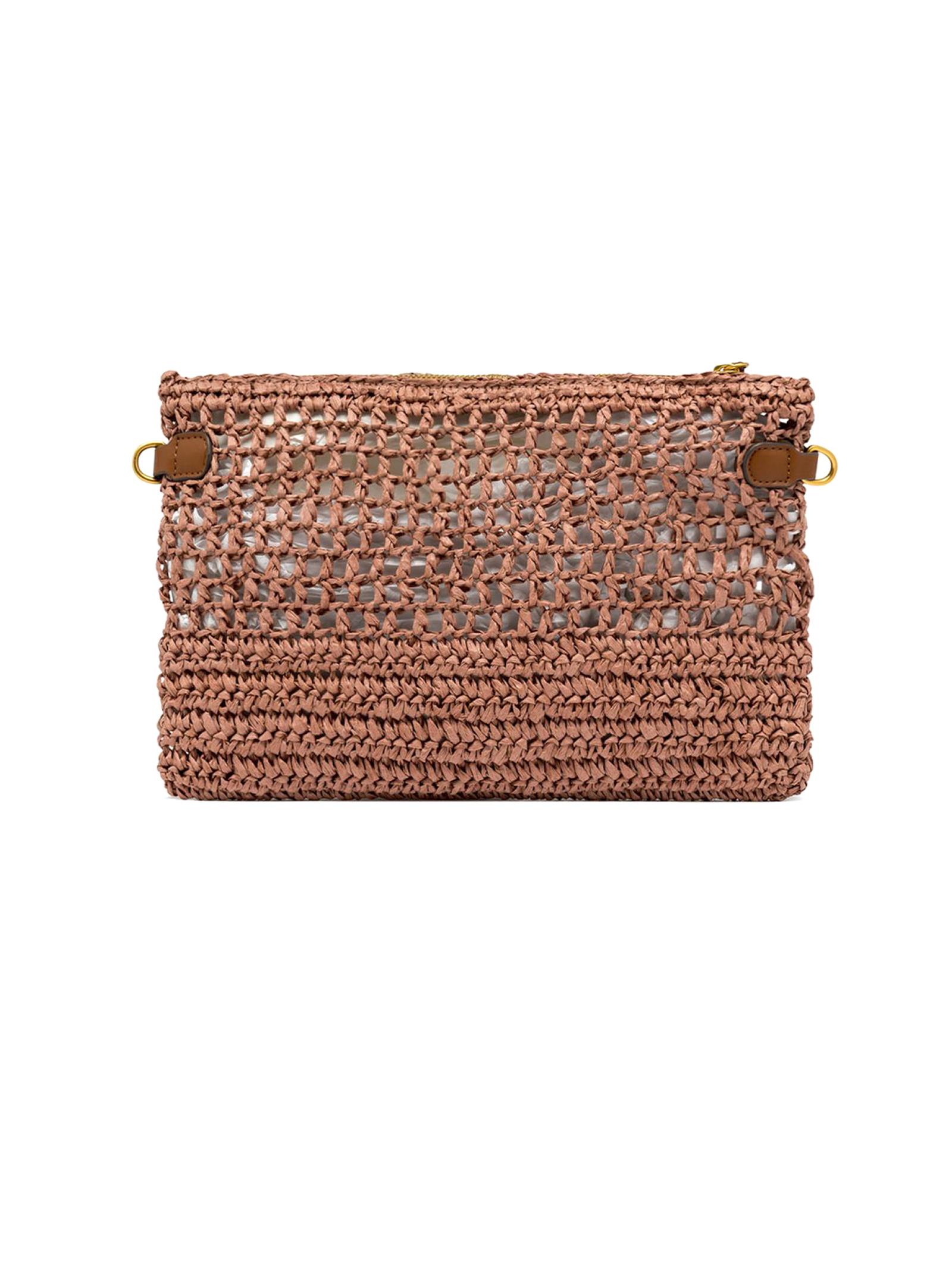 Nefeli pouch bag in pink crochet straw, rectangular silhouette, features a zip closure and metal details that add a touch of sparkle to the design. Equipped with a practical, removable shoulder strap for versatile use. Dimensions: 28x18x2 cm