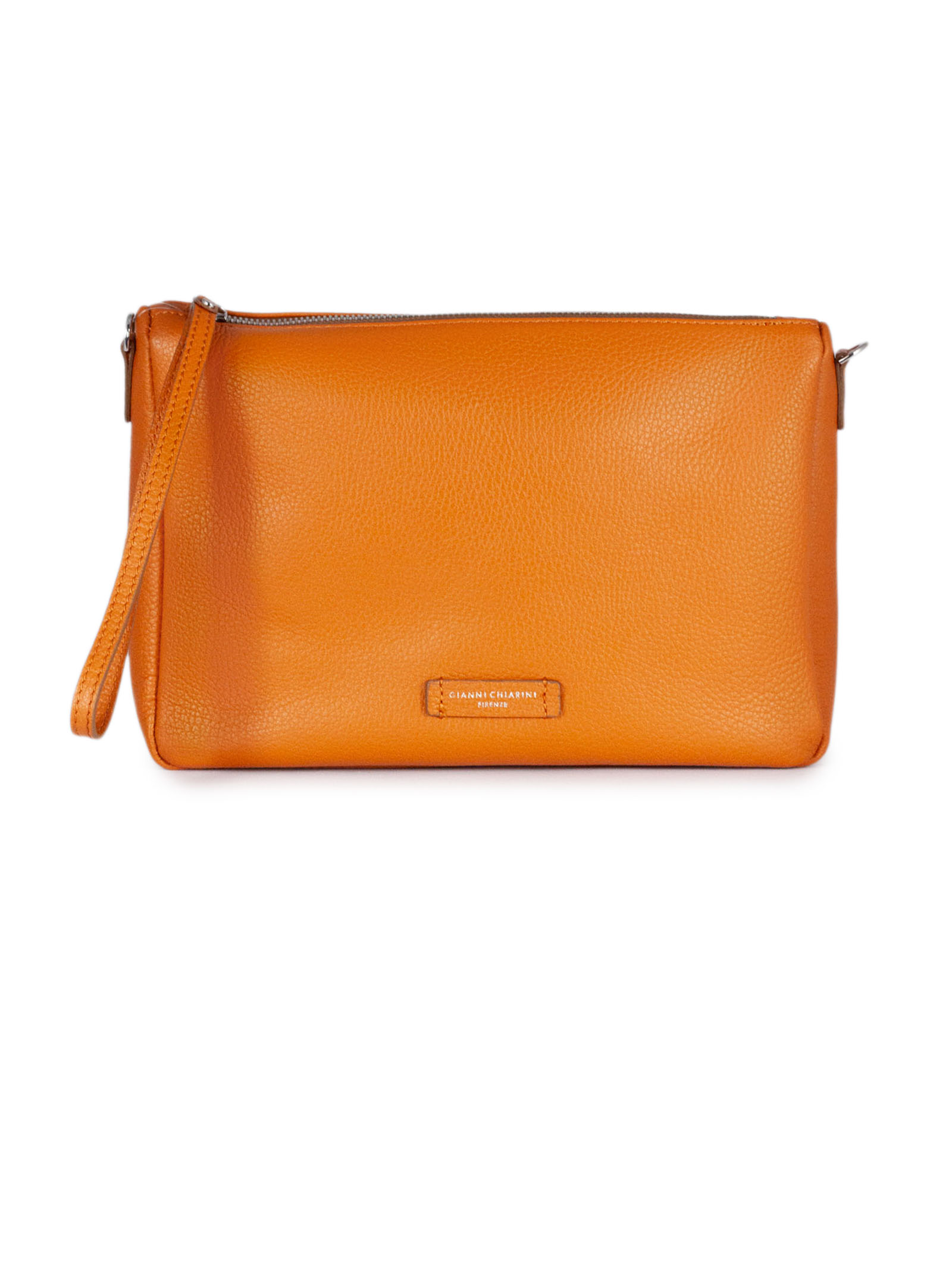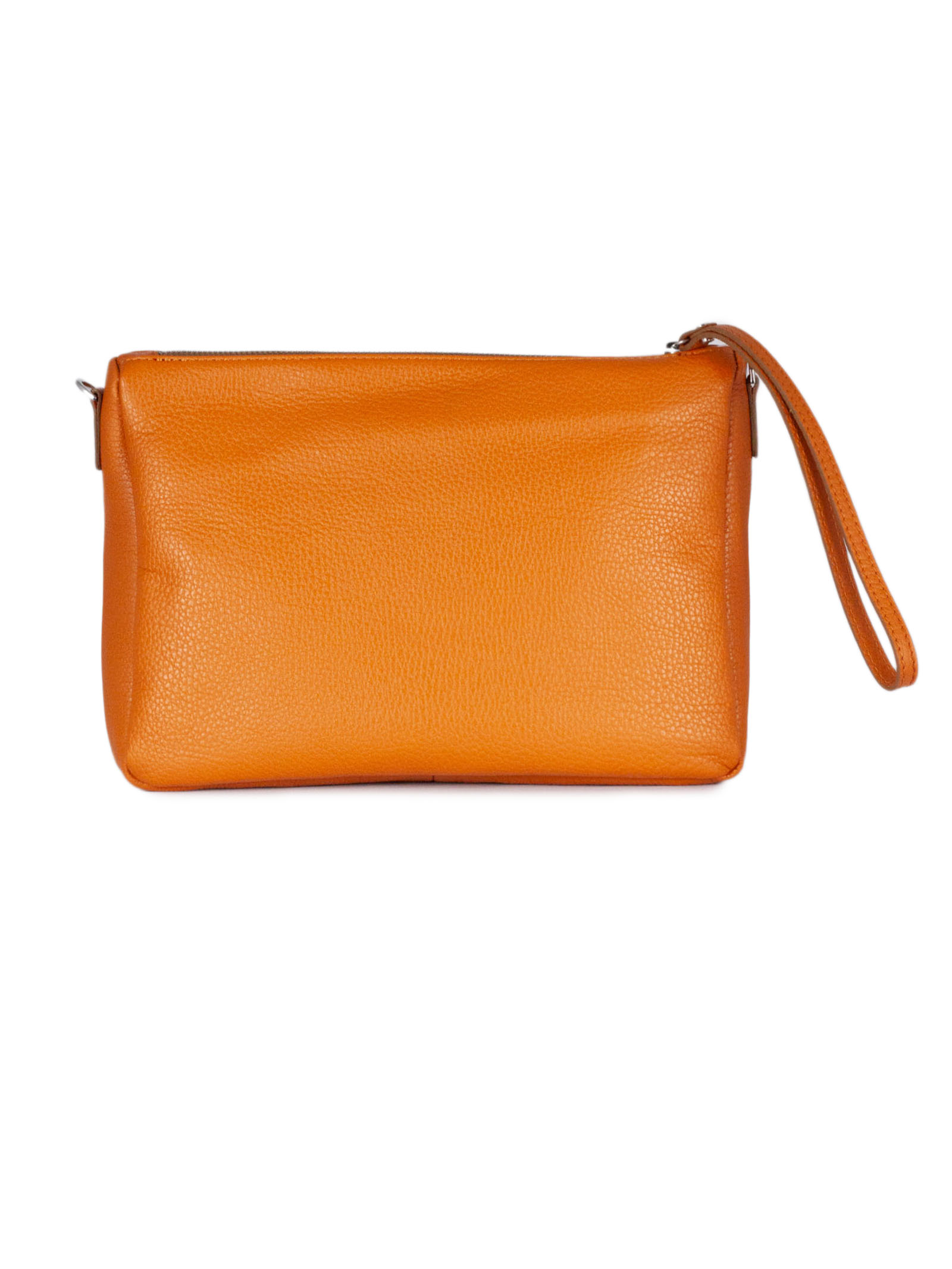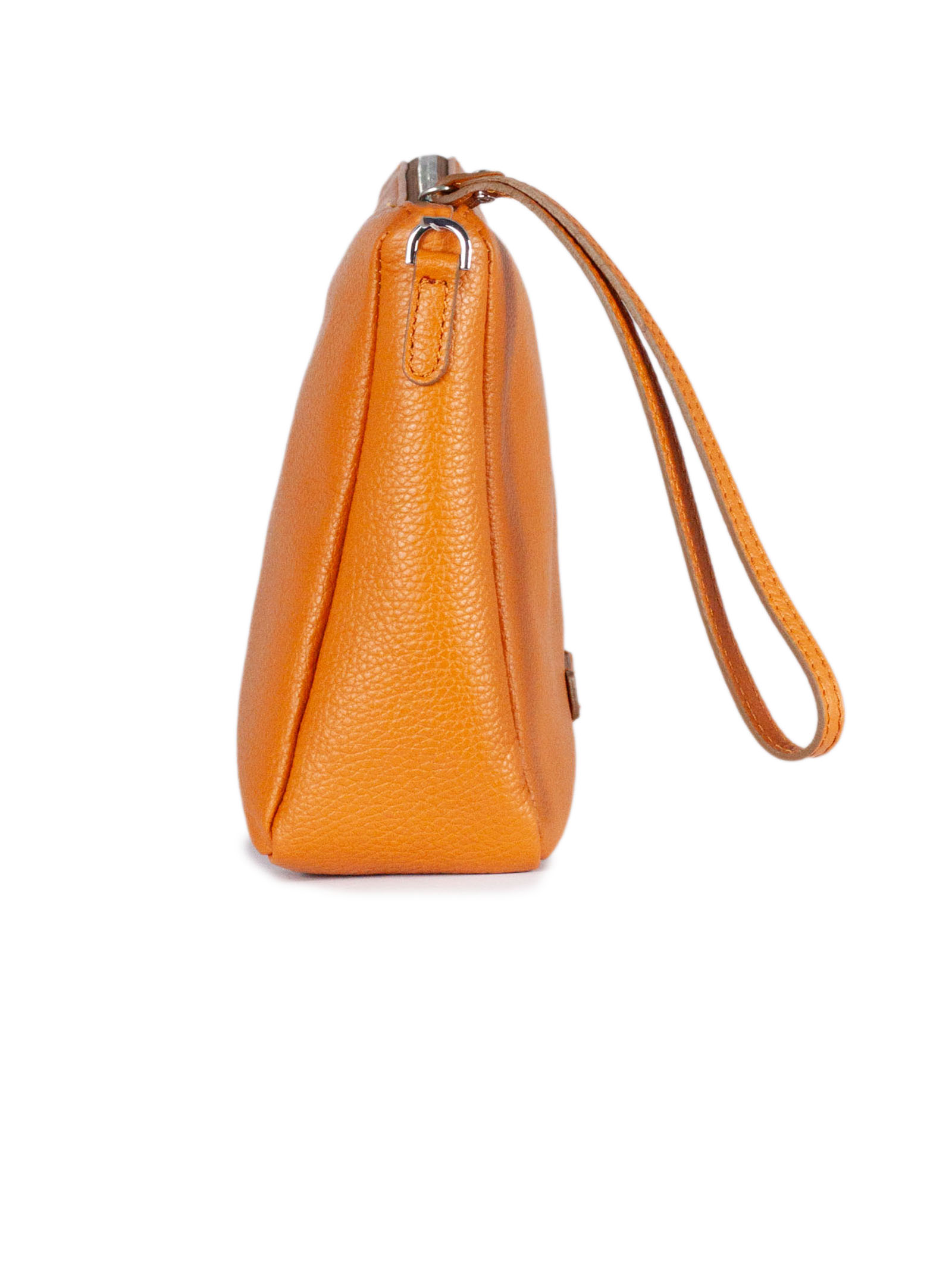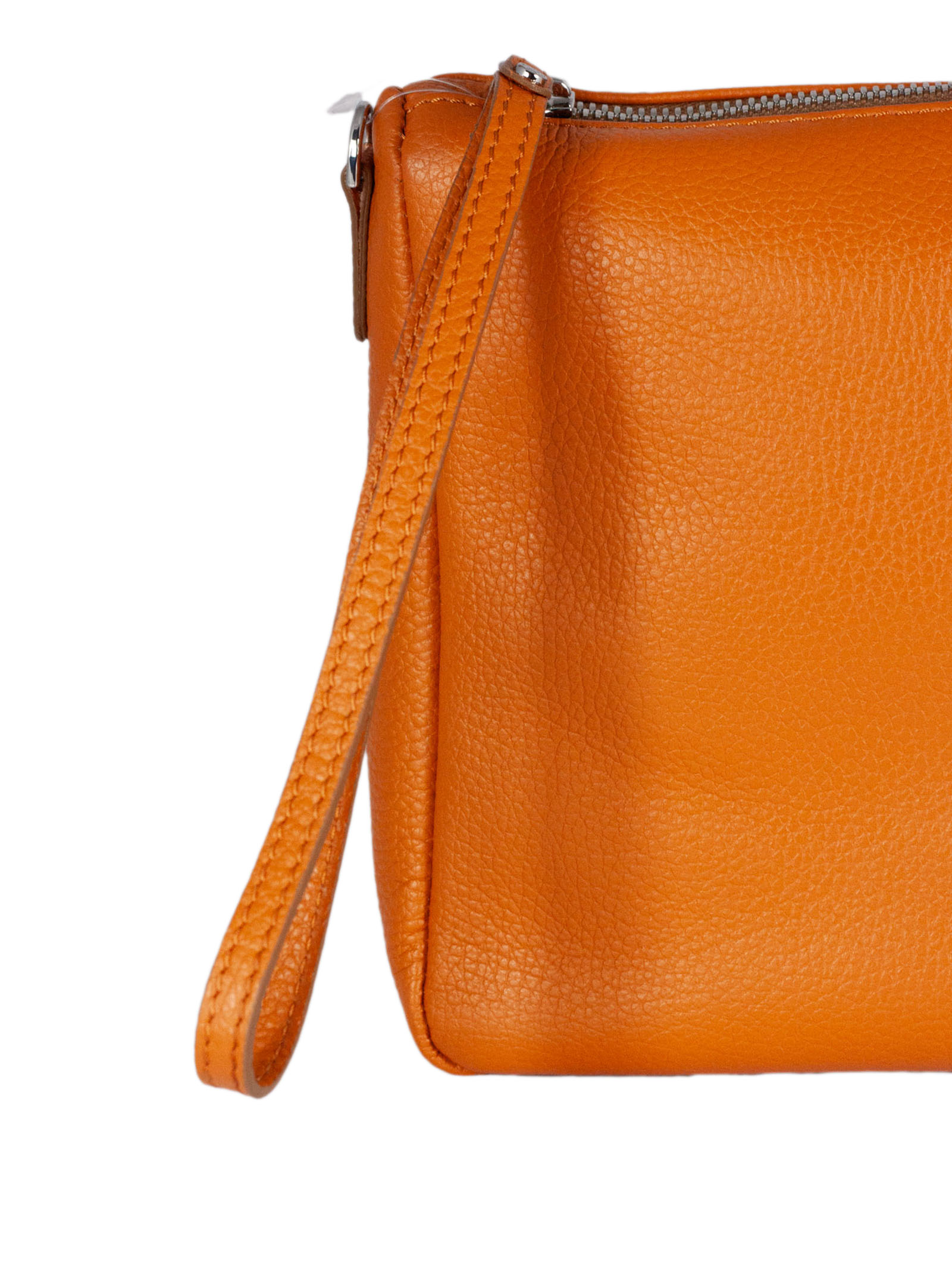 Nora Pouch bag in orange textured leather featuring a leather wrist strap and an adjustable and removable leather shoulder strap, with a practical and secure zip closure. Dimensions: 28x21x9 cm