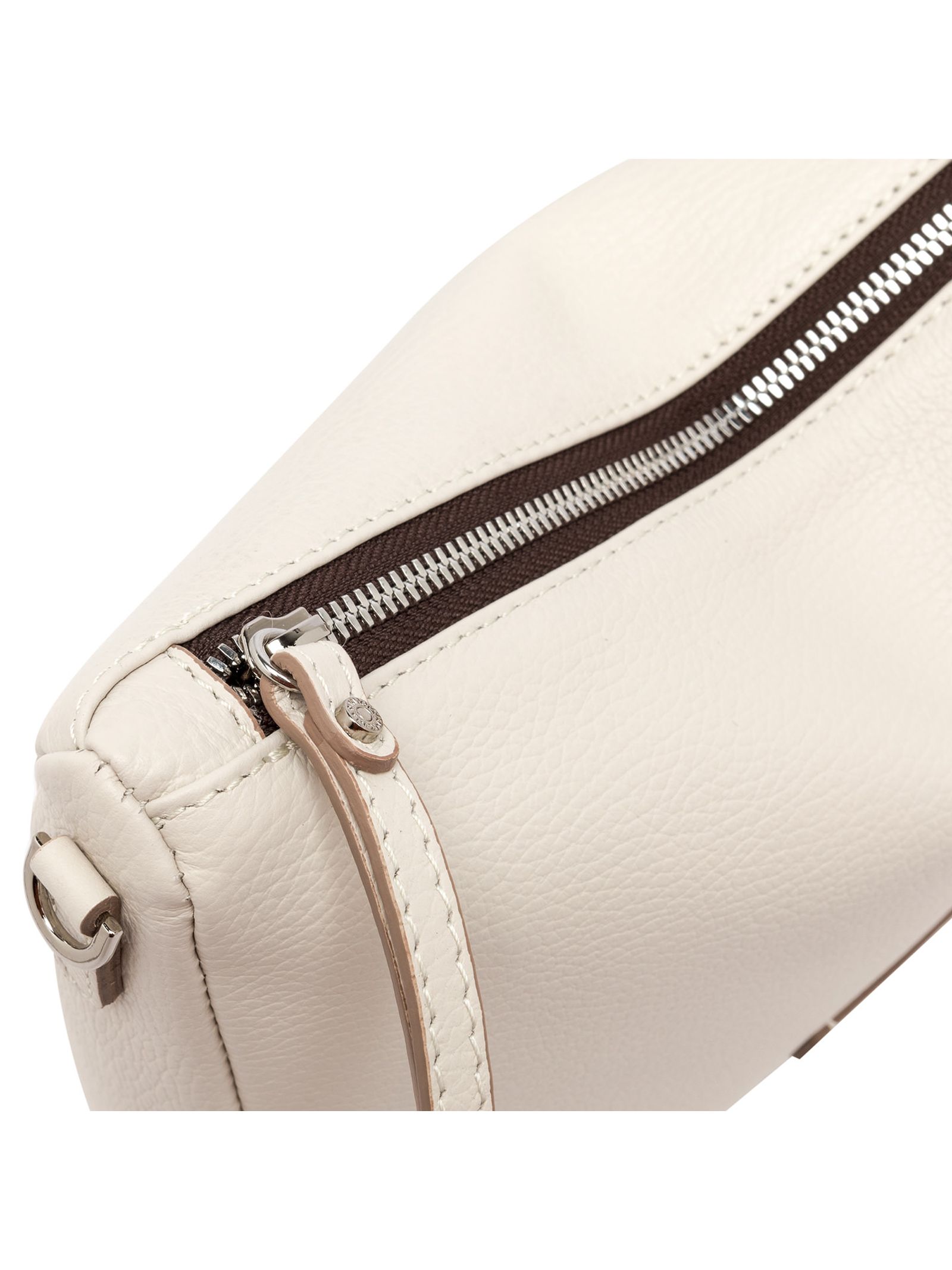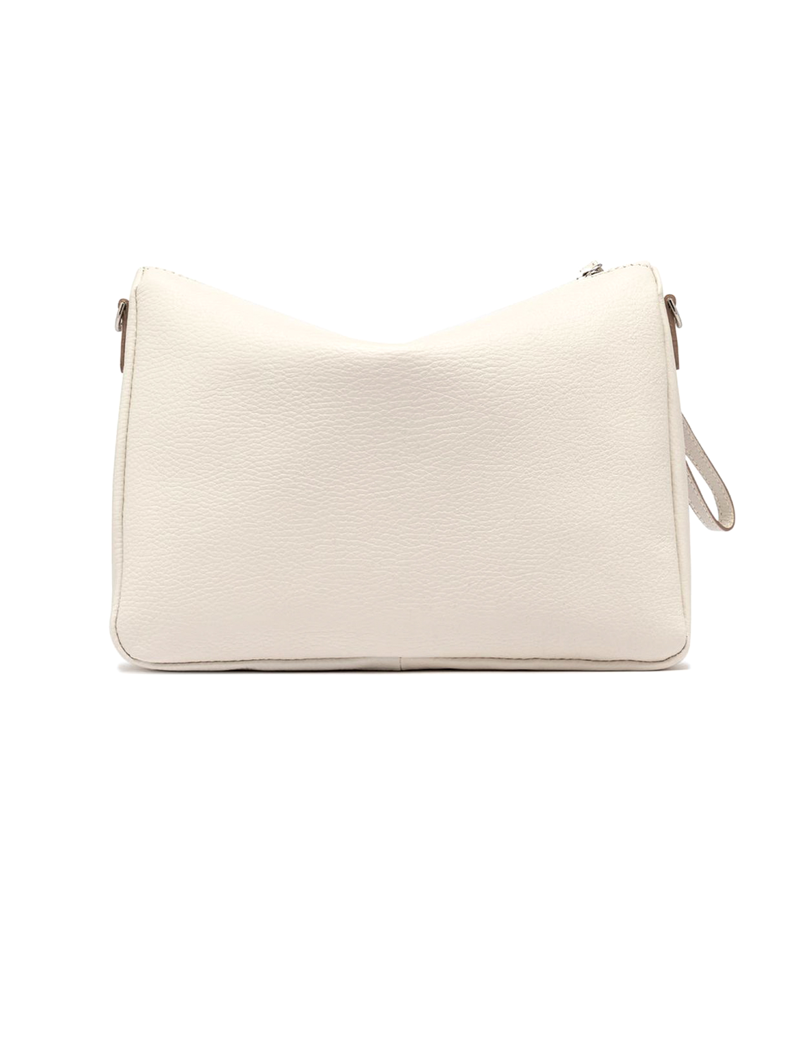 Nora Pouch bag in white hammered leather, with a leather strap that allows it to be worn on the wrist and an adjustable shoulder strap, both removable. It has a zip closure for added convenience. Dimensions: 28x21x9 cm