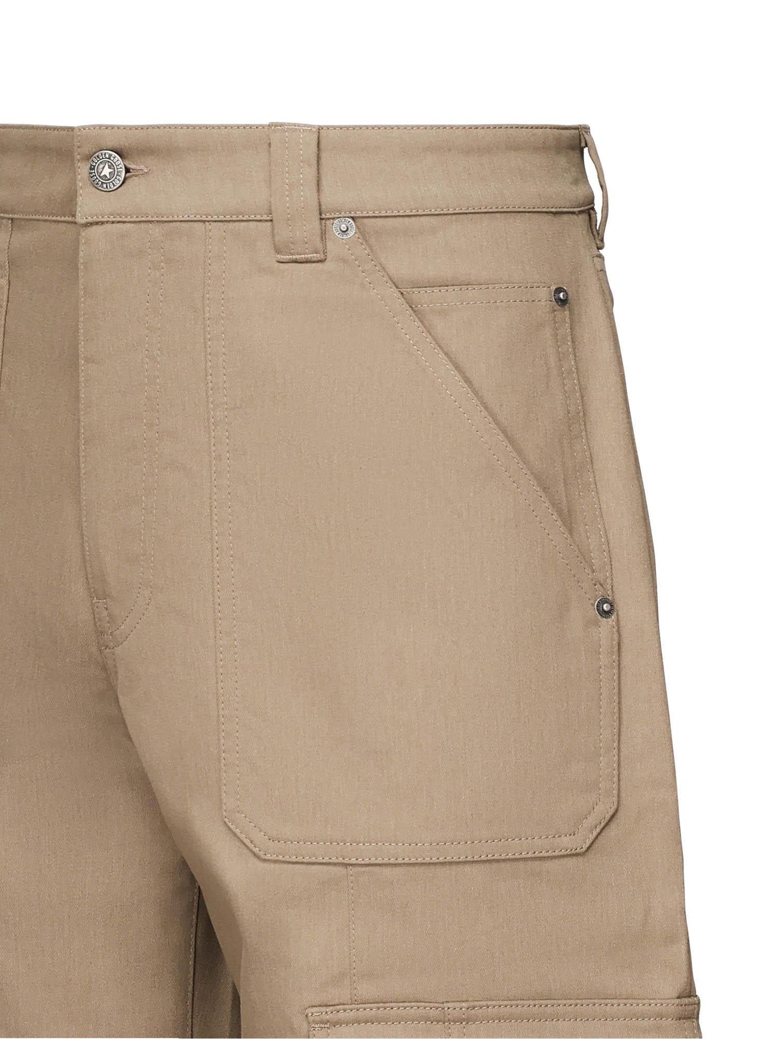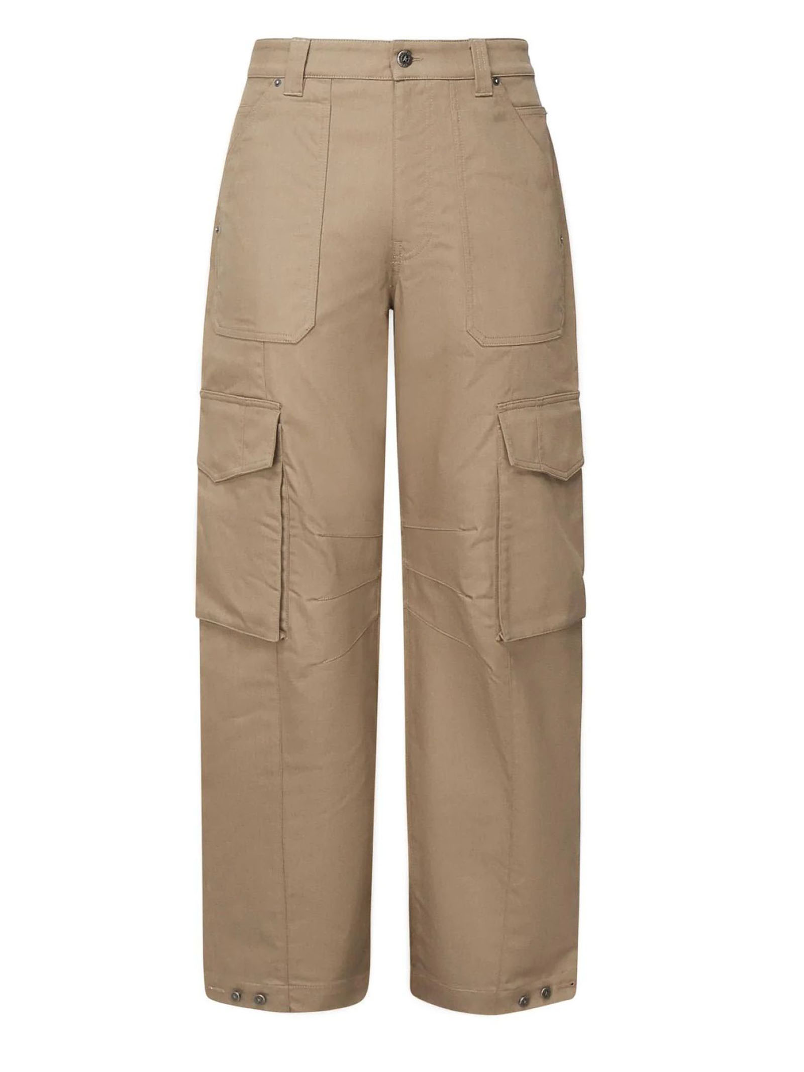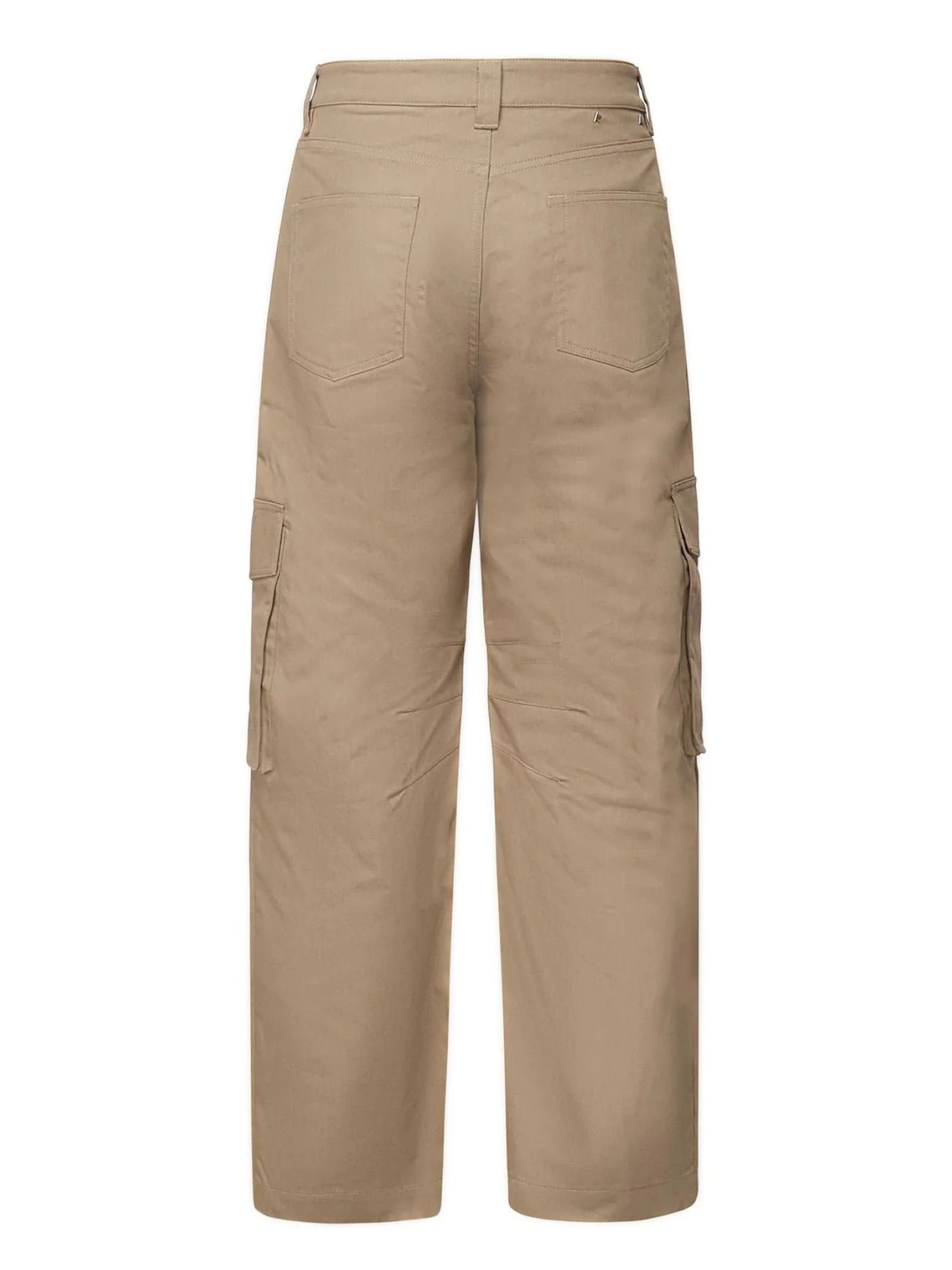 Beige cotton Leniin trousers, textured finish, front button and zip fastening, belt loops, two side slash pockets, coin pockets, two side cargo pockets, two rear patch pockets, straight leg