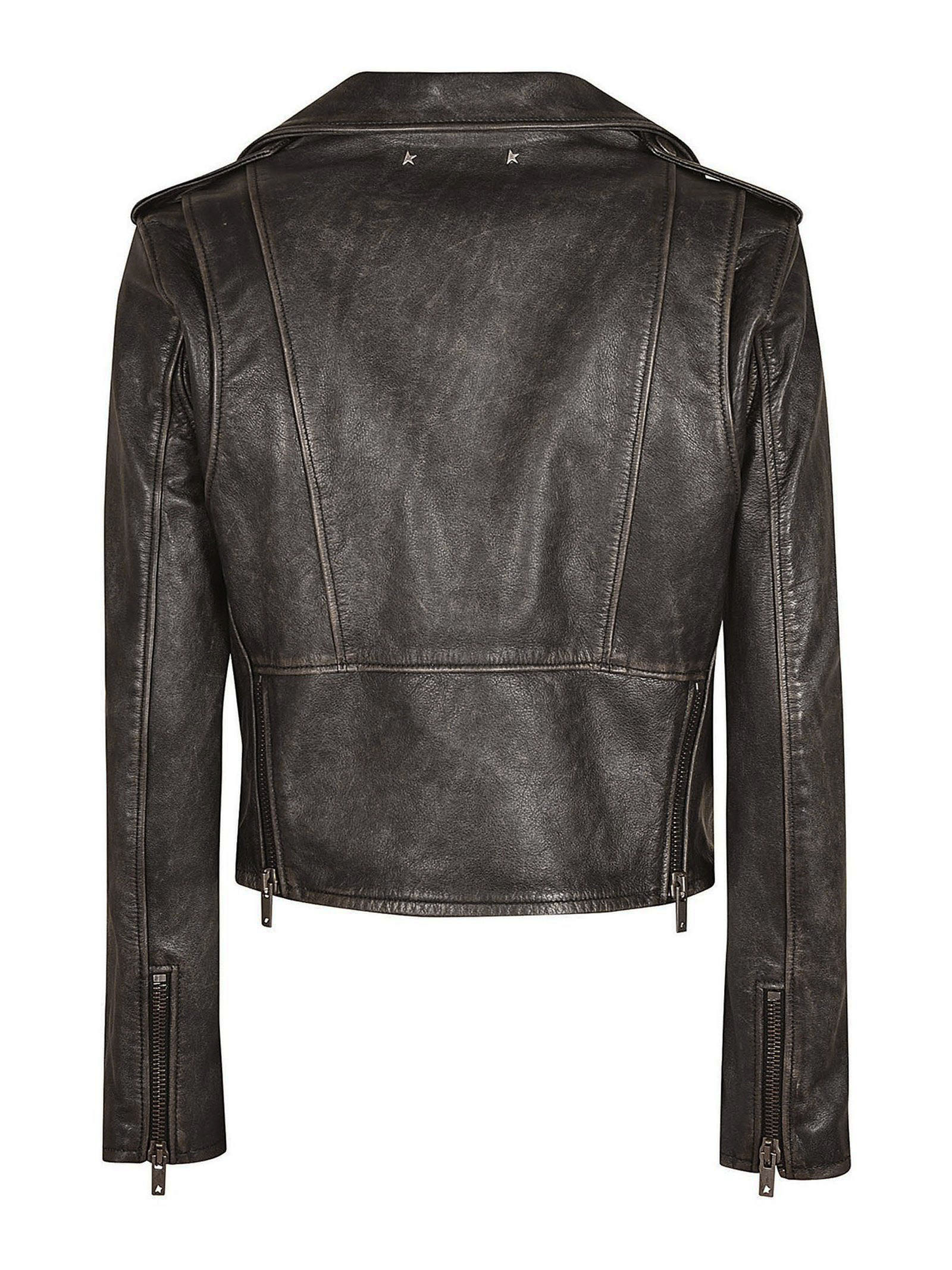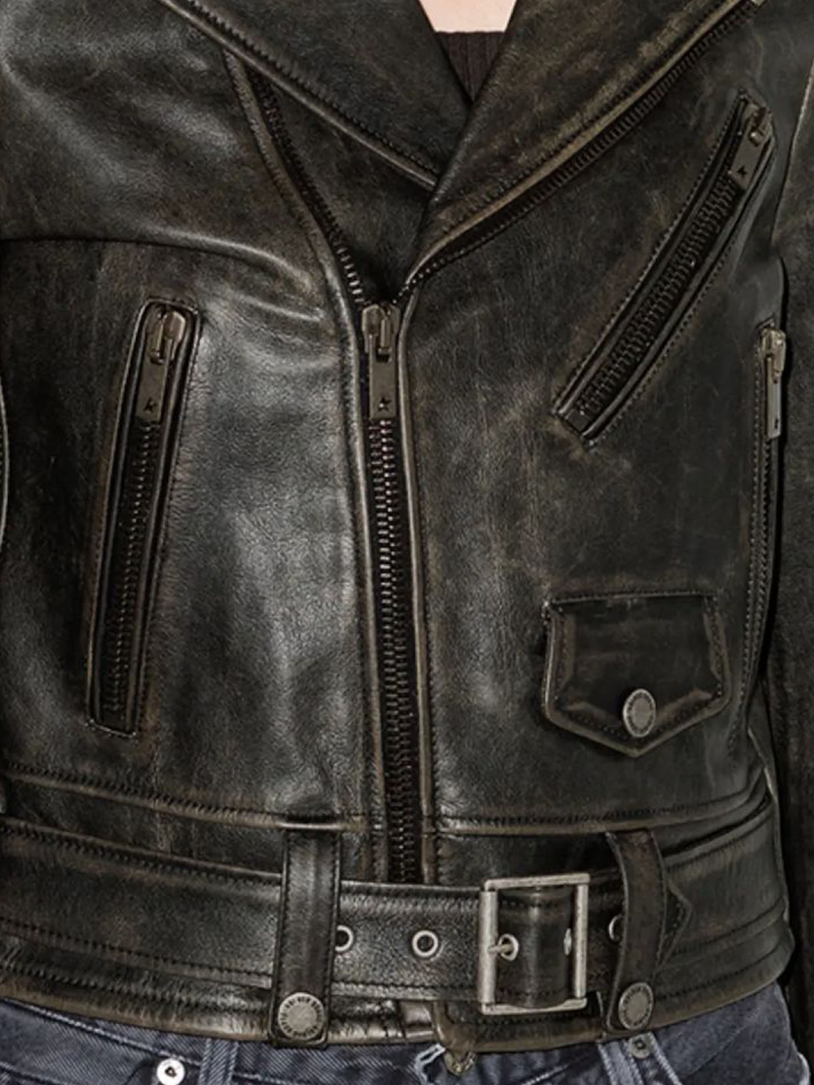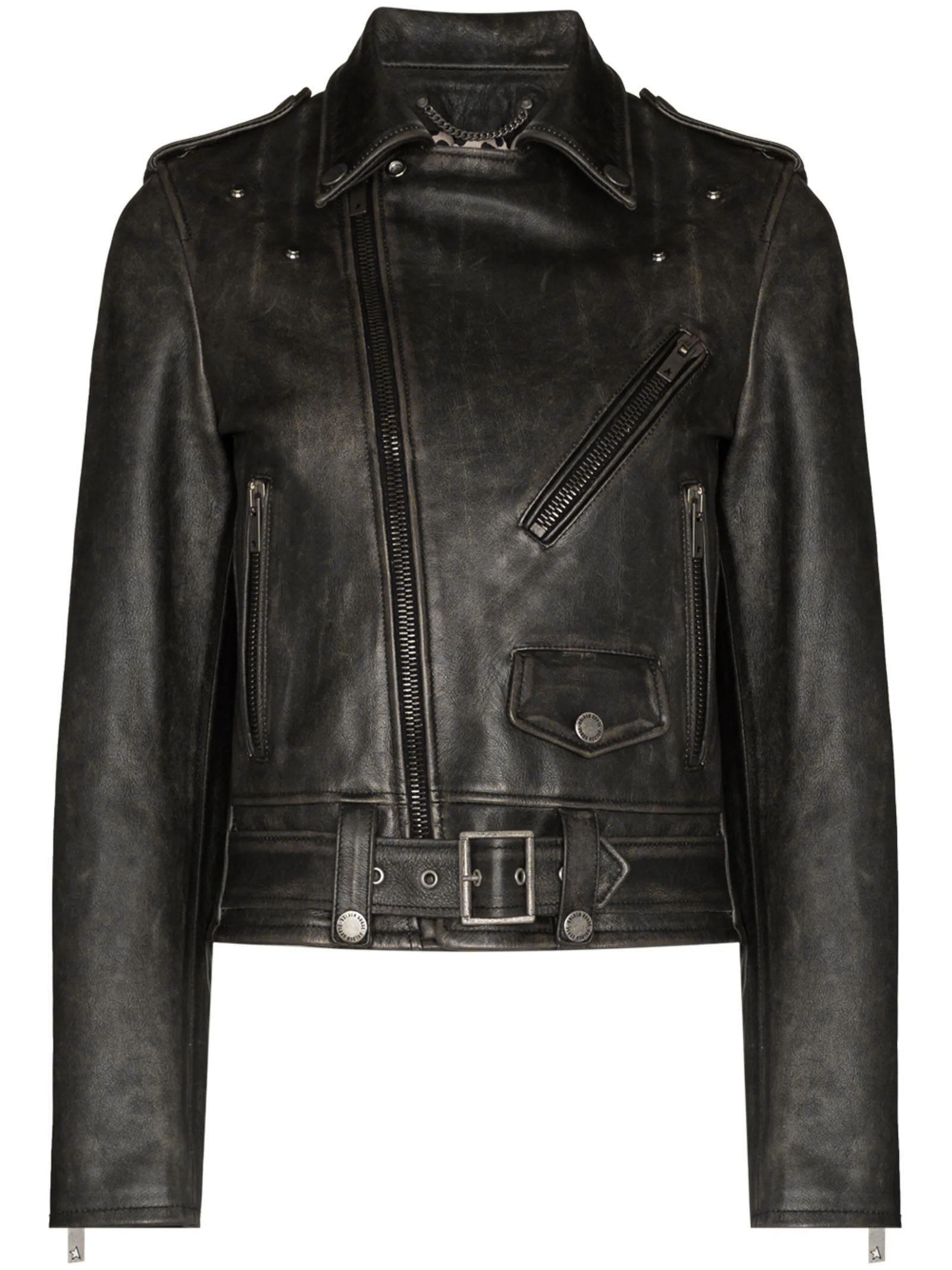 Black leather biker jacket with distressed effect, shoulder pads, lapel collar, off-centre front zip fastening, long sleeves, two side zip pockets and straight hem.