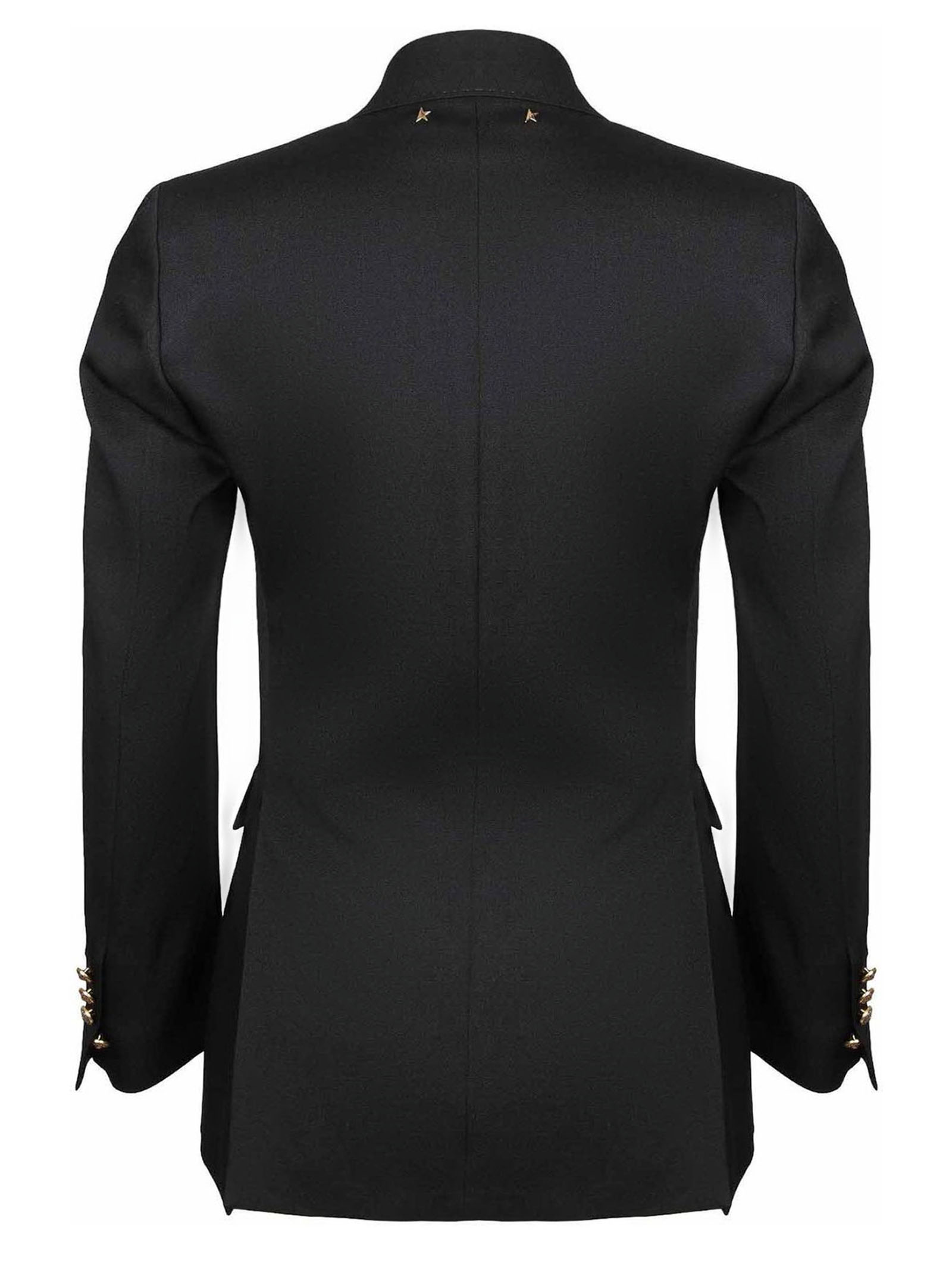 Black virgin wool double-breasted blazer, shoulder pads, peak lapels, long sleeves, chest welt pocket, embossed gold-tone buttons, double-breasted button fastening, two side flap pockets, straight hem
