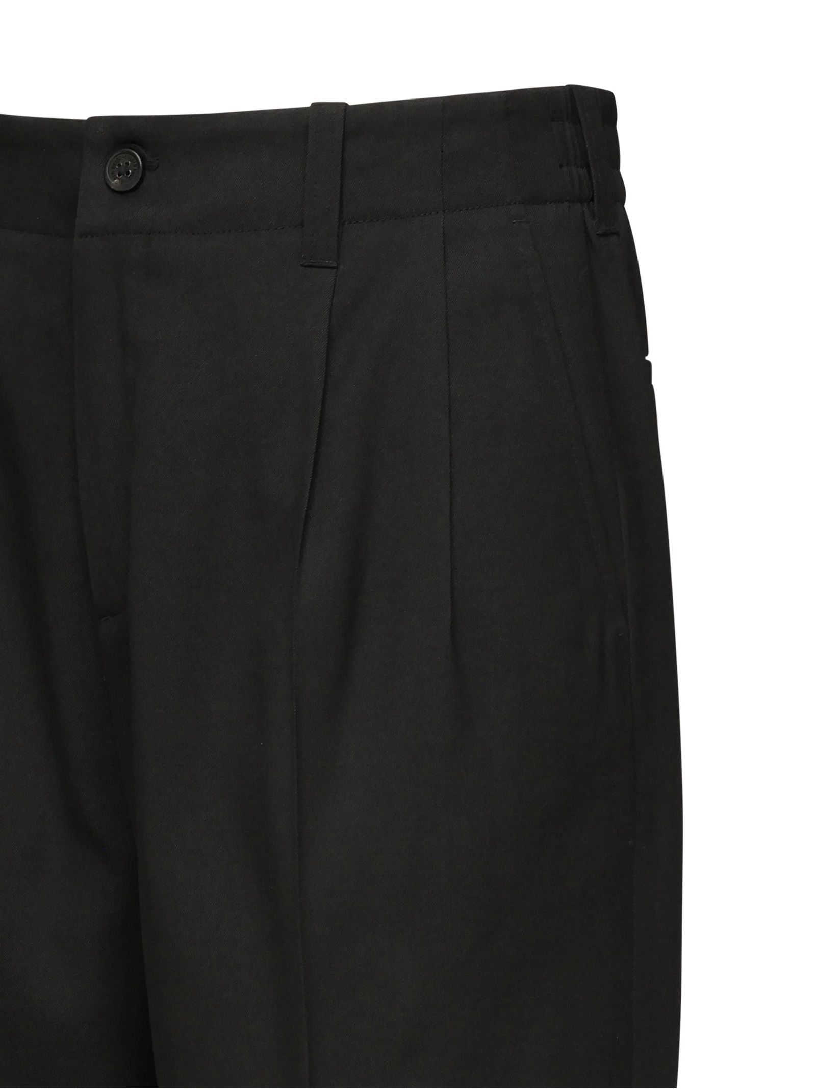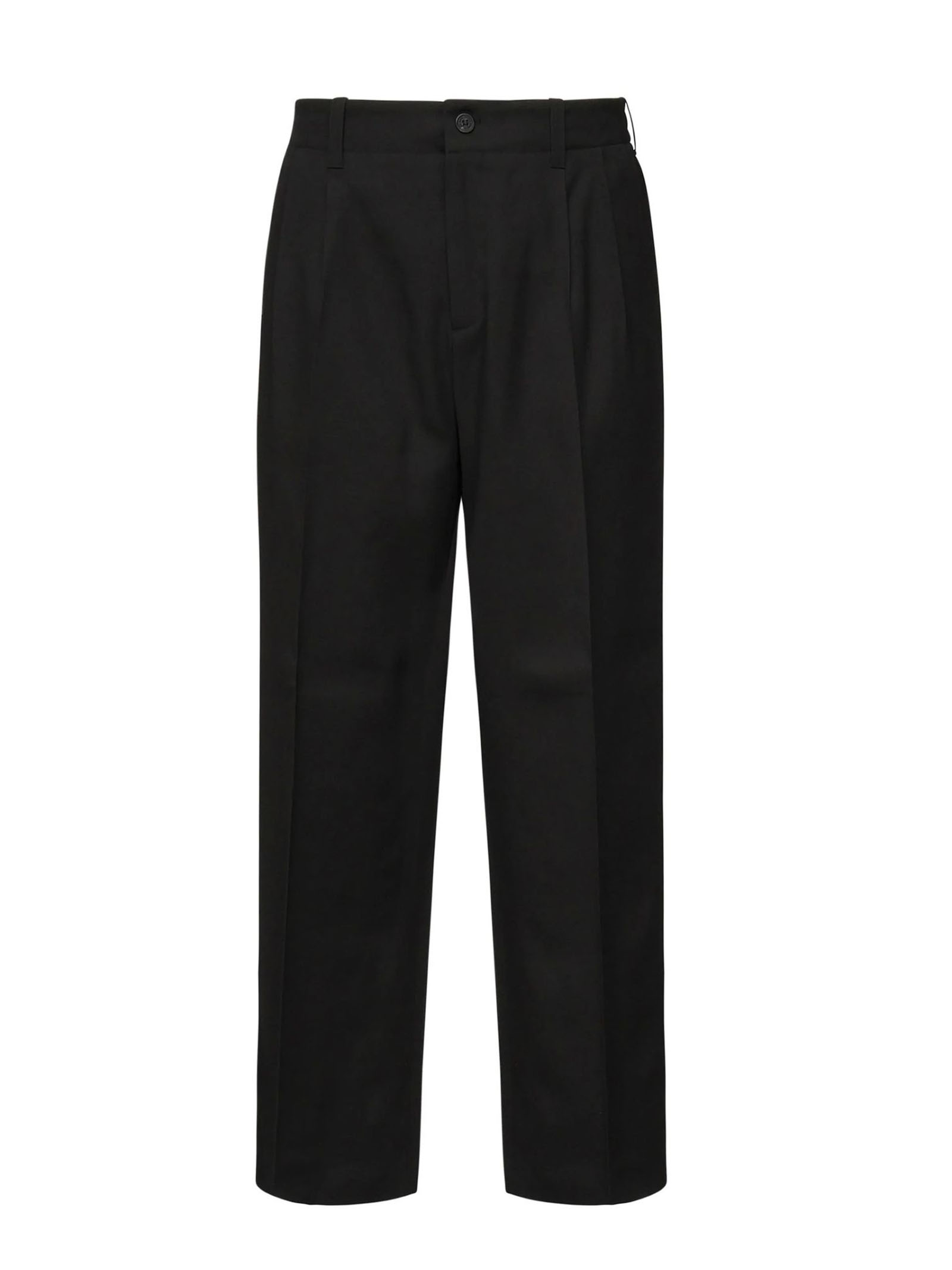 Black wool and viscose blend trousers, with two small stars on the back, four pockets and a wide leg, 80% viscose, 20% wool