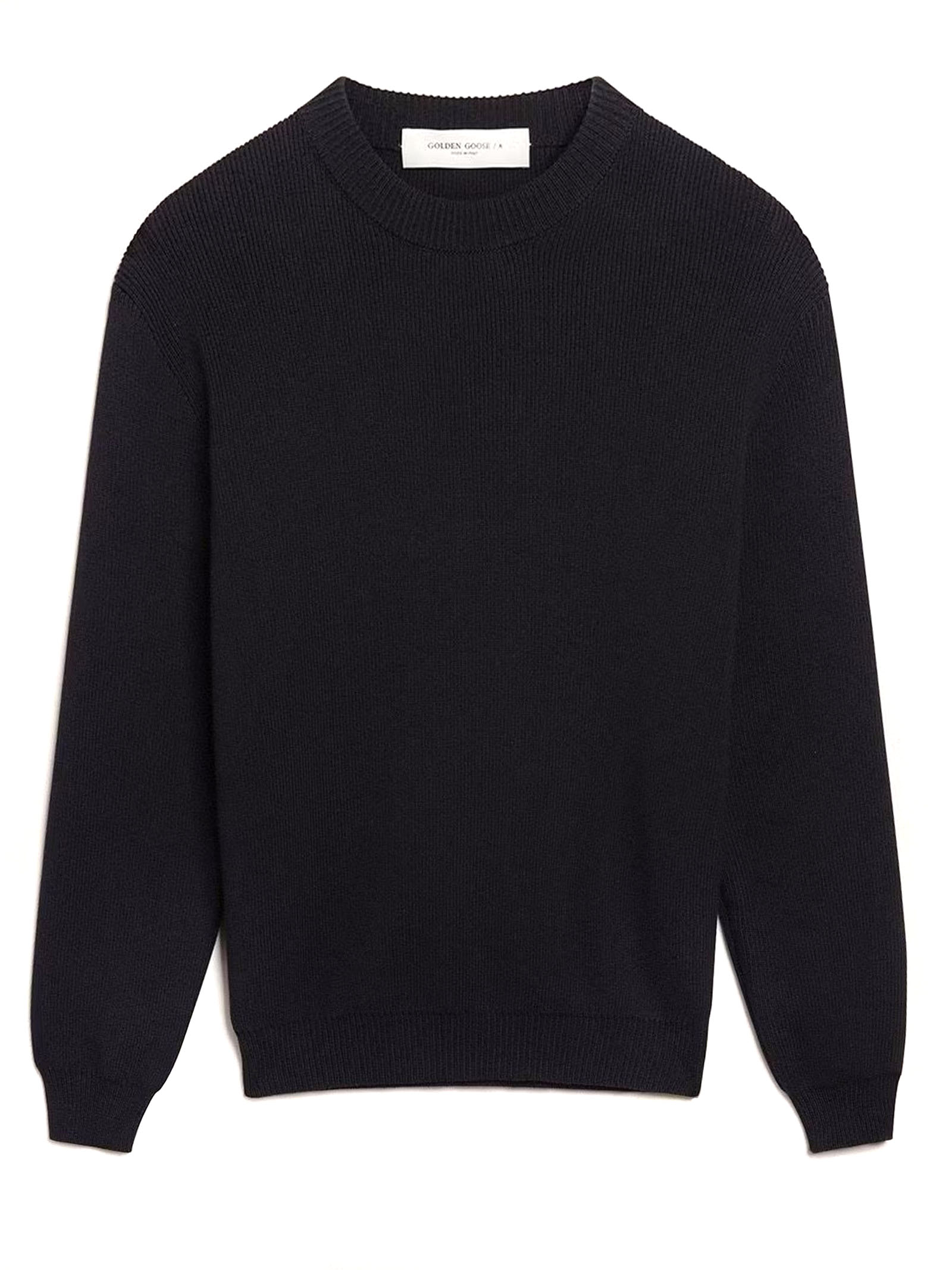Dark blue cotton jumper with round neck, contrasting white logo on the back, double gold star on the back, regular fit, long sleeves