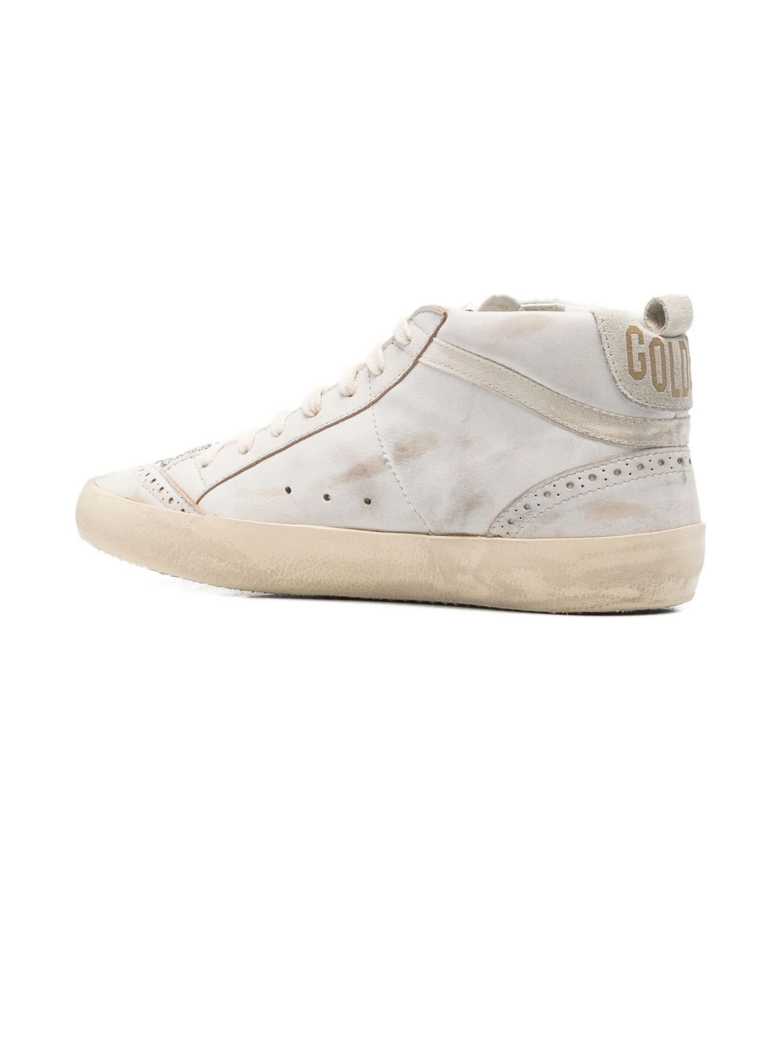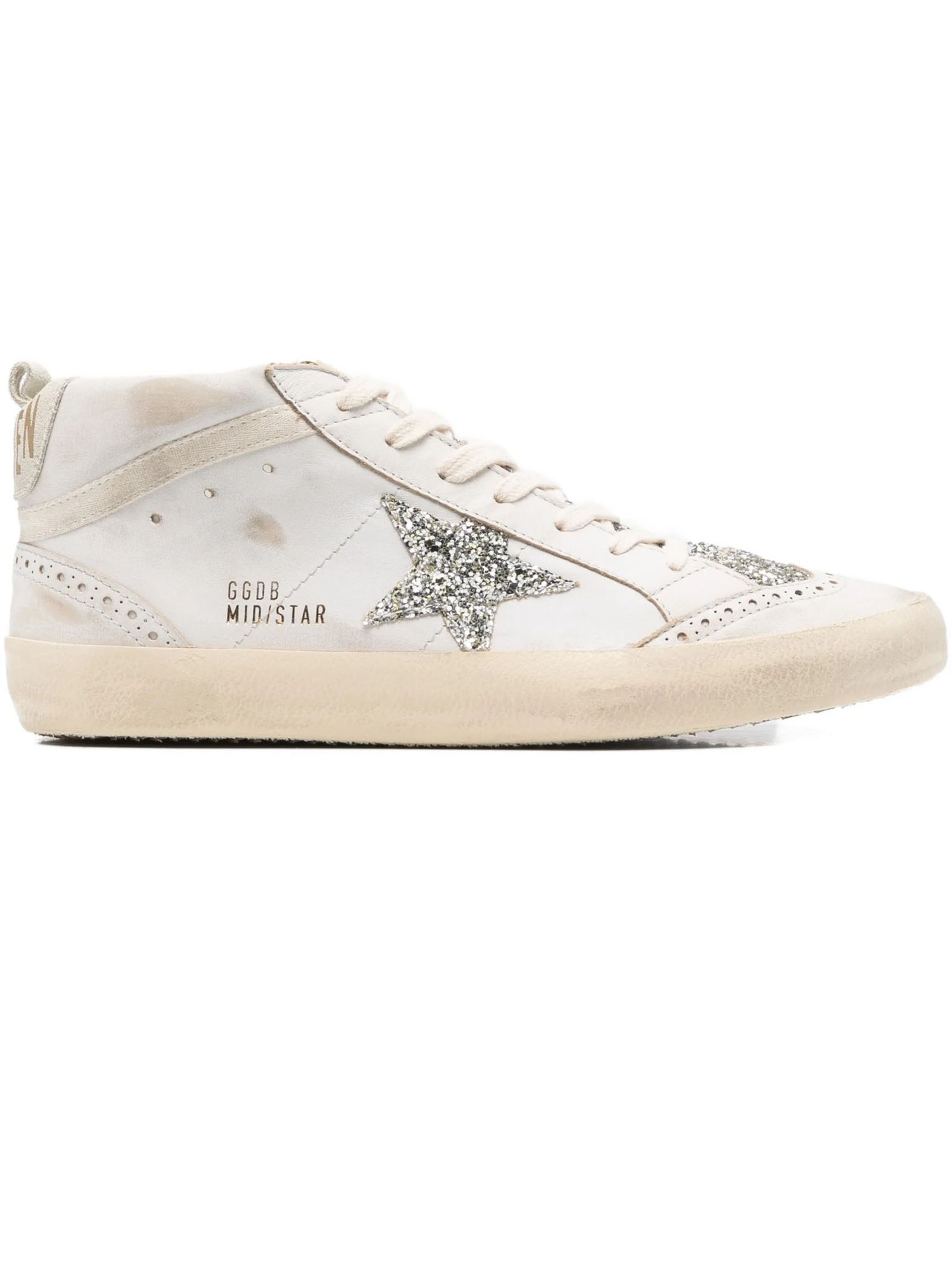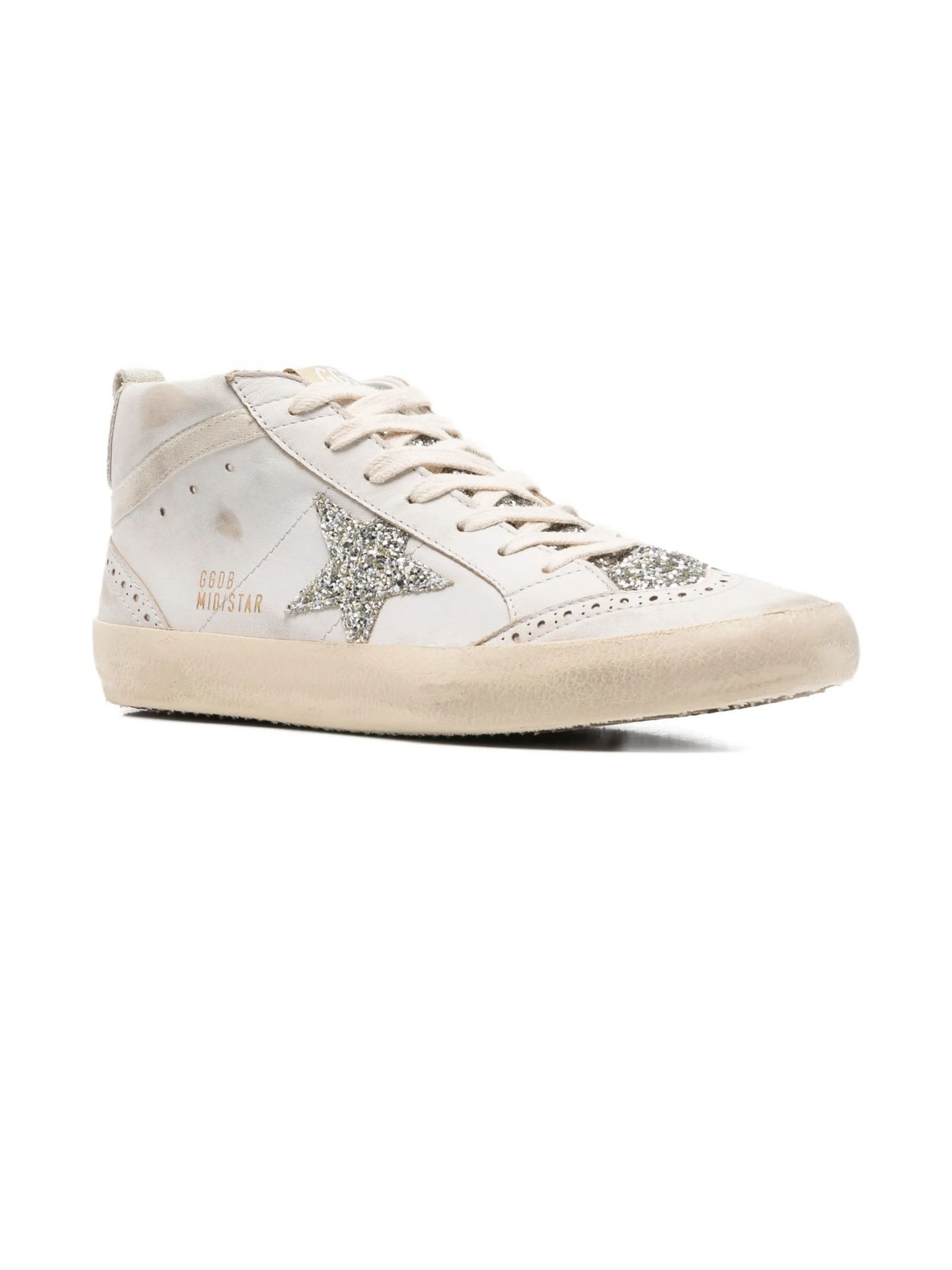 Mid Star sneaker with white nappa leather upper with silver glitter star, suede heel tab, glitter tongue, white laces, vintage treatment, rubber sole