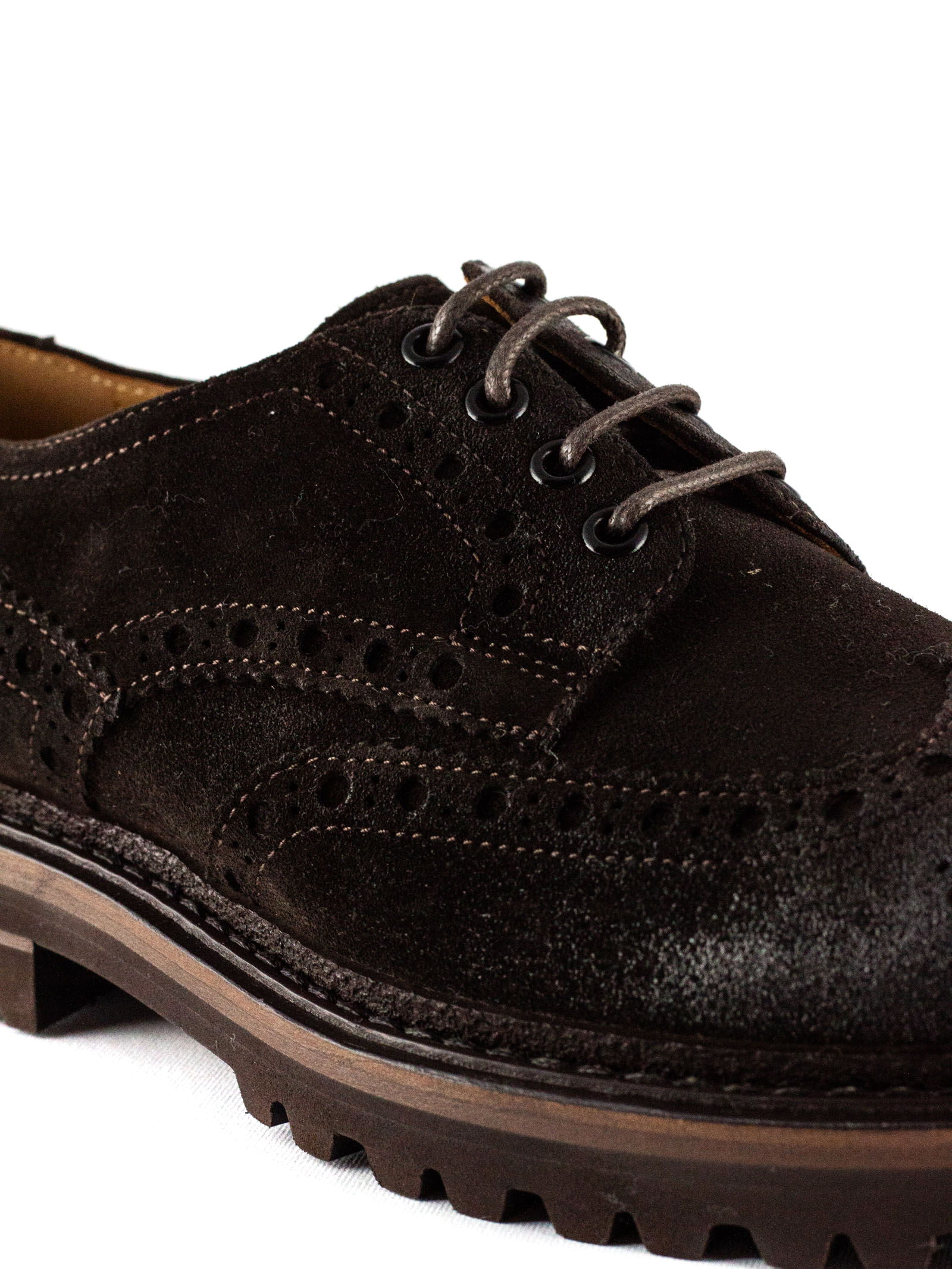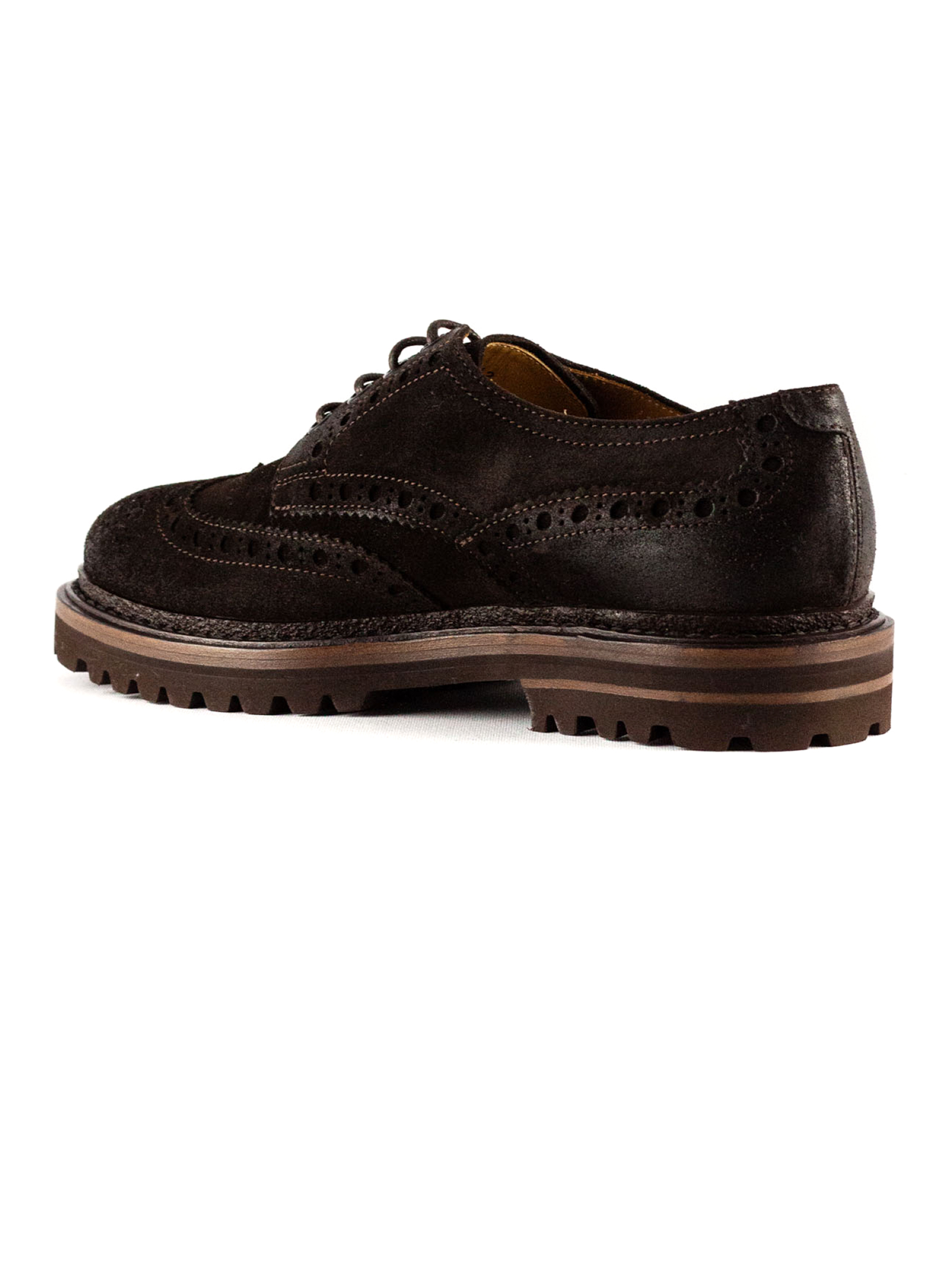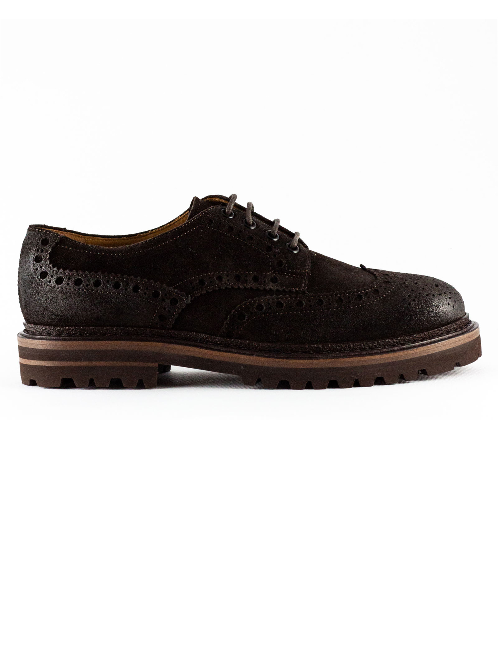 Dark brown suede Derby lace-up shoes with brogue detailing, lace-up closure, and rubber lug sole
