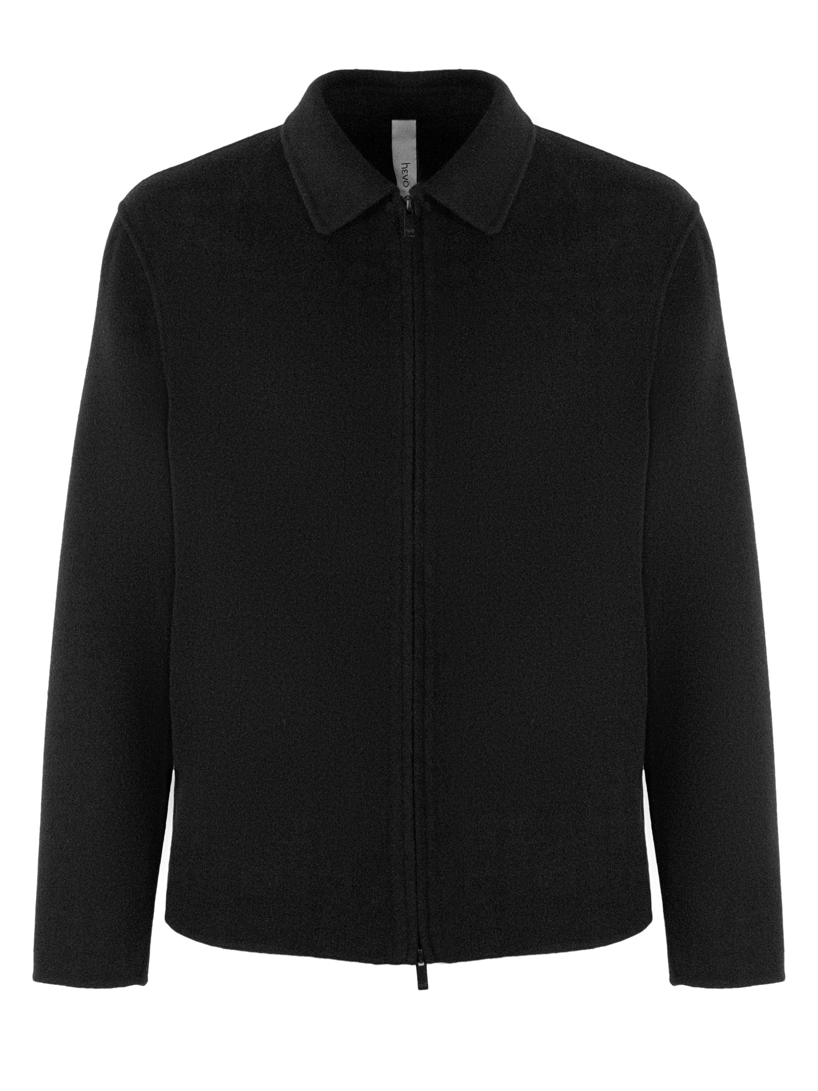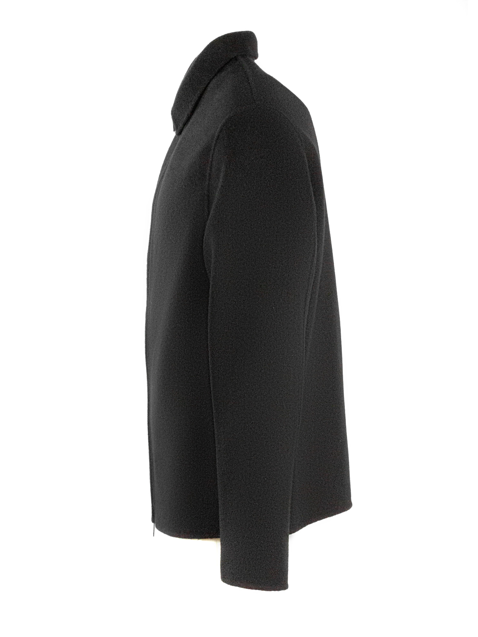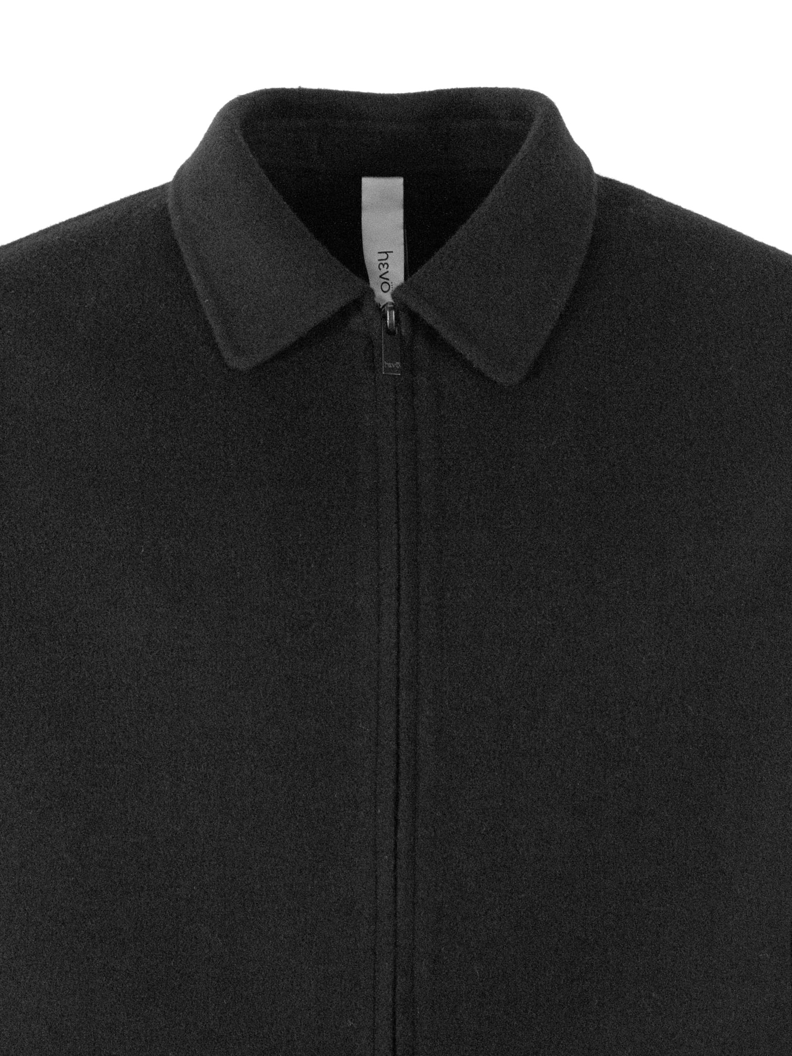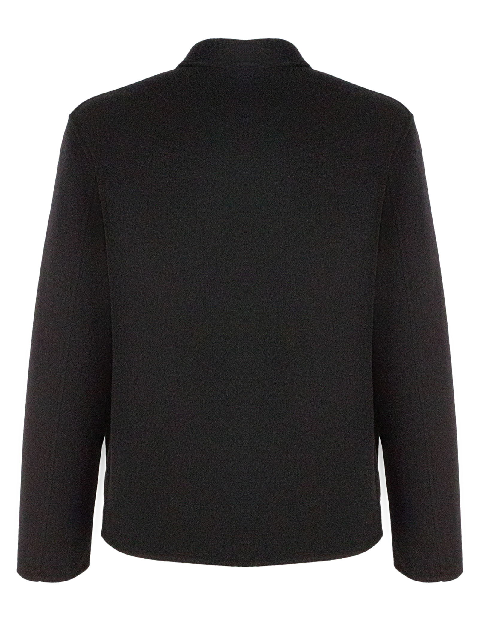Black wool shirt jacket, front closure with double-slider zip, two side pockets, French collar, sleeves with dropped shoulders. 100% Wool, Lining: 100% Viscose