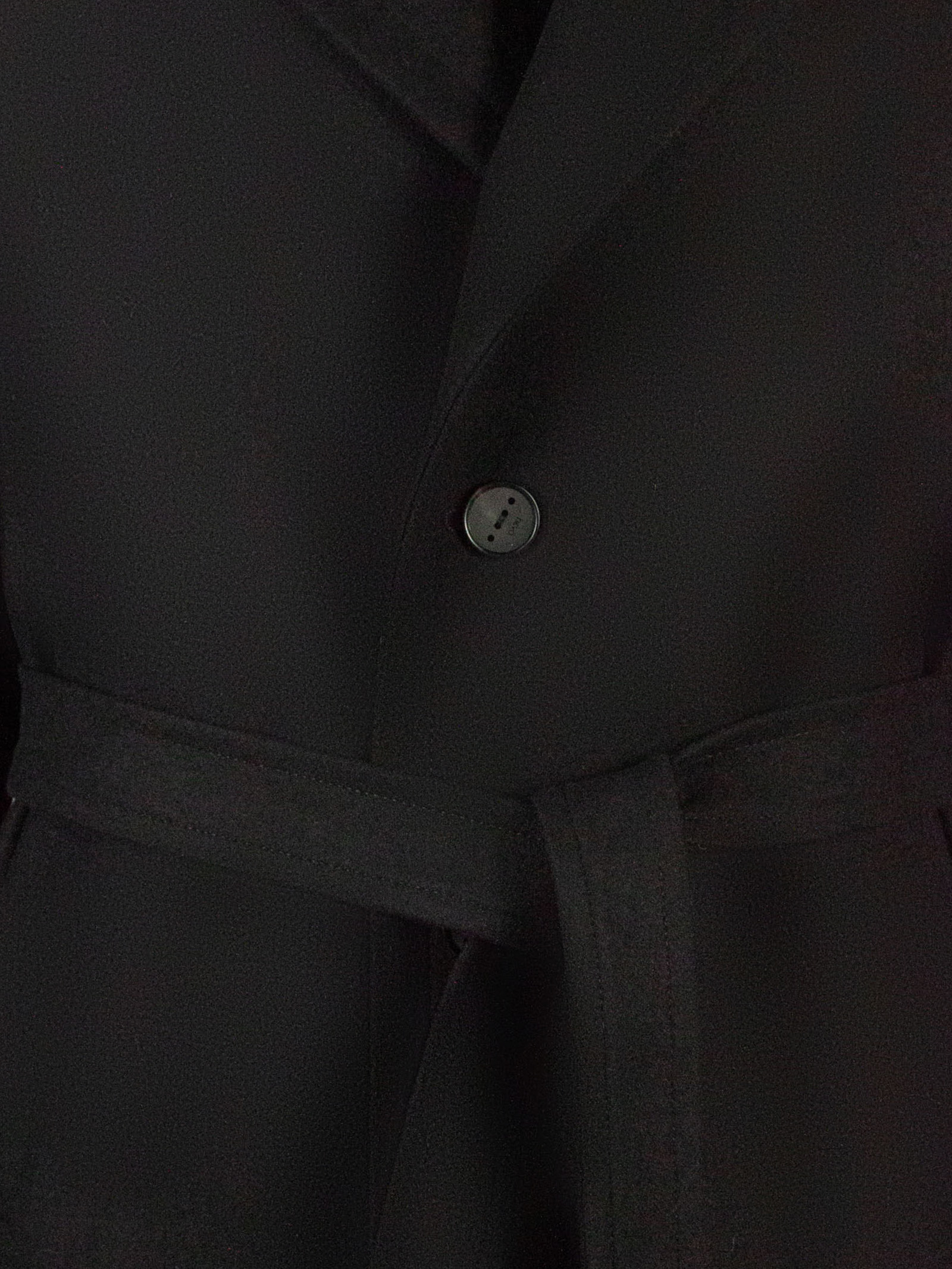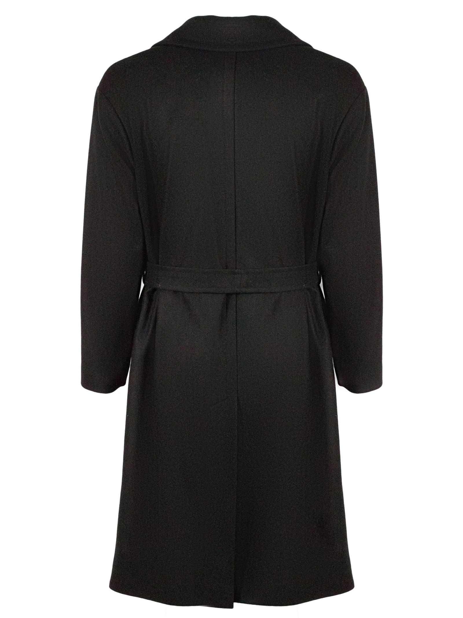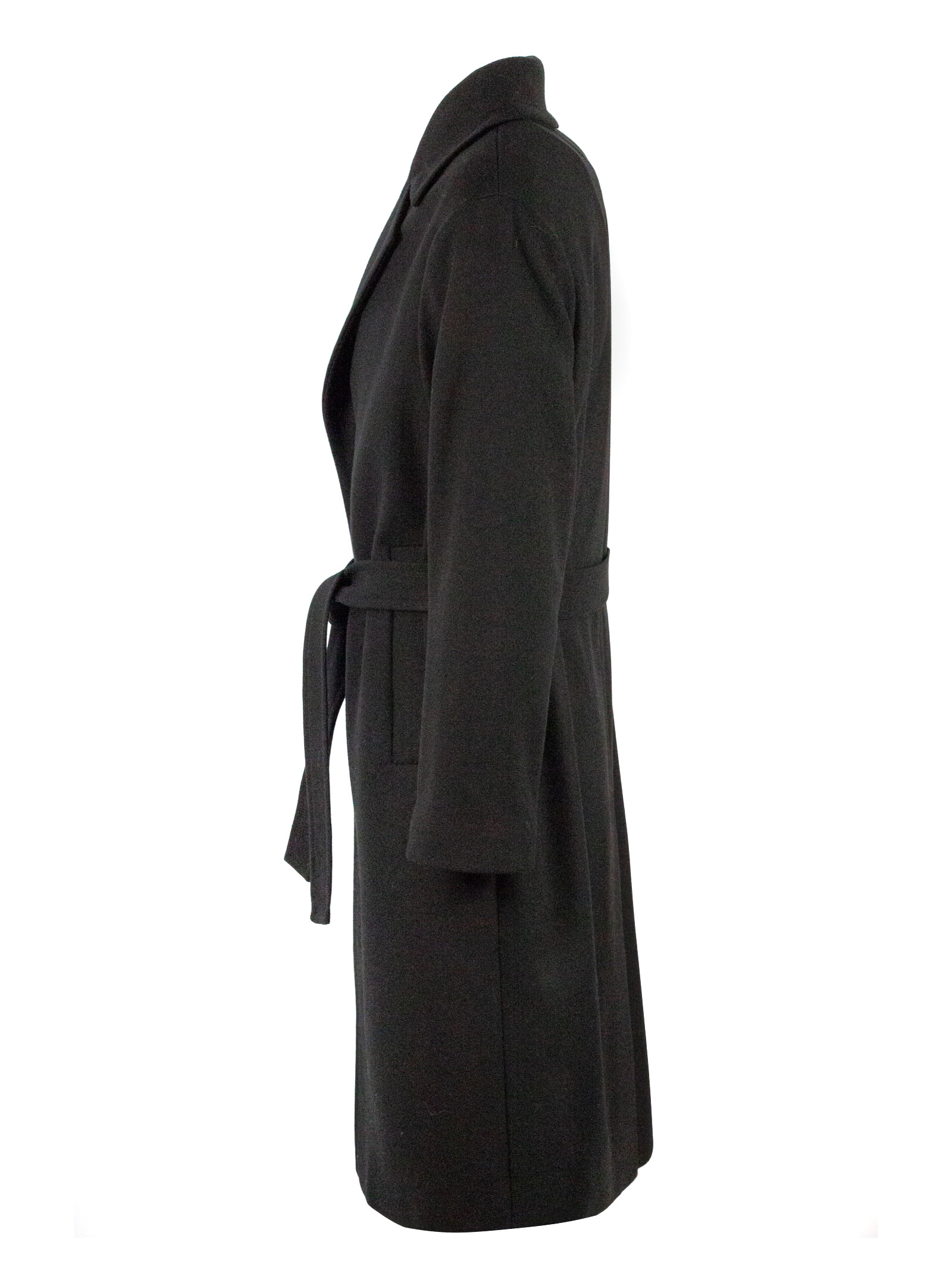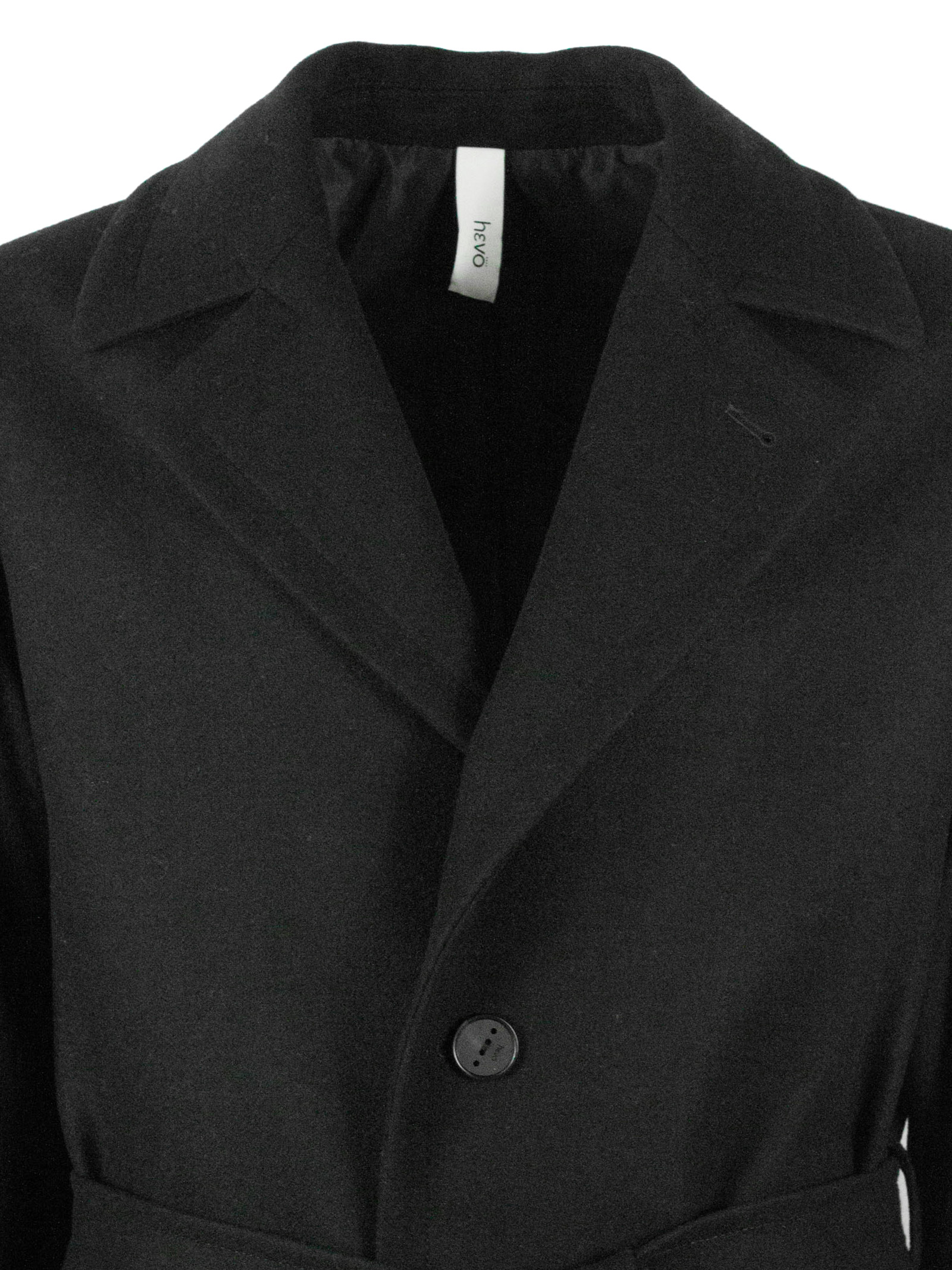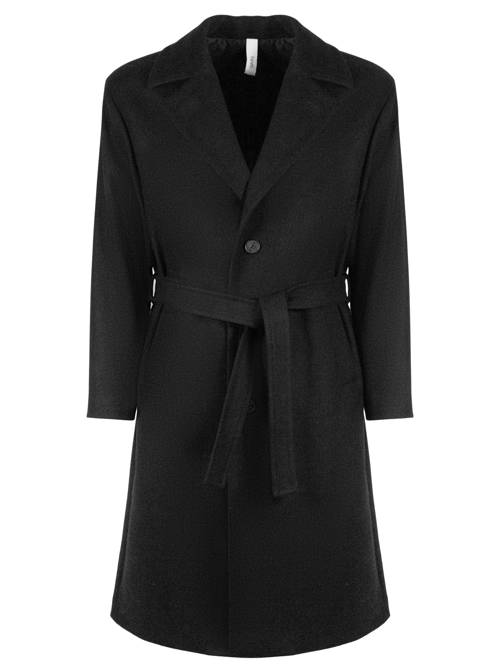 Ostuni coat in black virgin wool blend with single-breasted front closure, classic lapel, belt closure detail, lined, side welt pockets, back vent. 80% Virgin wool, 20% Polyamide, Lining: 100% Polyester