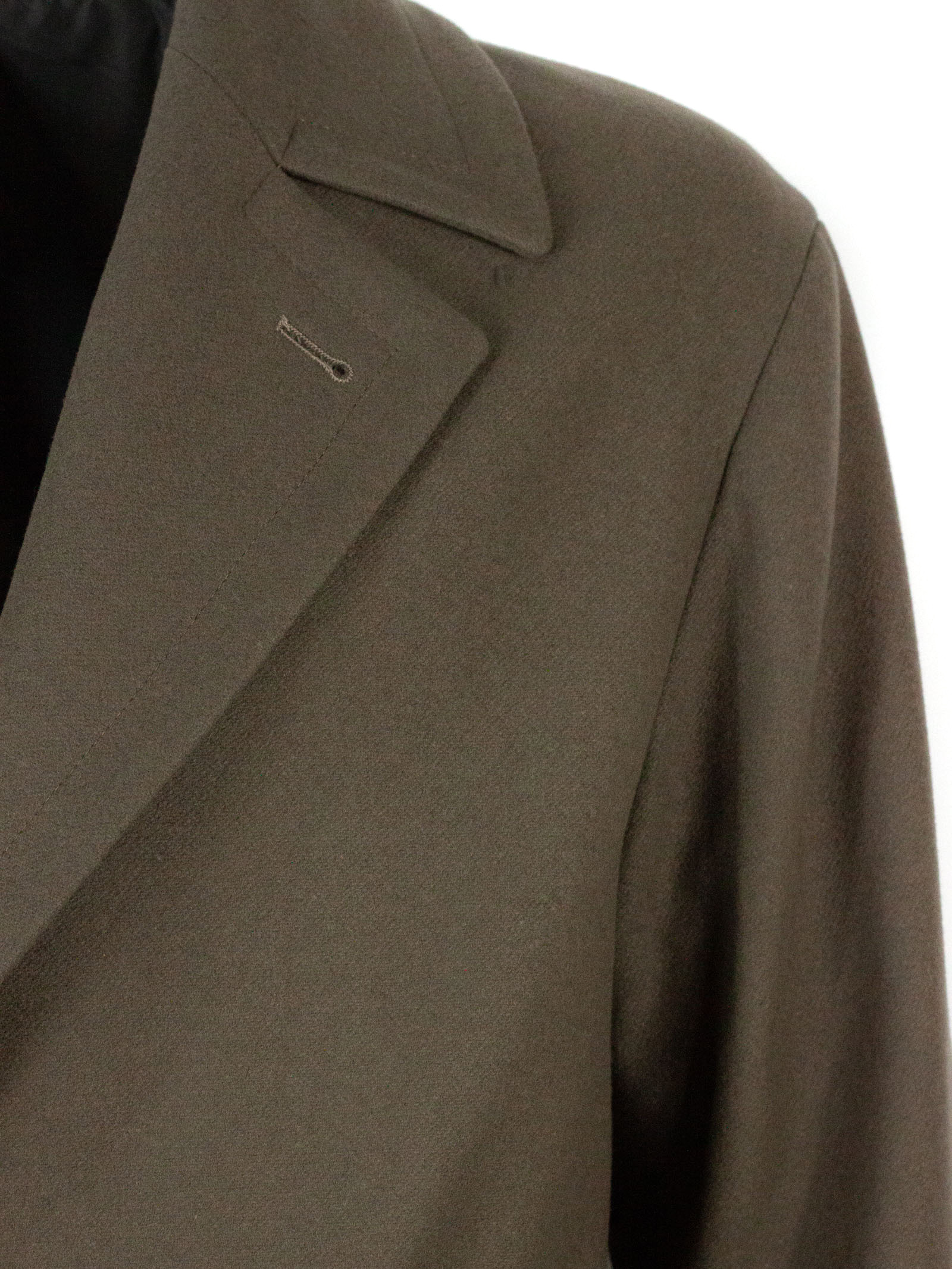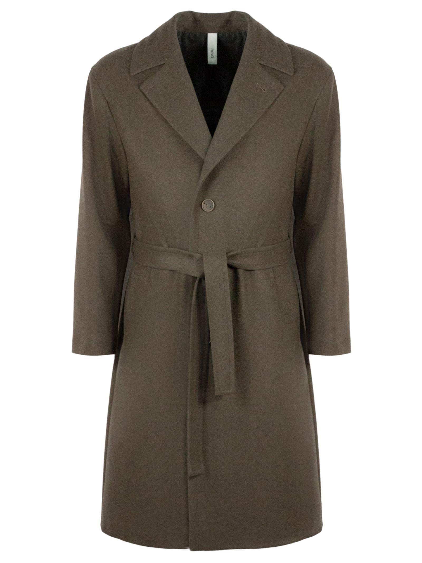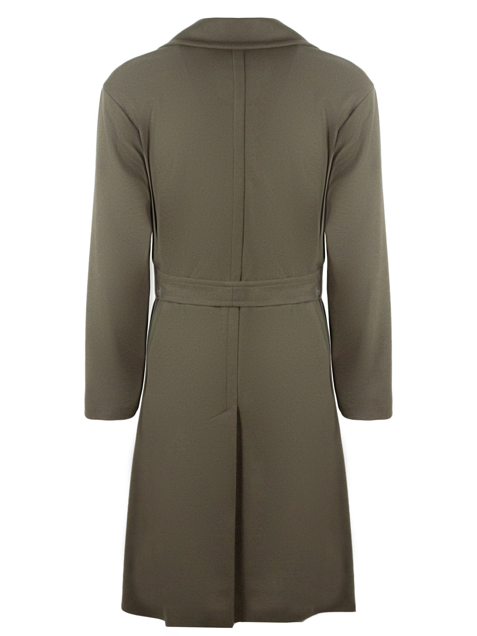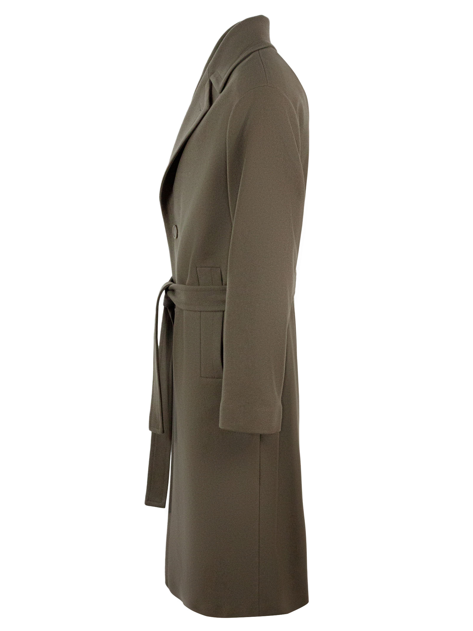 Ostuni coat in mud-grey virgin wool blend with single-breasted front closure, classic lapel, belt closure detail, lined, side welt pockets, back vent. 80% Virgin wool, 20% Polyamide, Lining: 100% Polyester