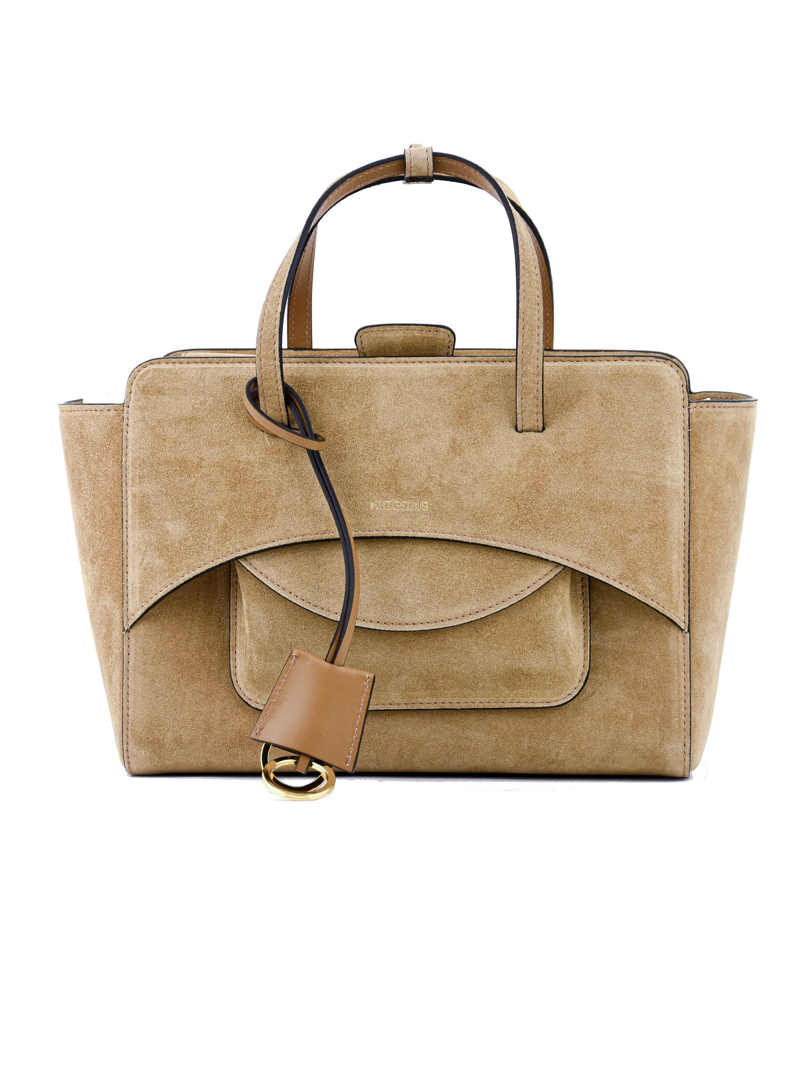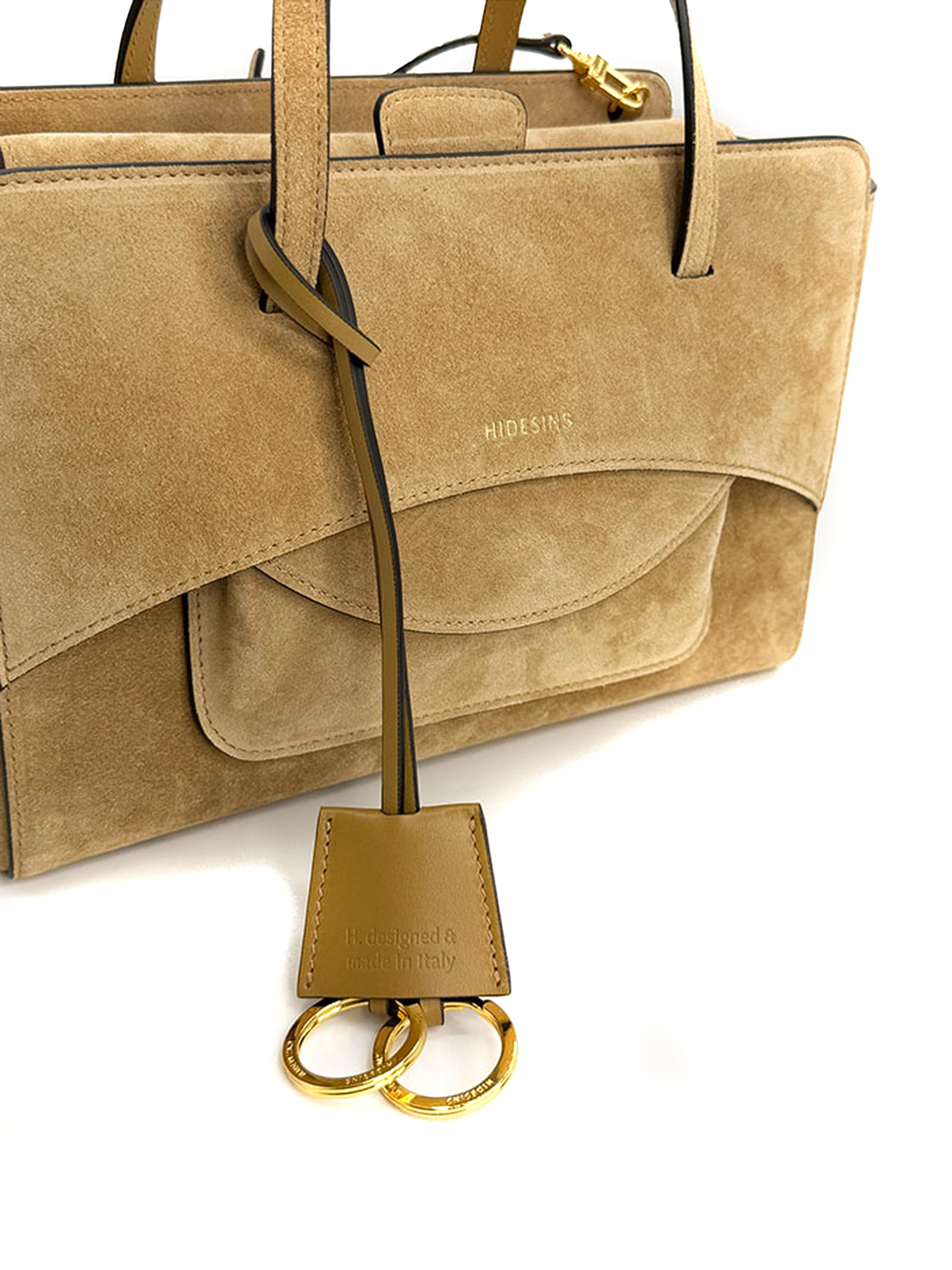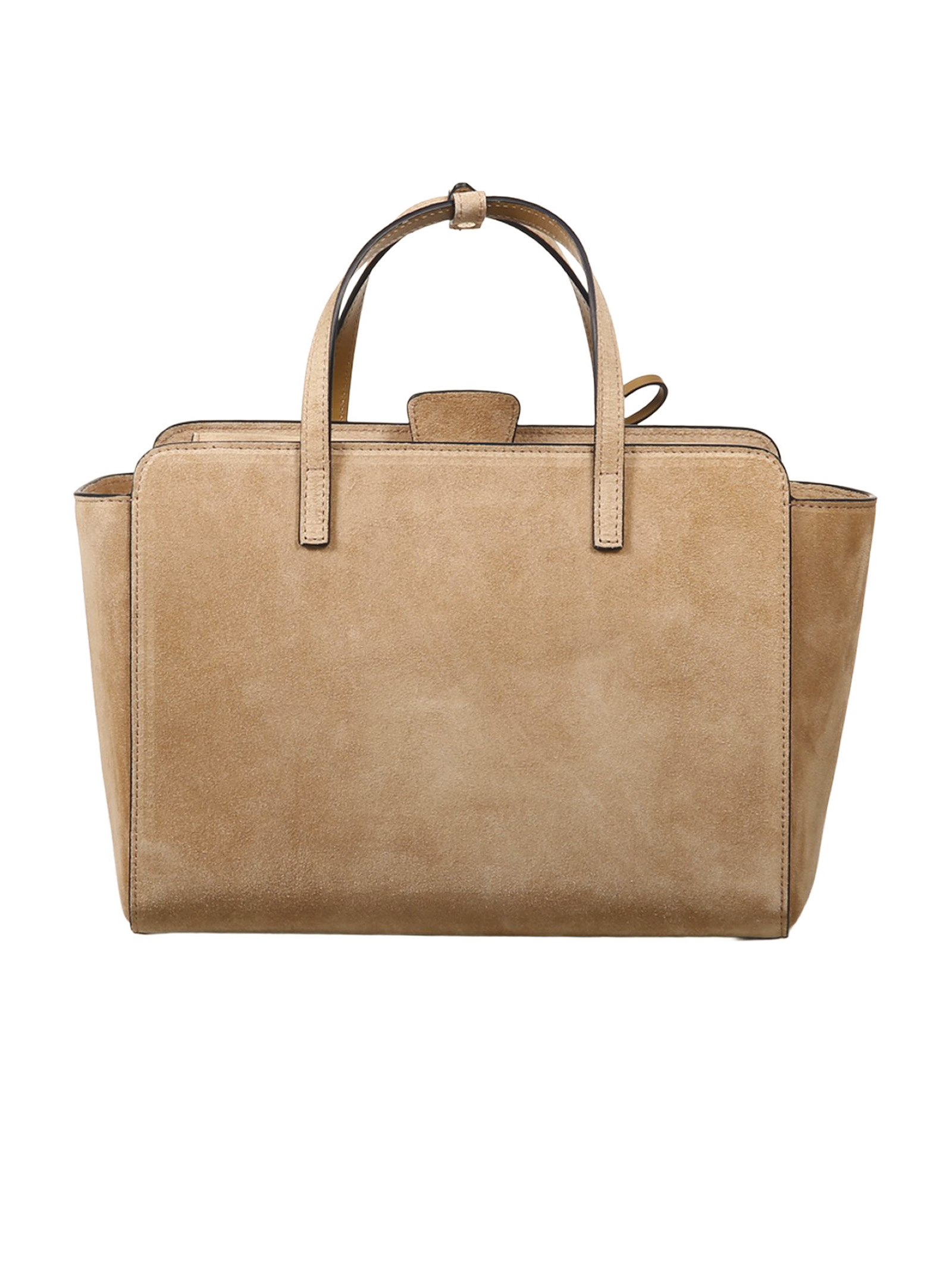 Caramel suede M-shaped flap bag, magnetic fastening, short handles and adjustable, detachable shoulder strap, internal pockets, cotton lining, flat base, gold-plated metal details, Height: 21cm, Width: 34cm, Depth: 12cm