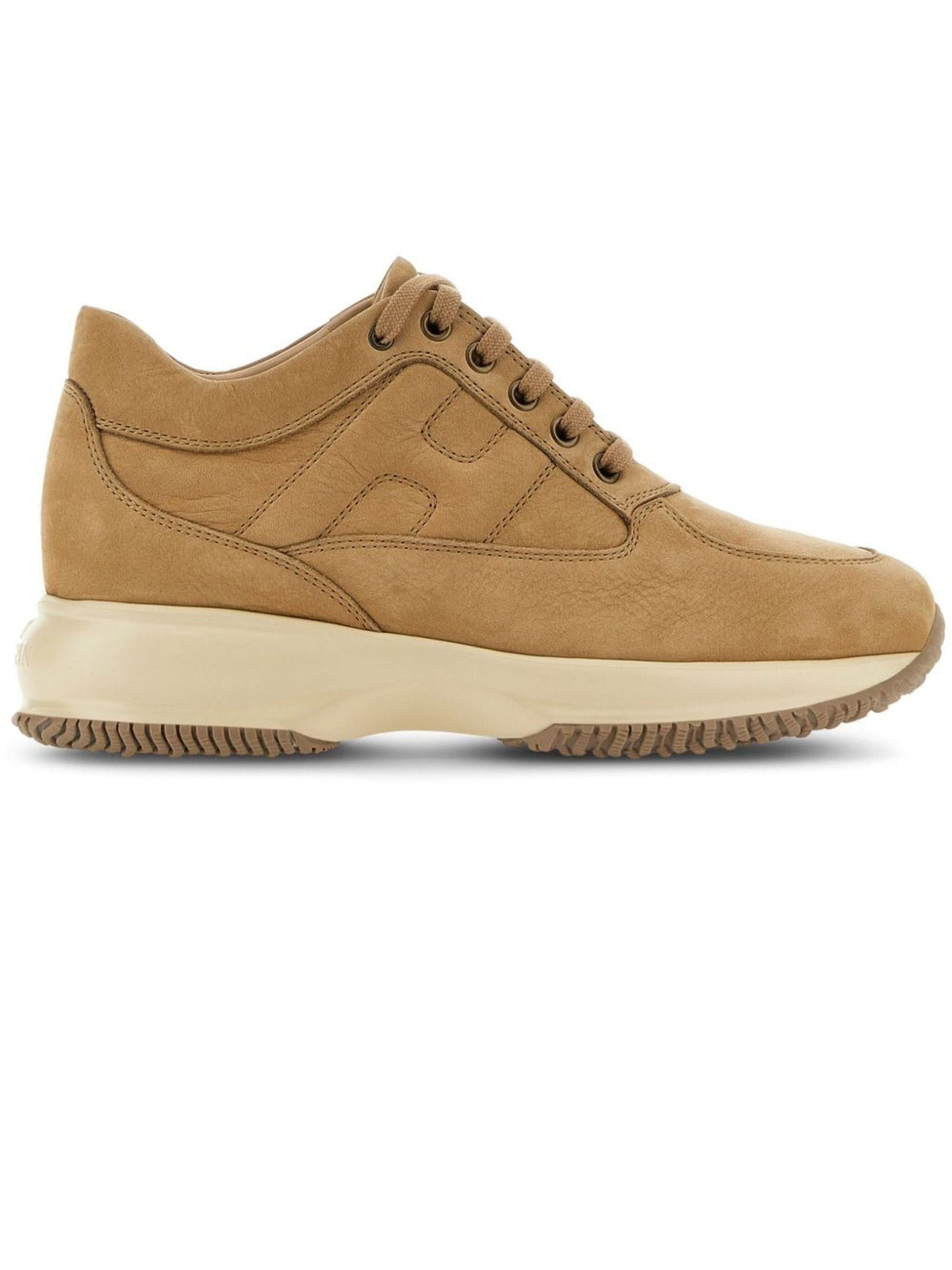 camel brown calf leather panelled design suede panels embroidered logo to the side logo patch at the tongue almond toe front lace-up fastening branded leather insole rubber sole