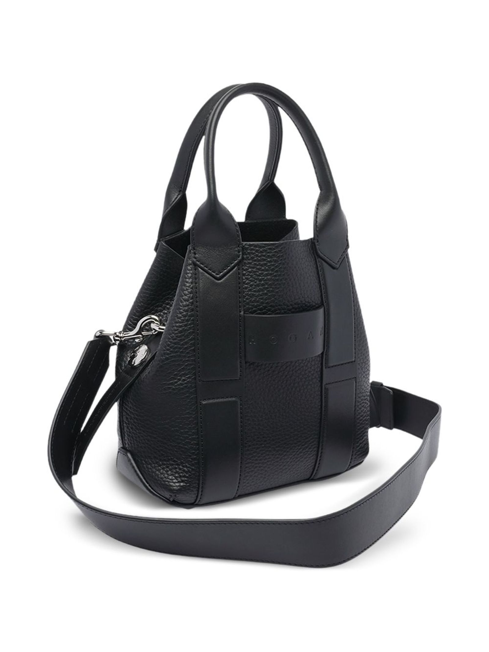 black calf leather concealed top closure two top handles detachable shoulder strap debossed logo