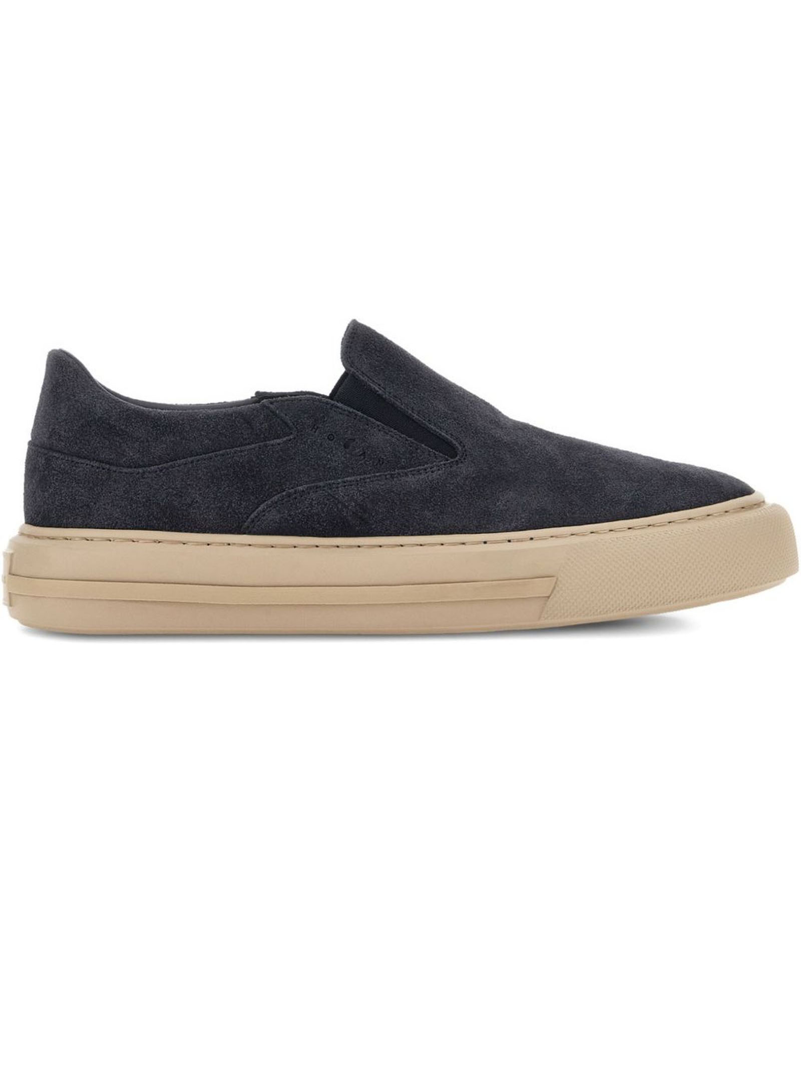 midnight blue slip-on style elasticated side panels contrasting rubber sole debossed logo to the side