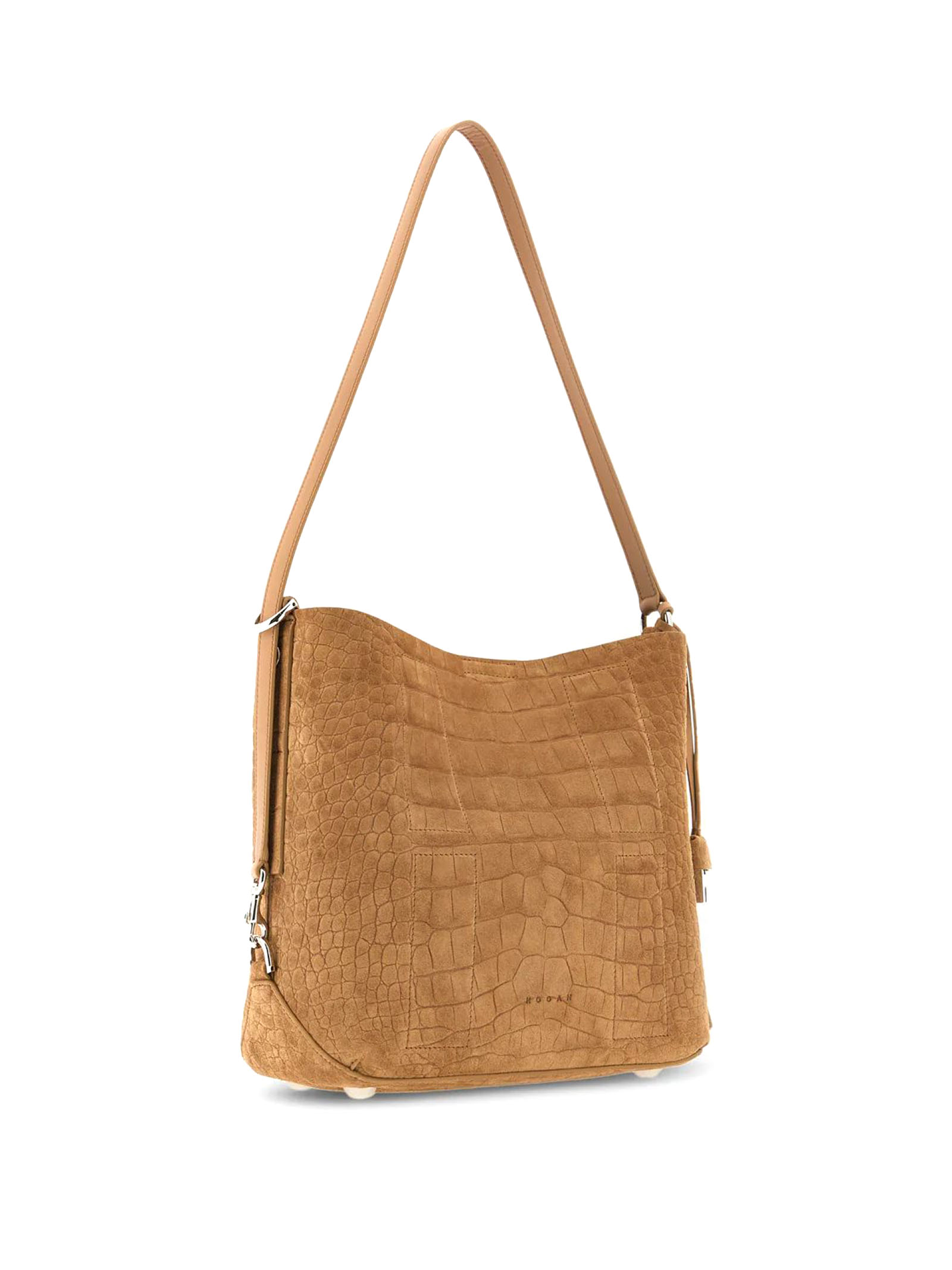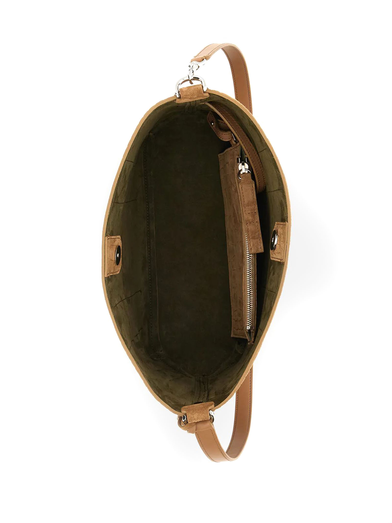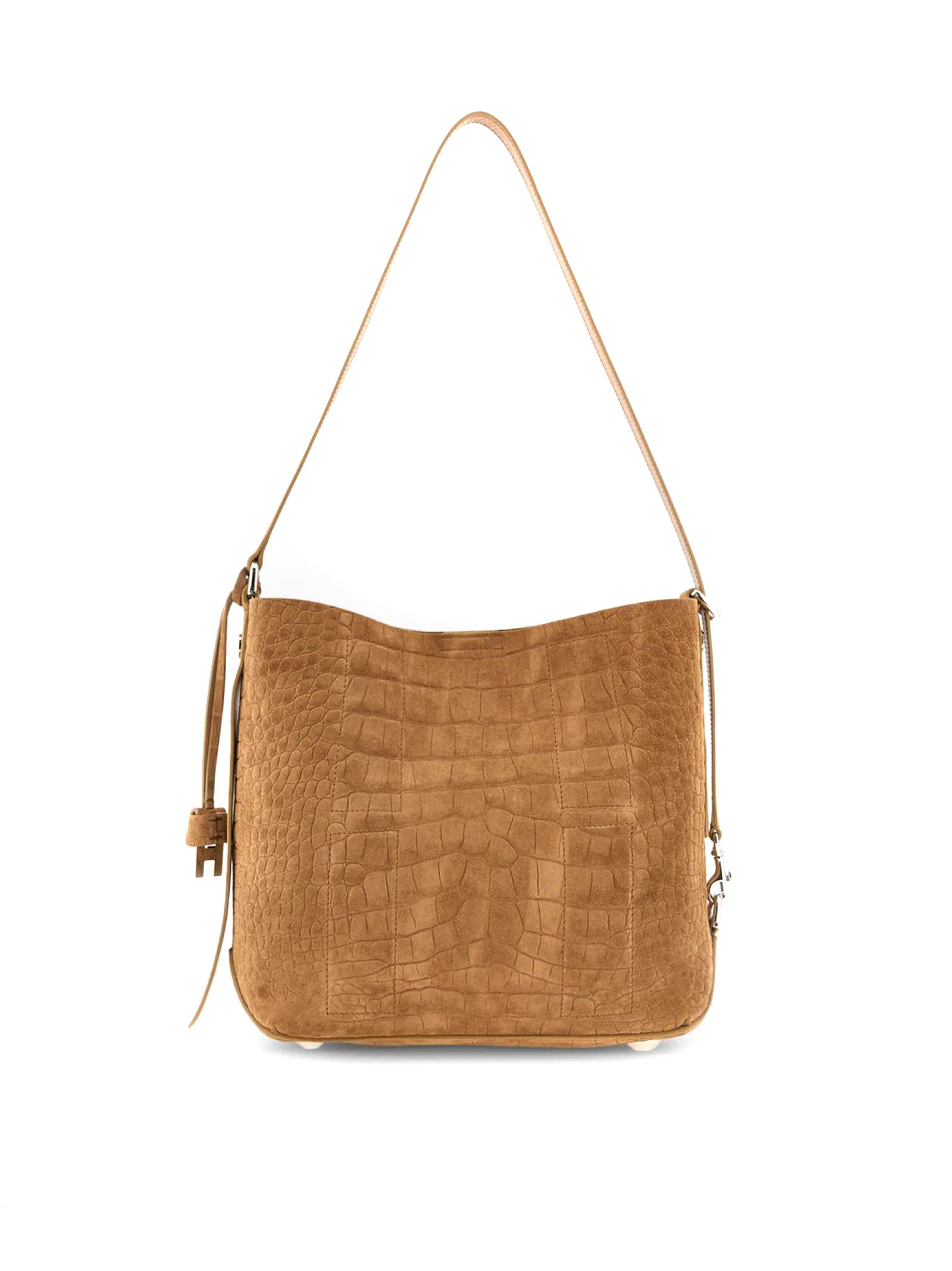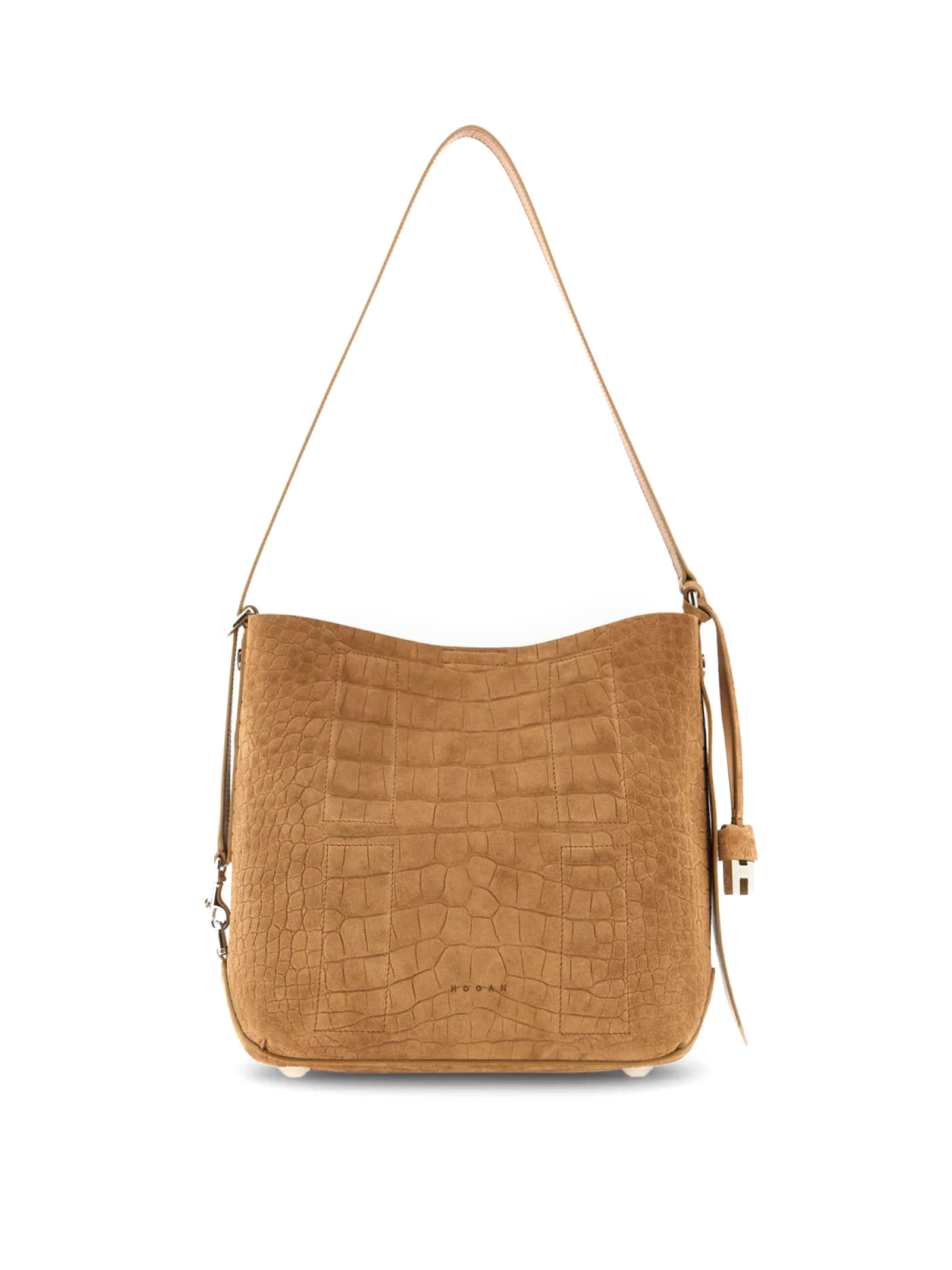 Brown suede hobo bag, crocodile print, smooth leather inserts, Hogan logo embossed on the front, pendant with coated metal H charm, dimensions: 28 x 26 x 11 cm, versatile adjustable shoulder strap, magnetic button closure, removable internal pouch, metal