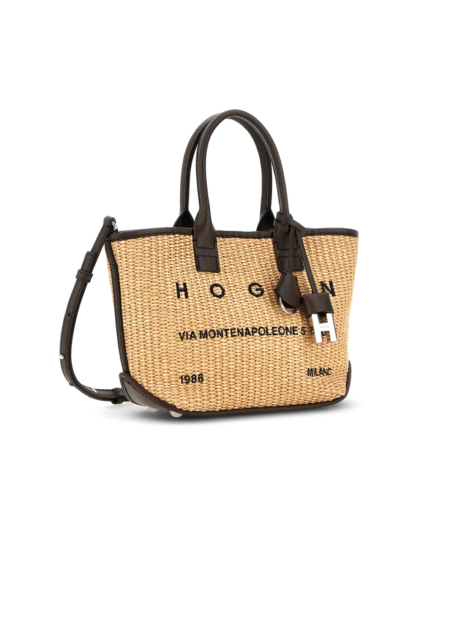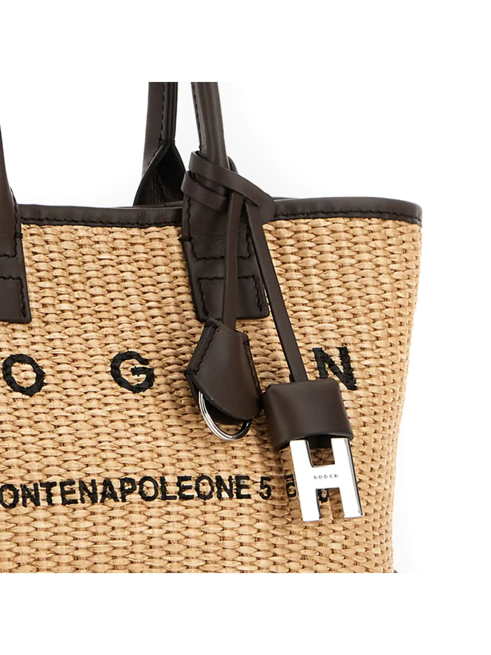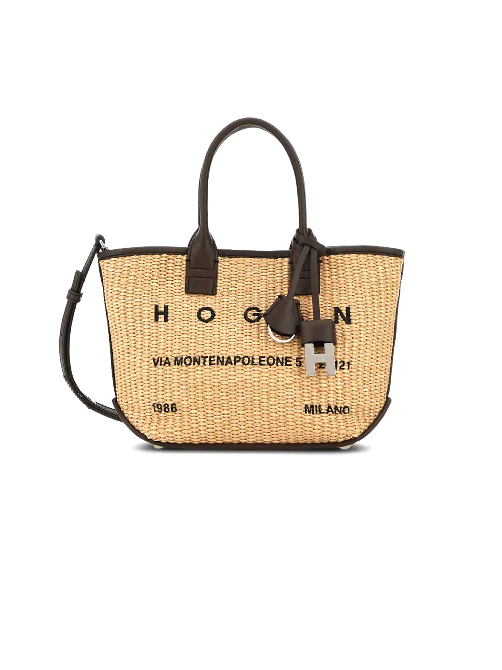 Hogan Address Shopping Bag Mini Brown Ivory, Item crafted in raffia, Smooth leather inserts, Printed Via Monte Napoleone address logo, Dimensions: 23 x 17 x 8 cm, Fixed handles, Adjustable and removable shoulder strap, Magnetic button closure, Internal zi