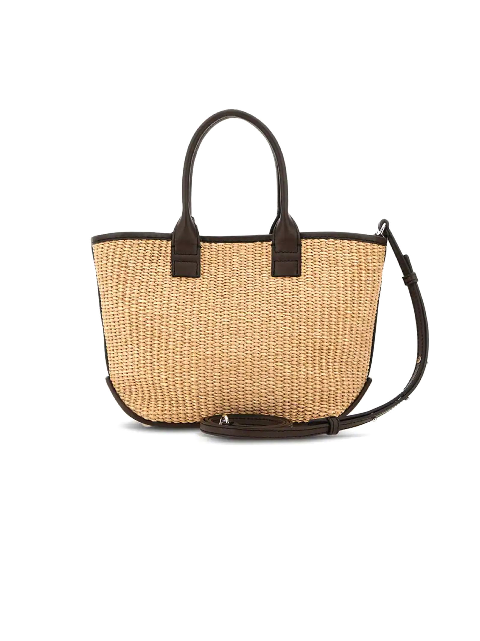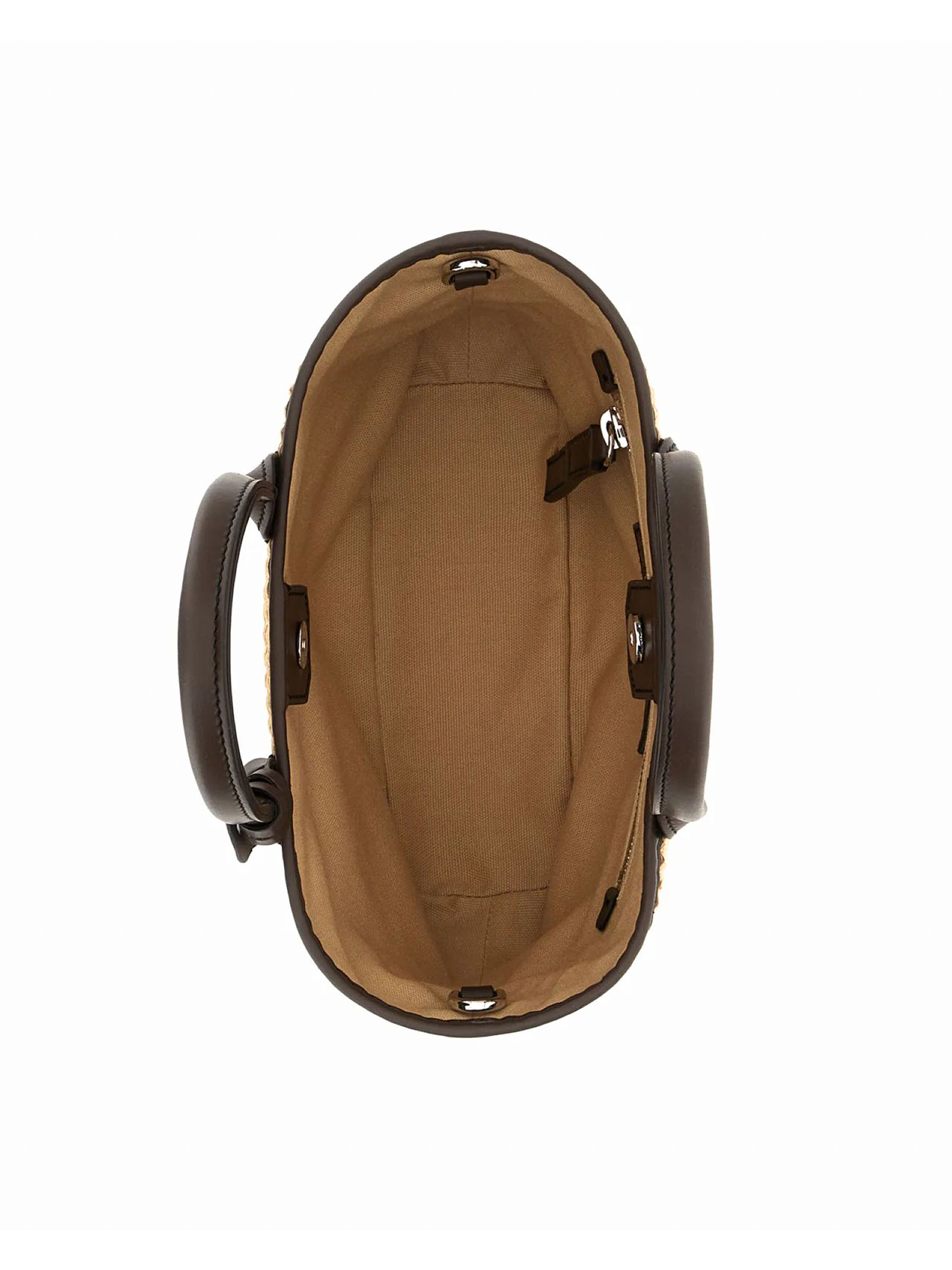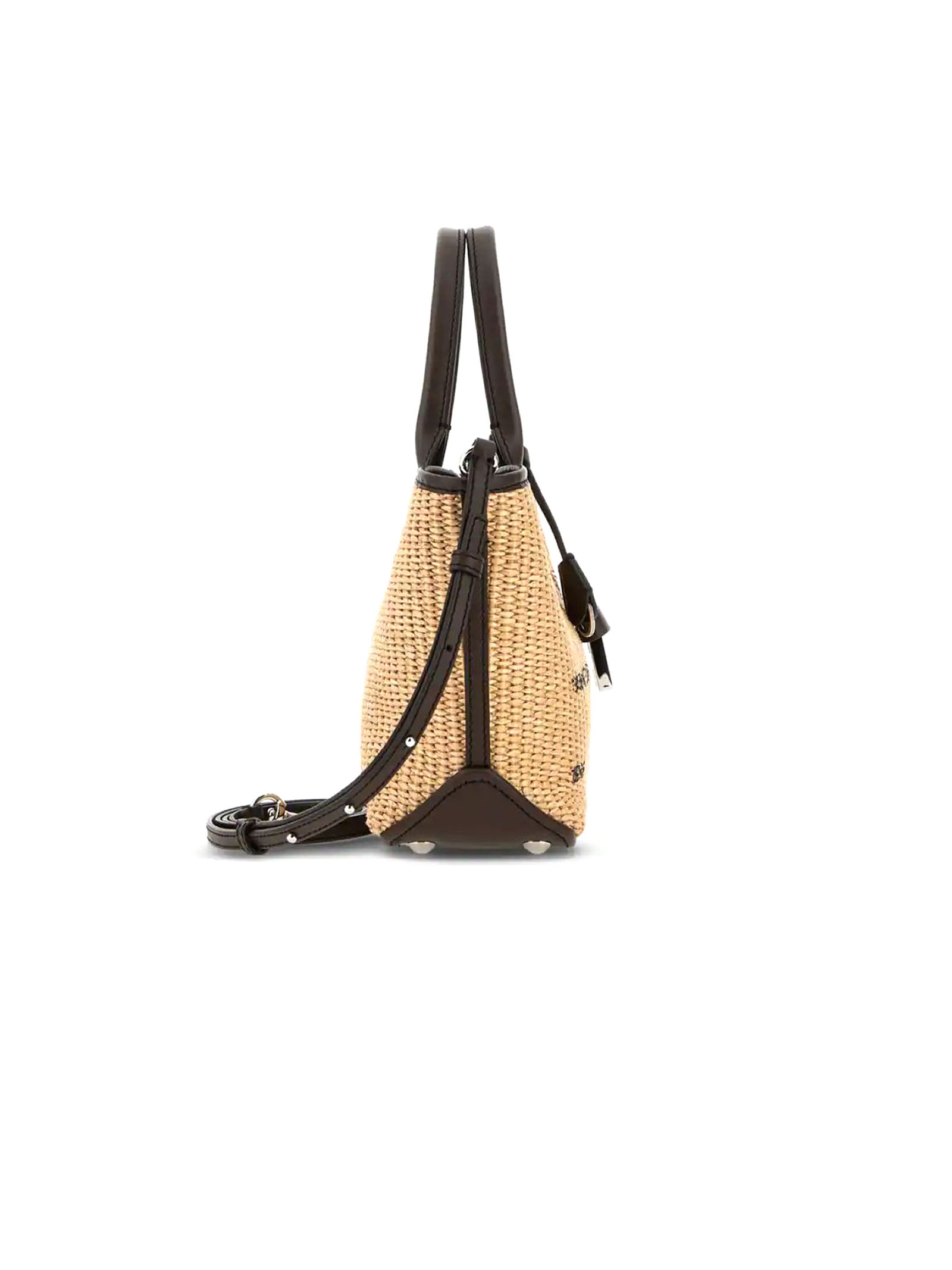 Hogan Address Shopping Bag Mini Brown Ivory, Item crafted in raffia, Smooth leather inserts, Printed Via Monte Napoleone address logo, Dimensions: 23 x 17 x 8 cm, Fixed handles, Adjustable and removable shoulder strap, Magnetic button closure, Internal zi