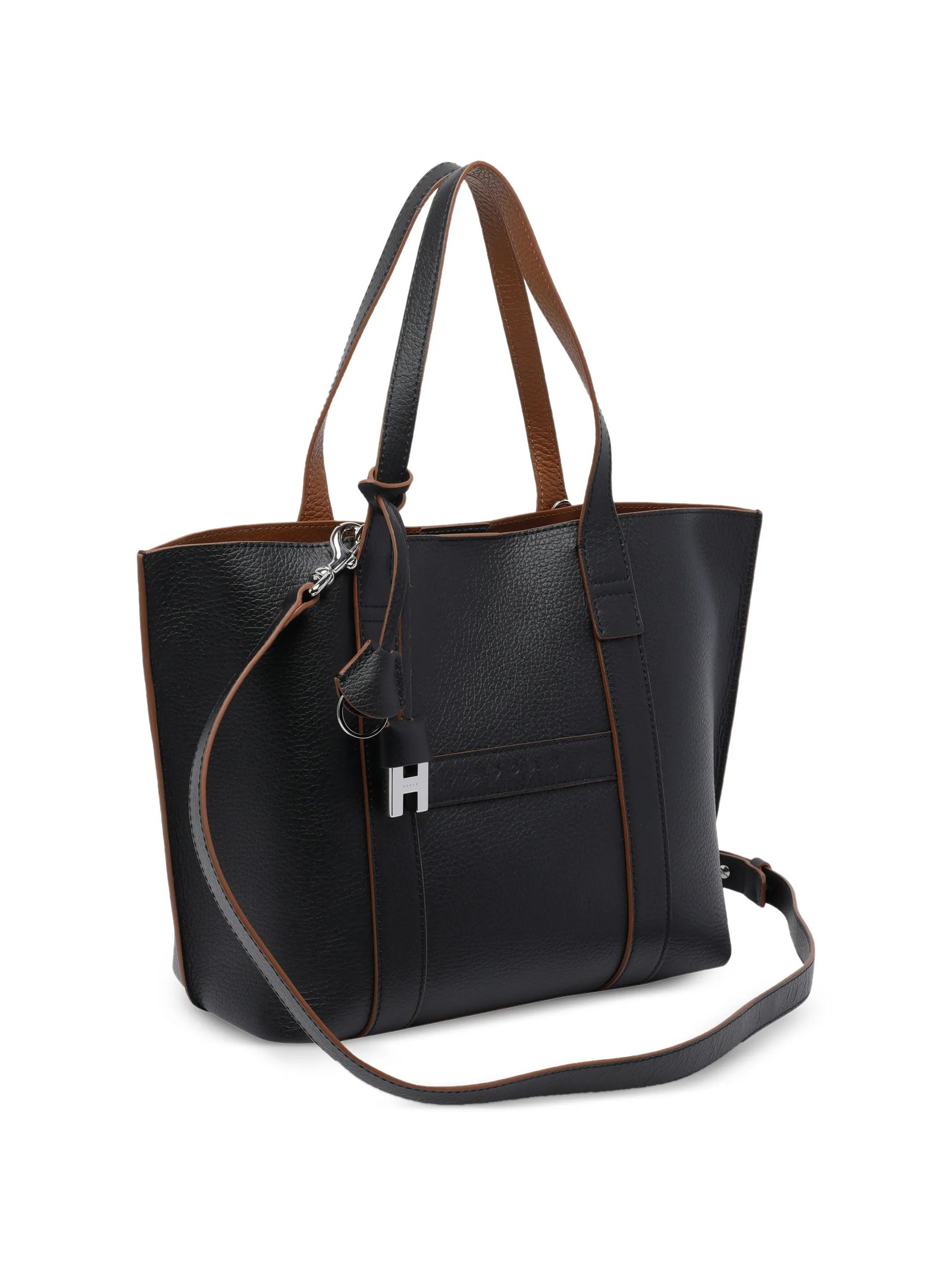 Hogan Script Shopping Bag Small Black, Item crafted in leather, Stamped Hogan logo, Dimensions: 35 x 23 x 11 cm, Fixed handles, Adjustable and removable shoulder strap, Magnetic button closure, Removable zipped pouch