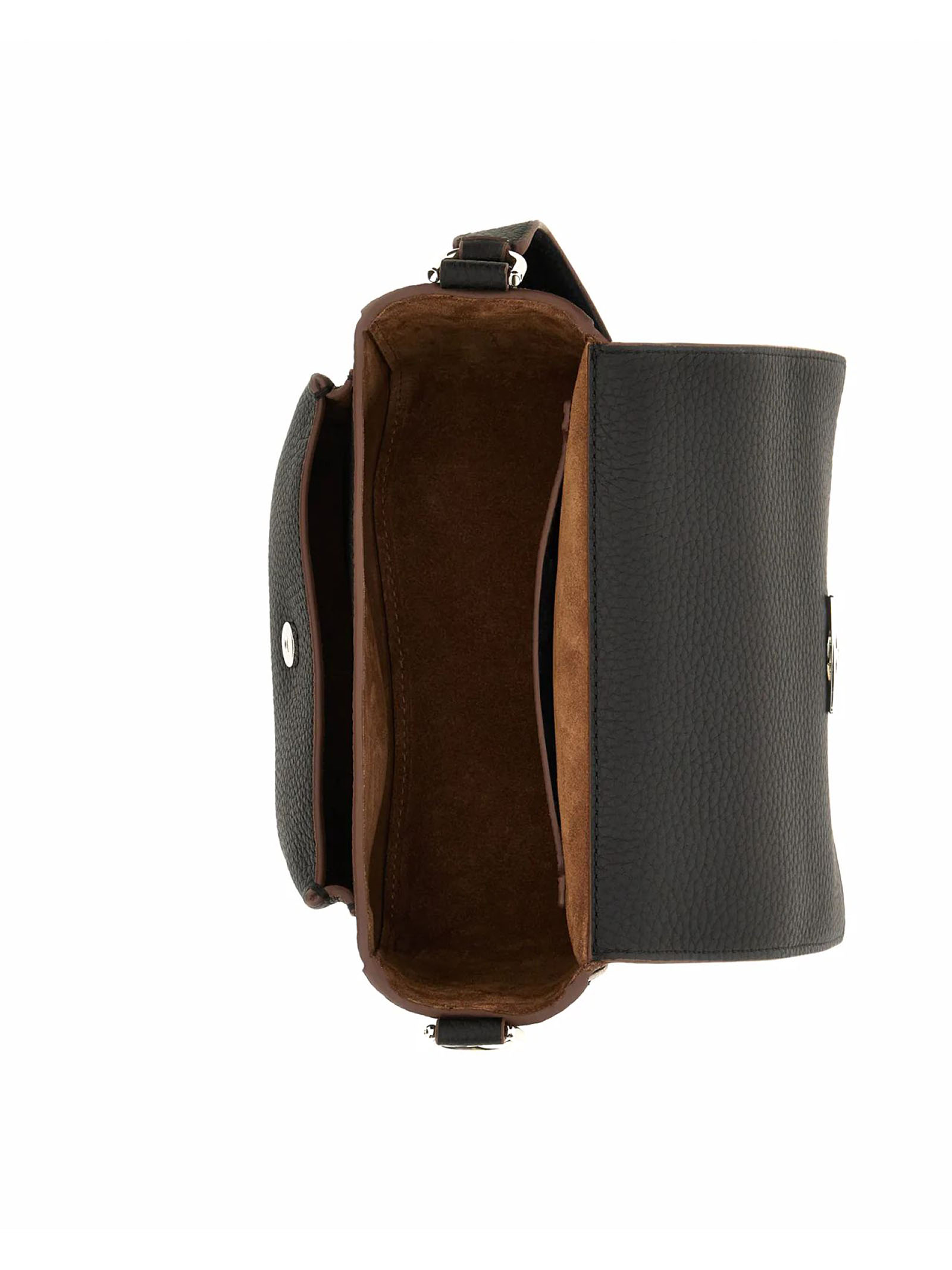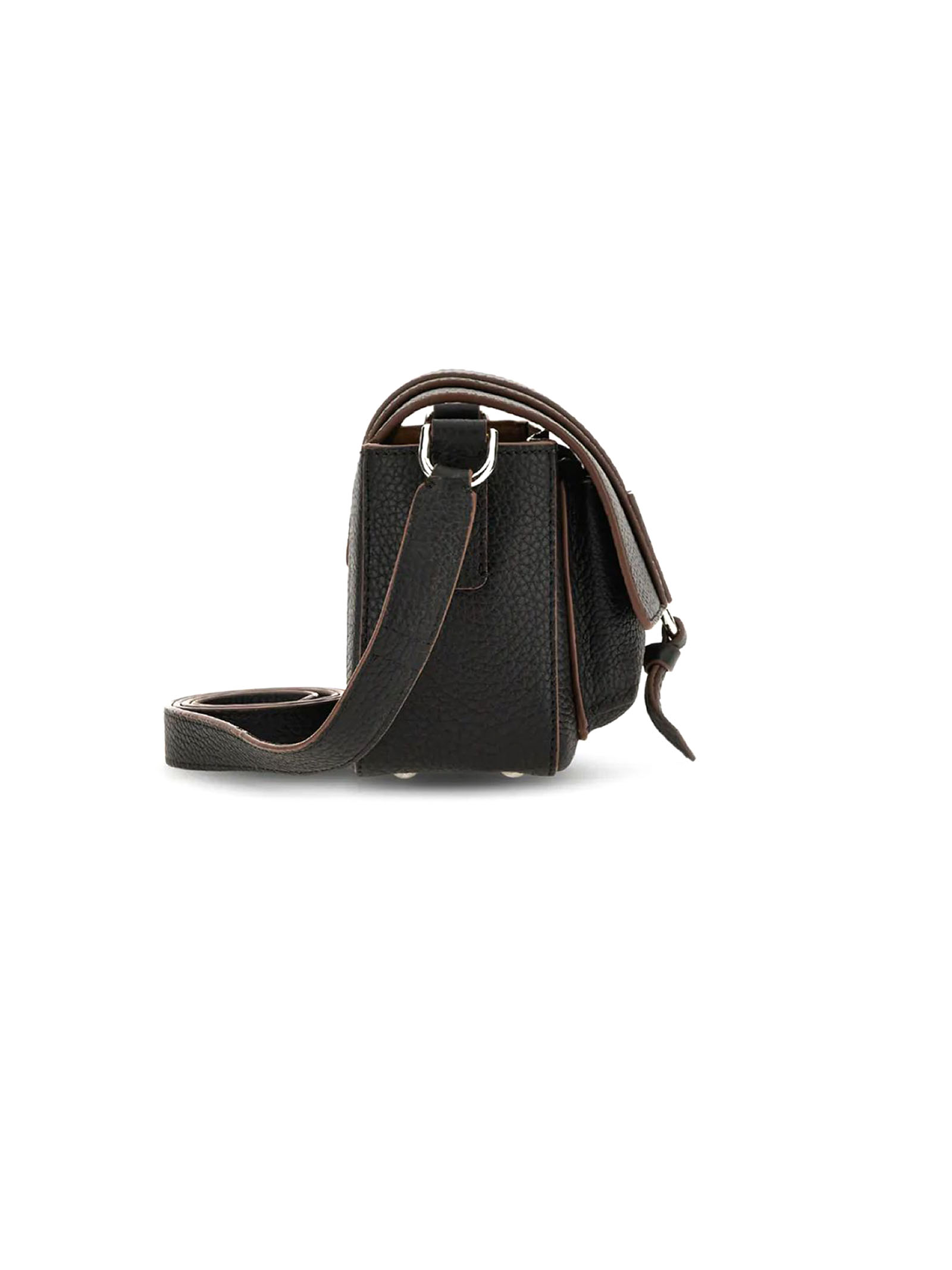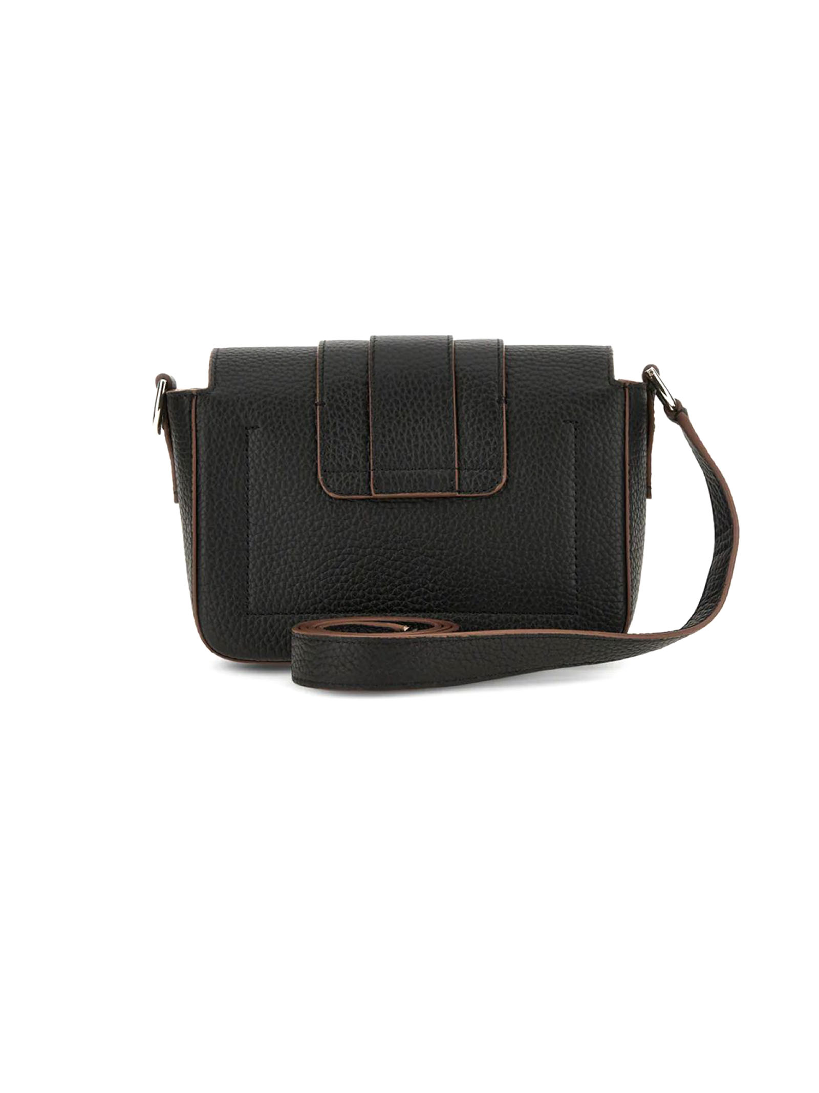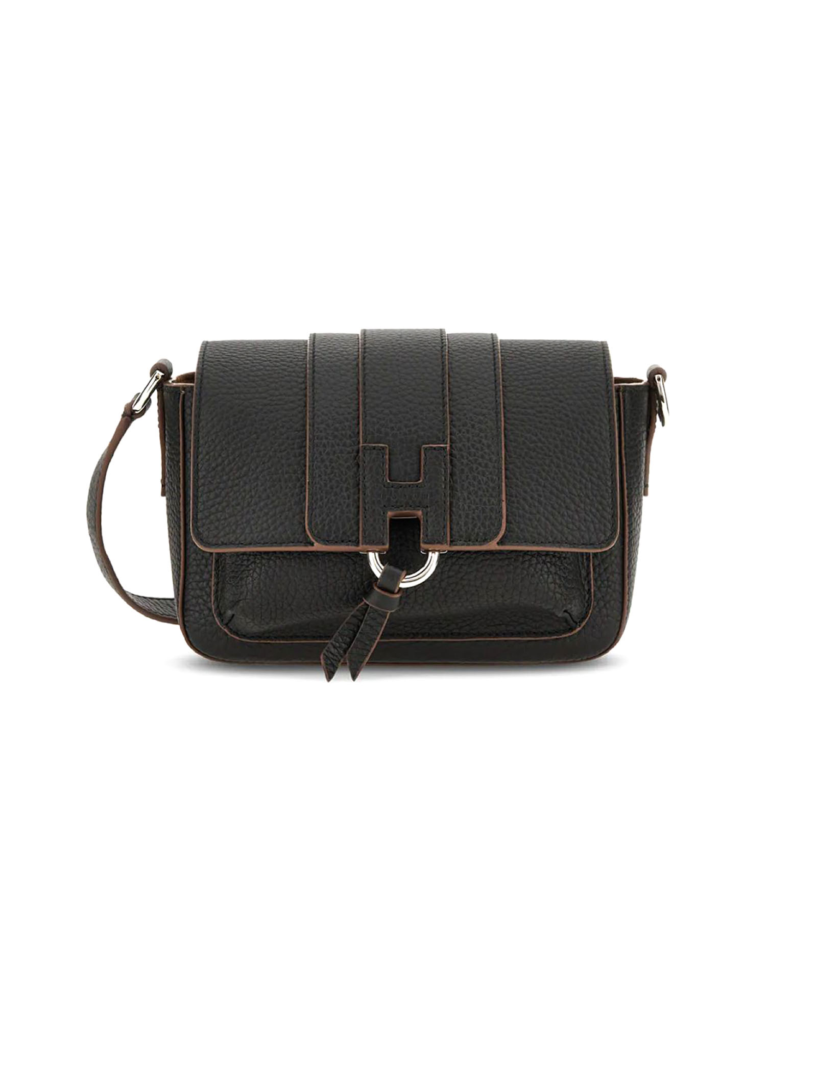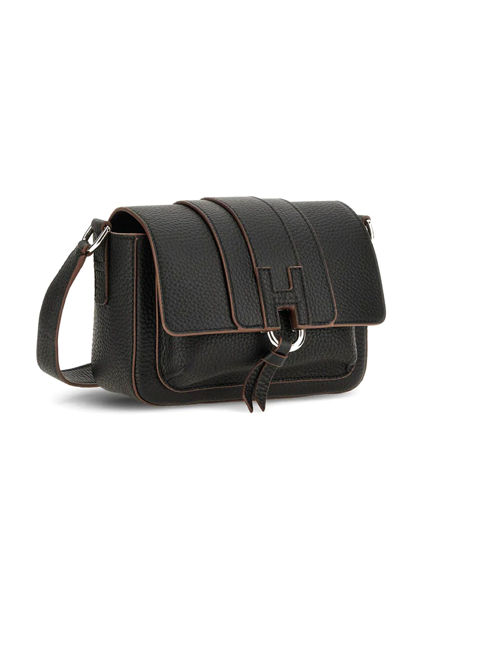 Hogan Trend Flap bag Black, Item crafted in hammered leather, Semi-concealed front pocket, Flap and magnetic button closure, Embossed H with stamped Hogan logo, Dimensions: 20 x 12 x 7.5 cm, Versatile shoulder strap, Internal pocket, Metal feet