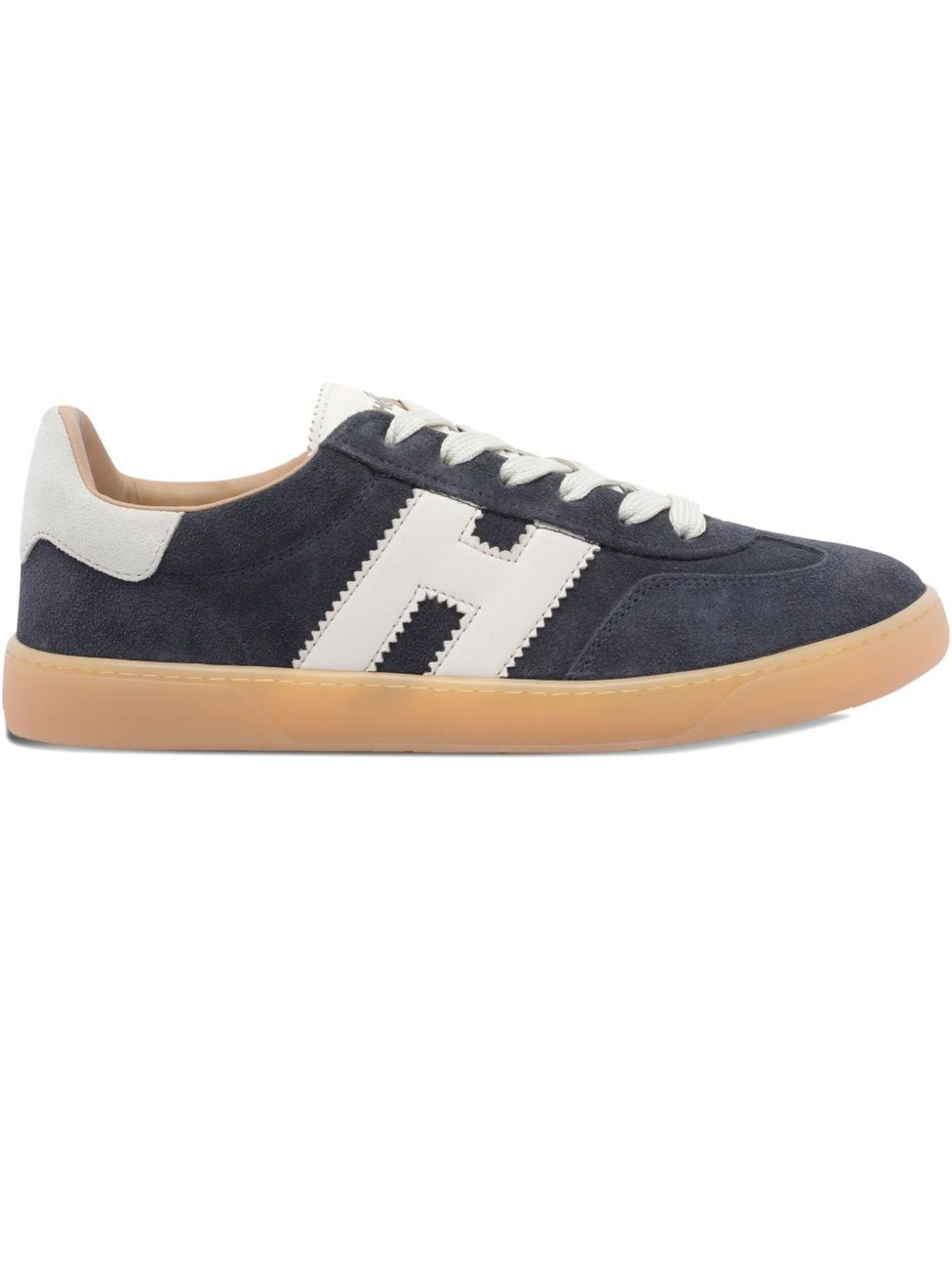 dark blue suede lace-up closure round toe rubber sole H logo patch