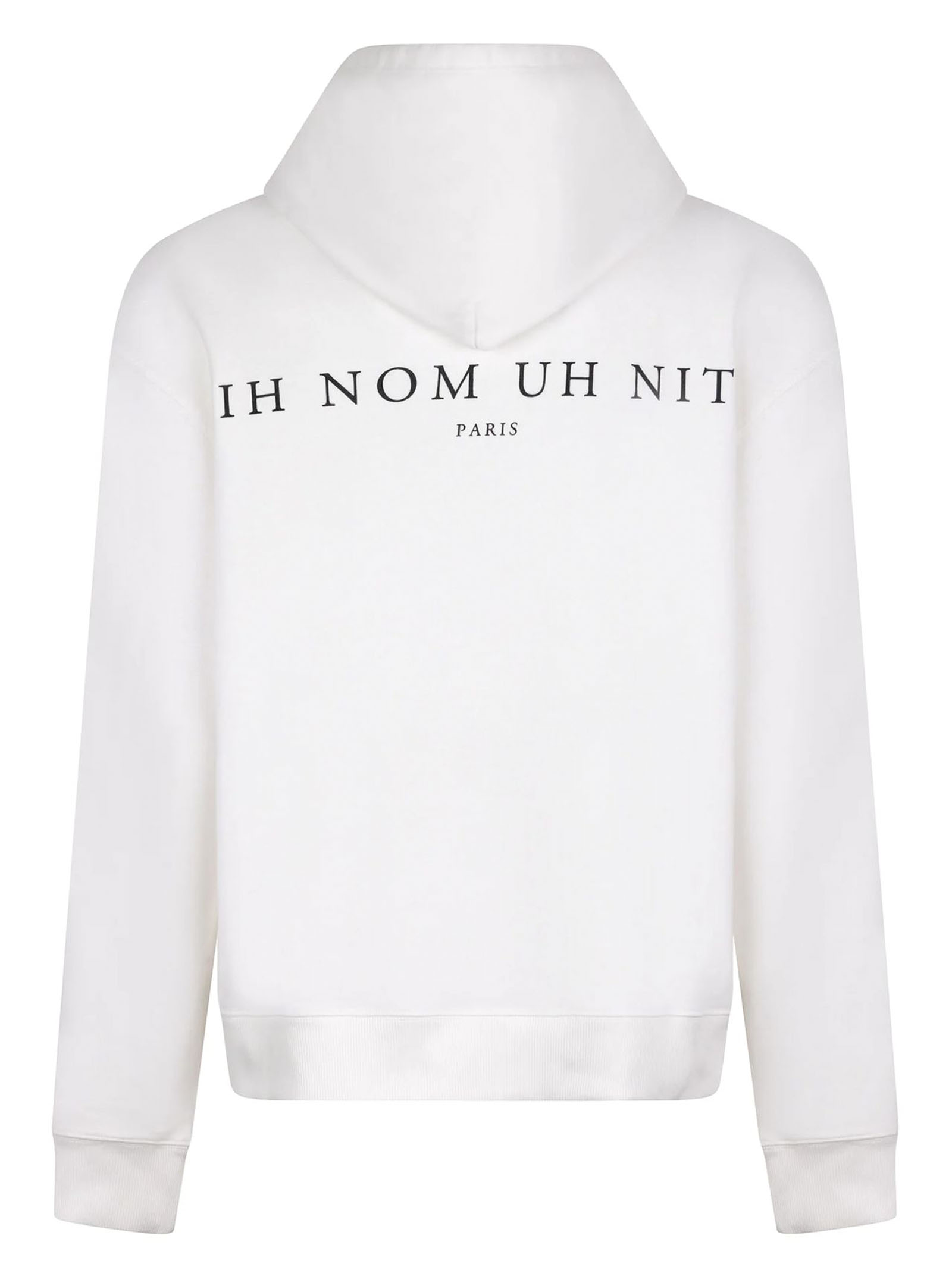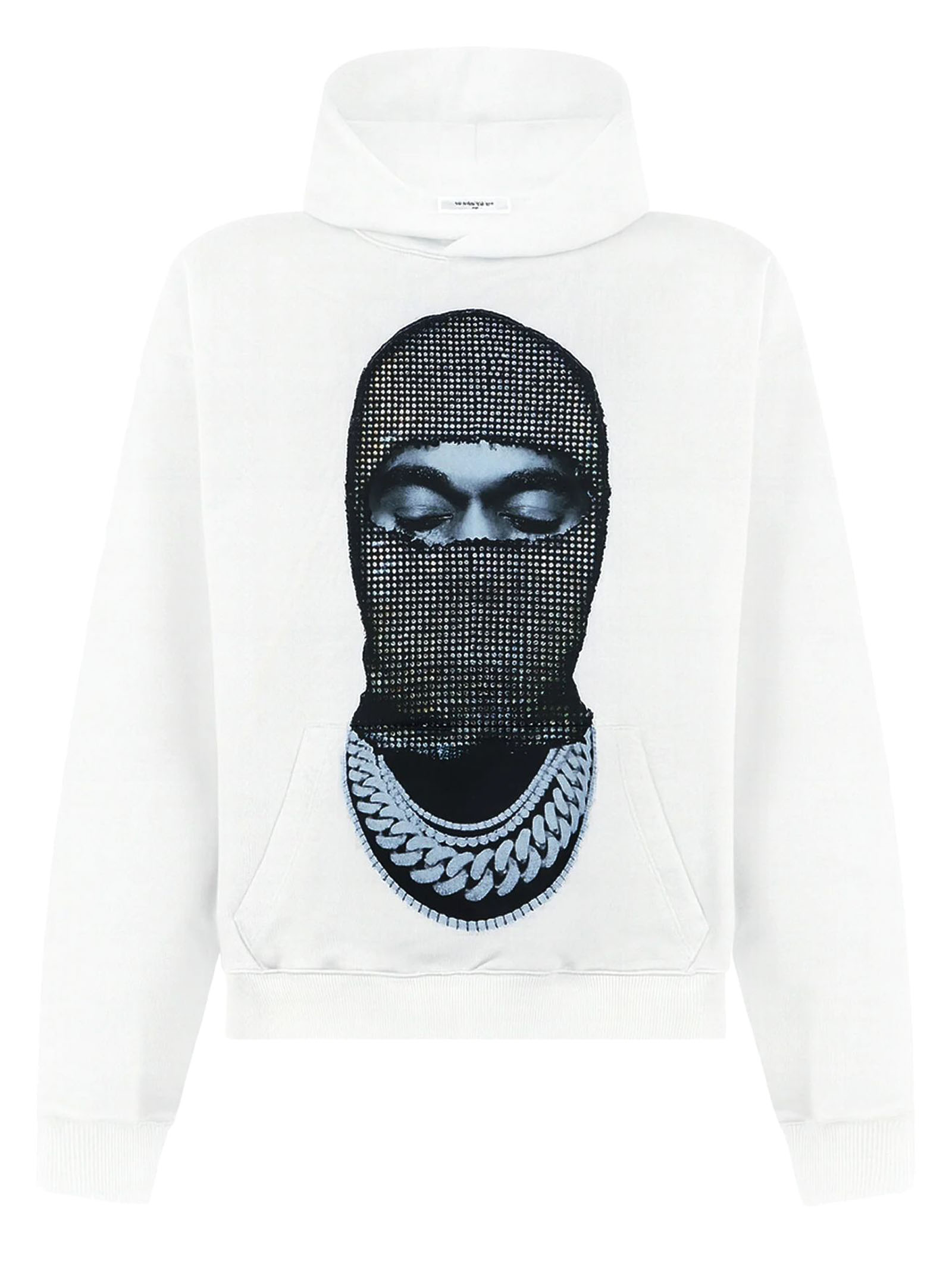 Diamond Mask print Hoodie, White hoodie featuring a bold diamond-studded mask print with chain detail on the chest, Relaxed fit with ribbed cuffs and hem for comfort, IH NOM UH NIT Paris logo printed in contrasting black, Adjustable hood, kangaroo pocket, long sleeves, premium graphic placement, White with black print