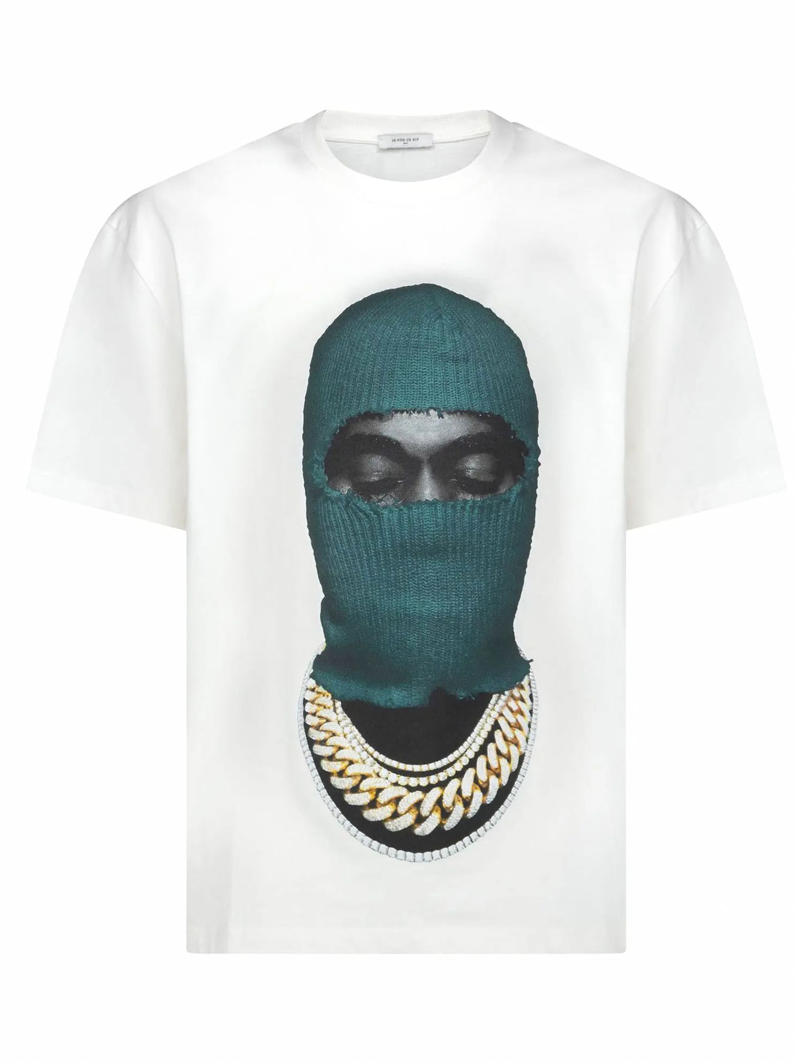 Green Mask20 T-shirt, Mask in green with intricate details, paired with chain accents for a striking aesthetic, "IH NOM UH NIT Paris" branding for a clean and sophisticated finish, Regular Fit