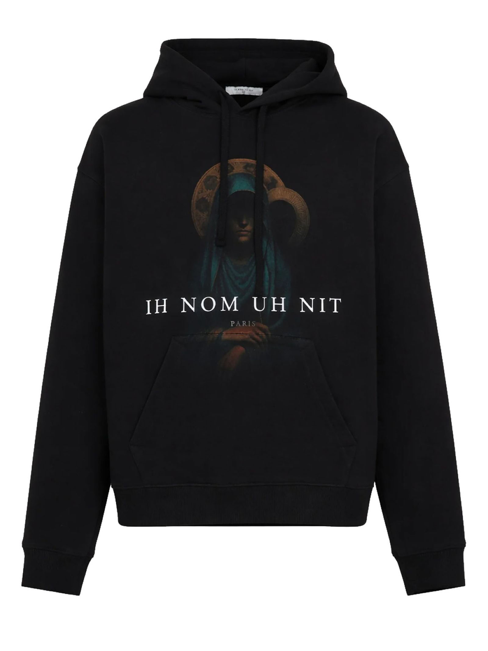 Holy Mary Print Hoodie, combined with IH NOM UH NIT Paris lettering for a strong visual impact, Regular fit hoodie with relaxed proportions, designed for everyday wear, Clean back with no additional graphics, keeping the focus on the front print, Adjustable drawstring hood, ribbed cuffs and hem, front kangaroo pocket