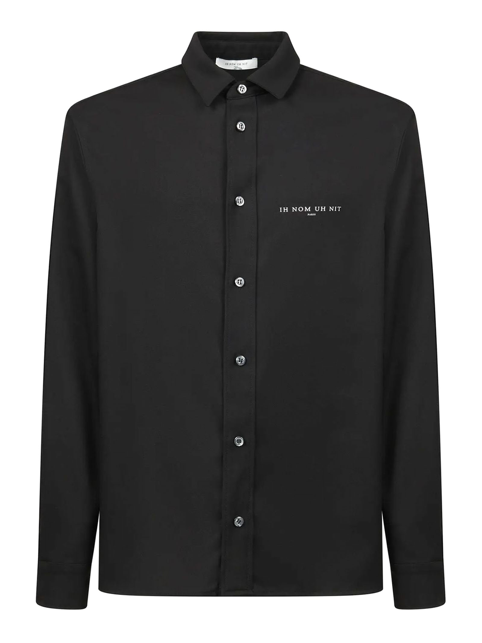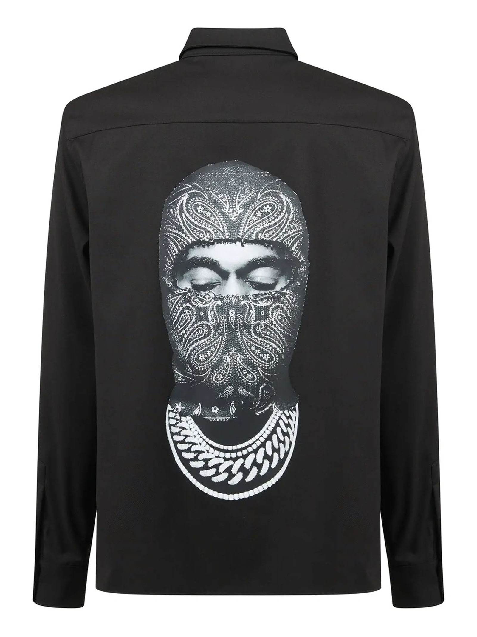 Long Sleeve Shirt with Mask on the Back, Minimal design with a small IH NOM UH NIT PARIS logo printed on the left chest, Regular fit with a structured silhouette, buttoned cuffs, and a classic shirt collar, Striking monochrome graphic of a masked face adorned with paisley details and layered chain necklaces, Full front button closure, tonal stitching, and refined shirt construction for a clean look, Black base with contrast white and grey print