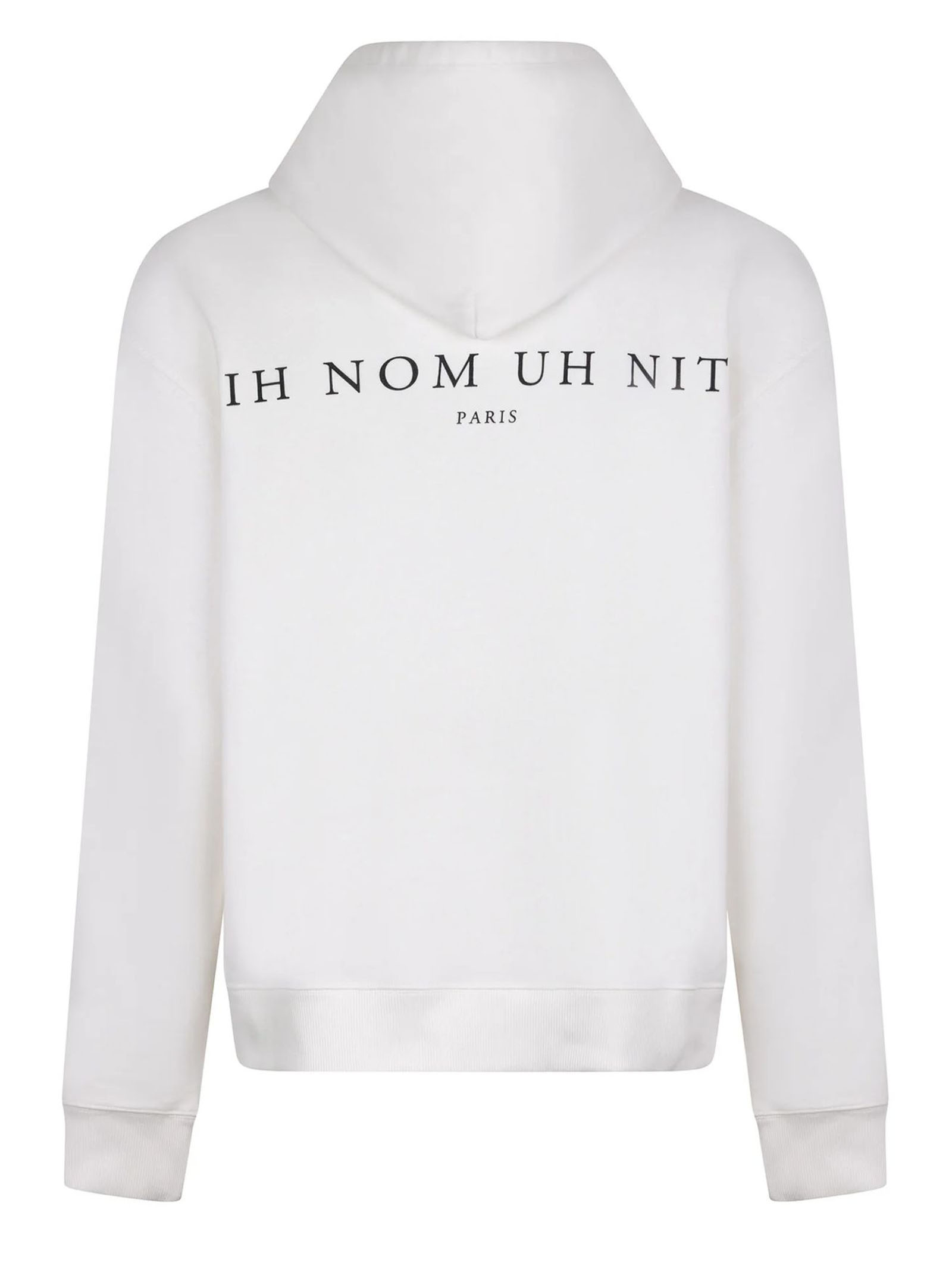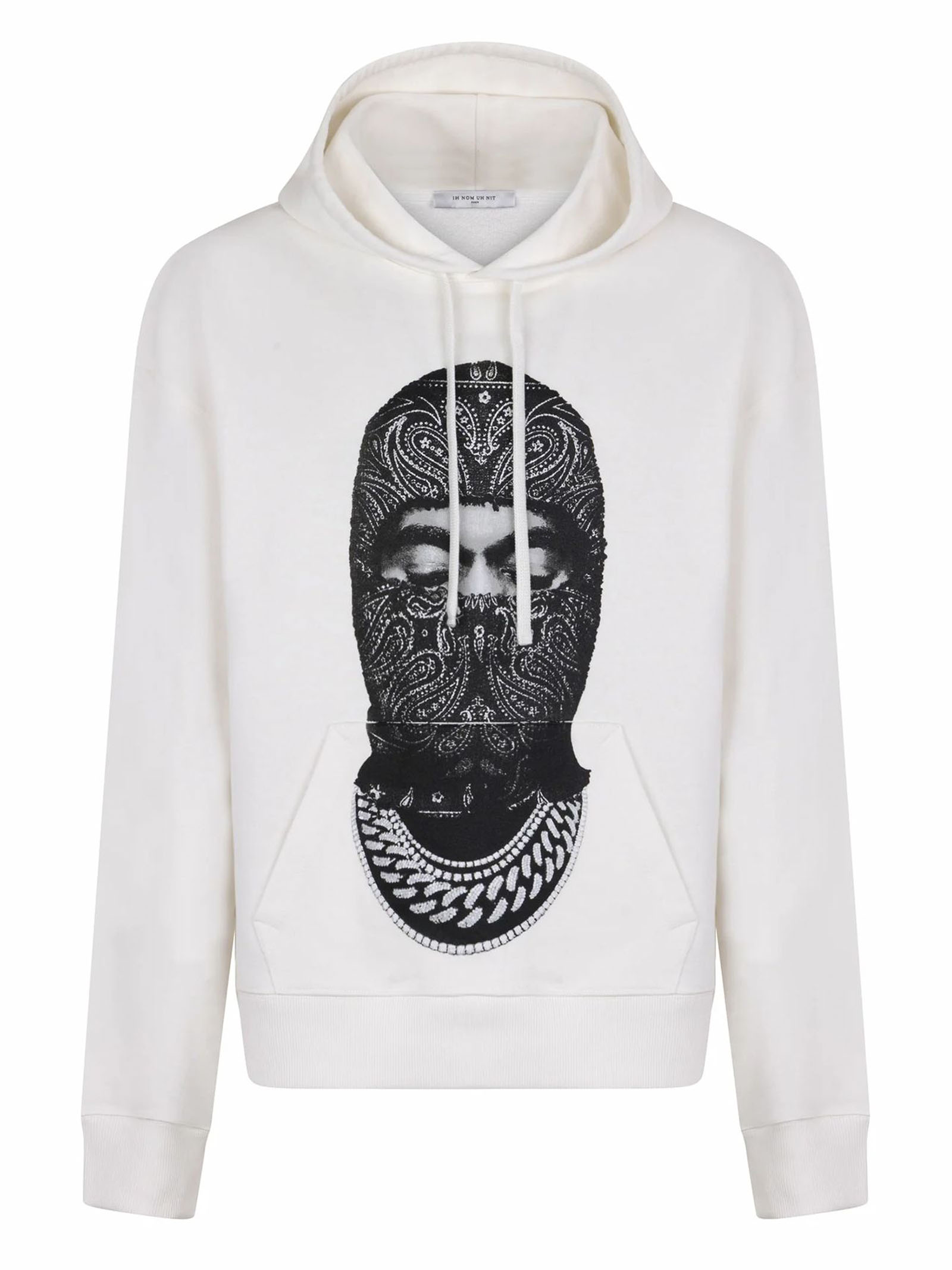 Paisley Mask Hoodie, Bold graphic of a face covered with a paisley-pattern mask and chain detail print, Regular fit with dropped shoulders and straight hem, Contrasting IH NOM UH NIT PARIS logo across the upper back, Adjustable drawstring hood, kangaroo pocket, ribbed cuffs and hem, White with white and grey graphic details