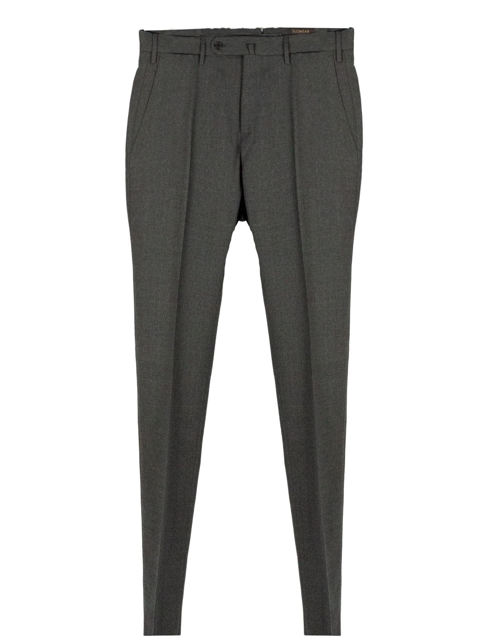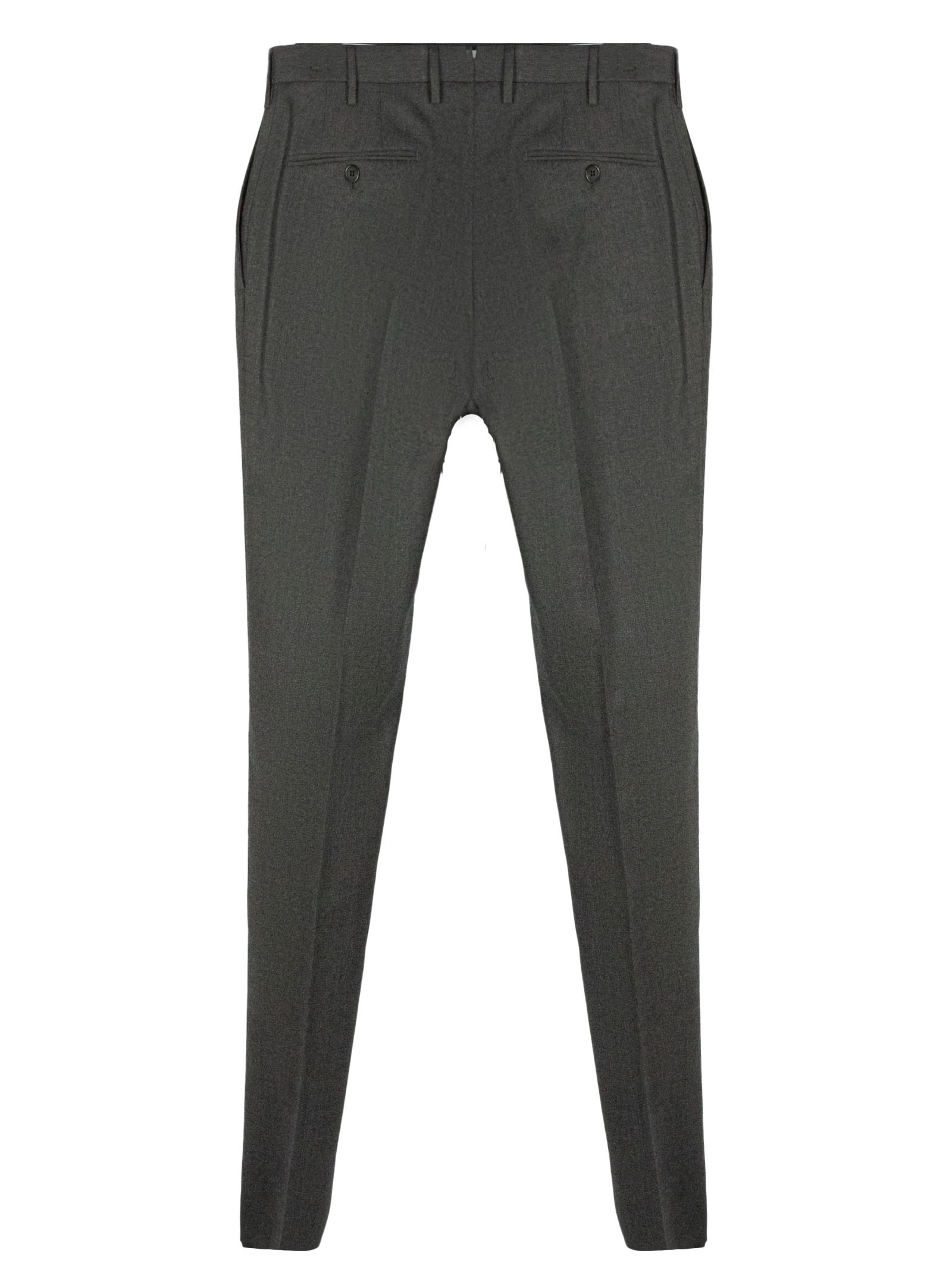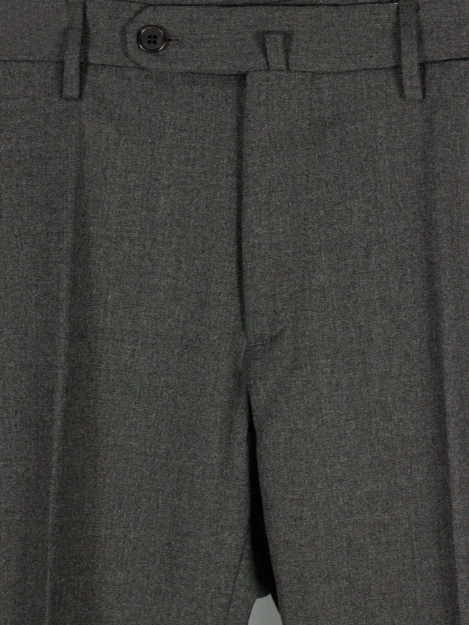 Dark grey wool blend trousers with pleats, front zip and button fastening, belt loops, side pockets, back pockets